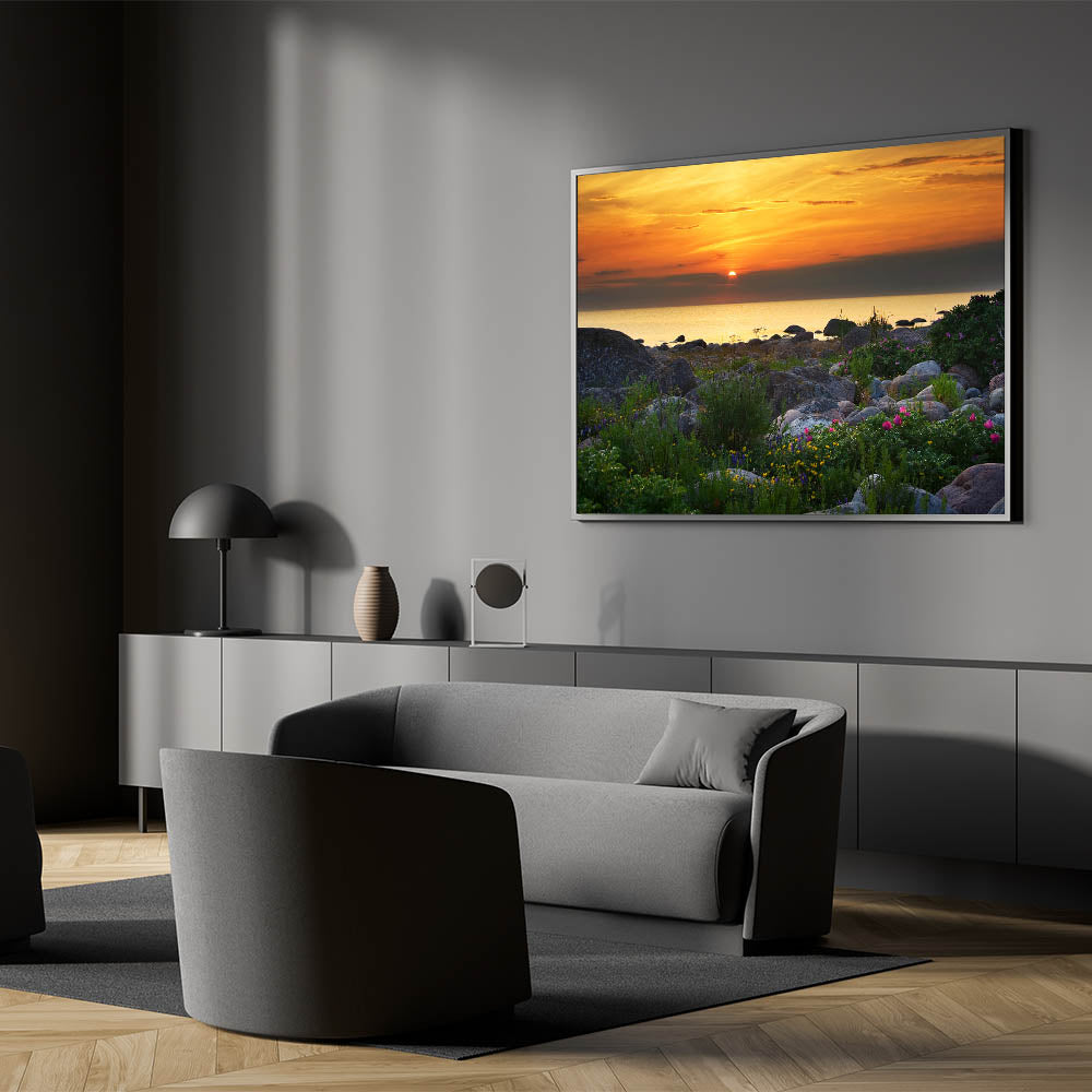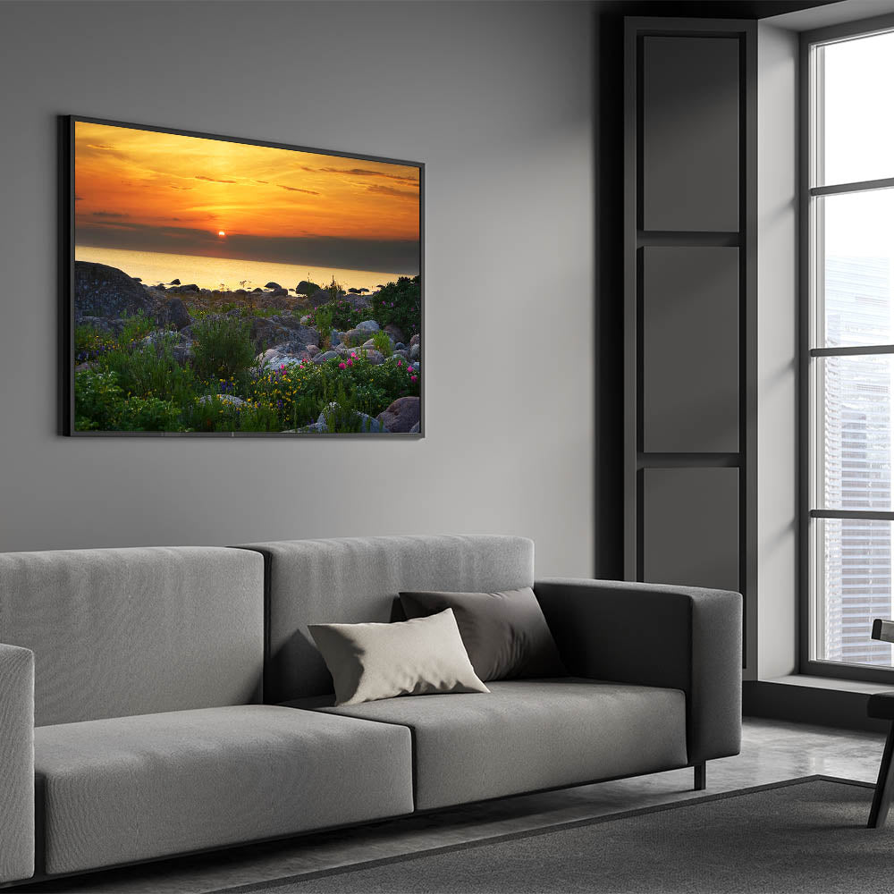 Capture the tranquil beauty of the Baltic Sea coastline with this stunning wall art, featuring a breathtaking sunset over a rocky shore in Estonia. The vibrant hues of the setting sun cast a warm glow over the serene landscape, creating a peaceful ambiance that brings nature into your home. This exquisite piece is perfect for lovers of scenic Estonia and Northern European beauty.