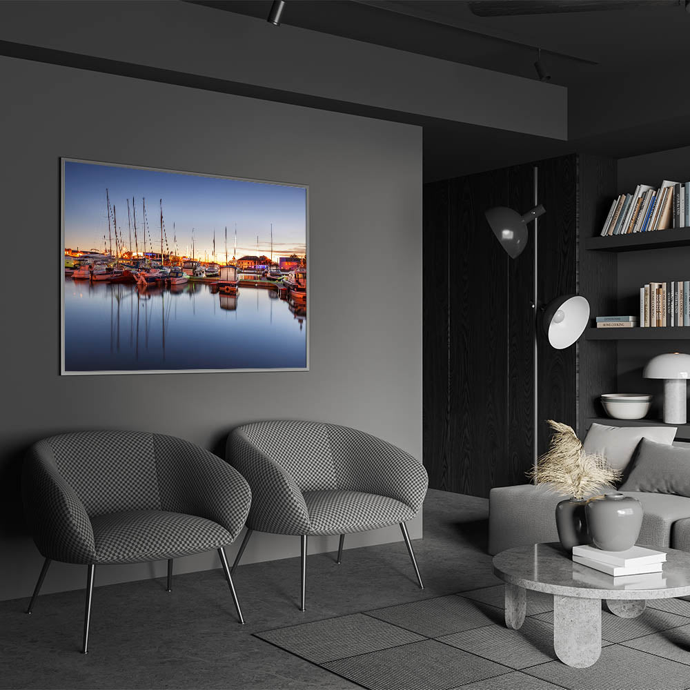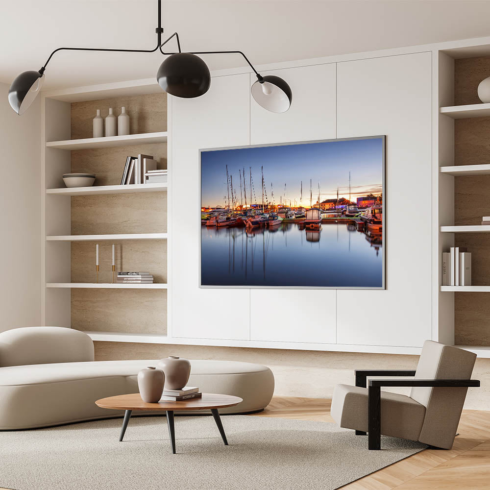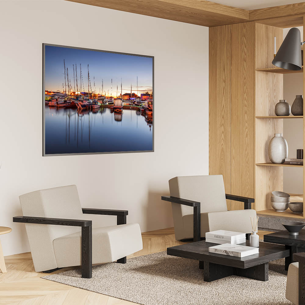 - High-resolution print ensures every detail of the sunset and marina is perfectly rendered.
