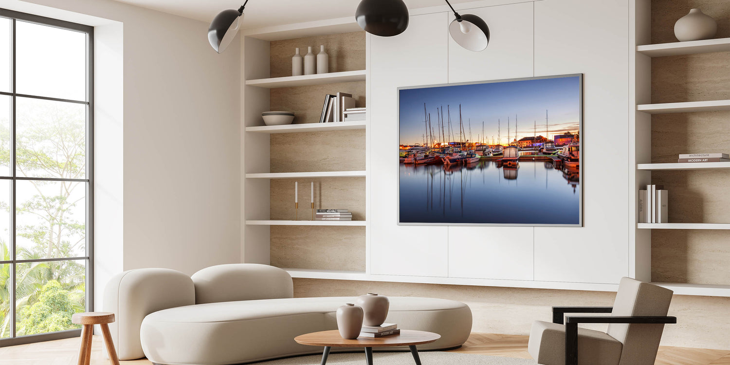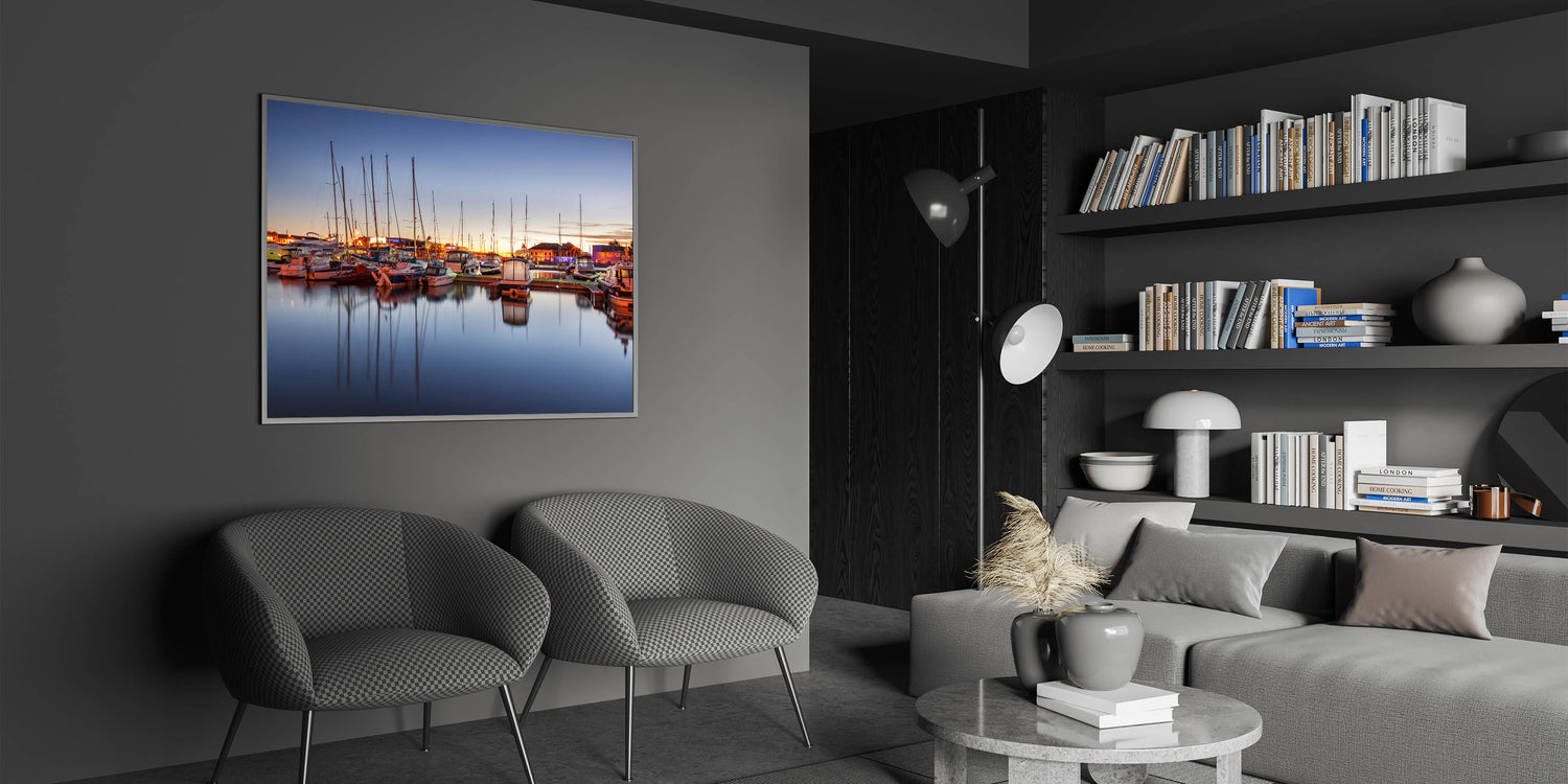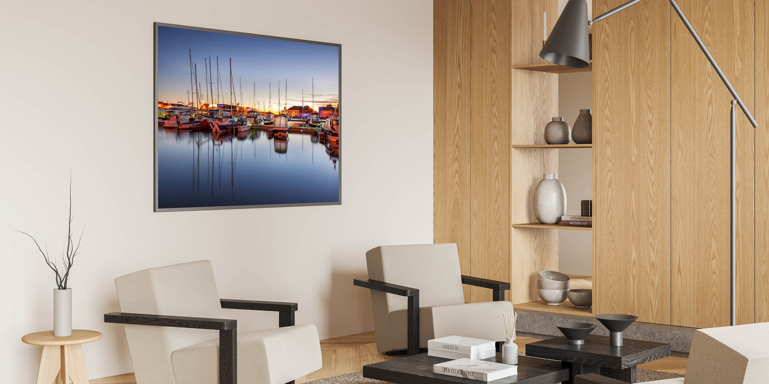 - High-resolution print ensures every detail of the sunset and marina is perfectly rendered.