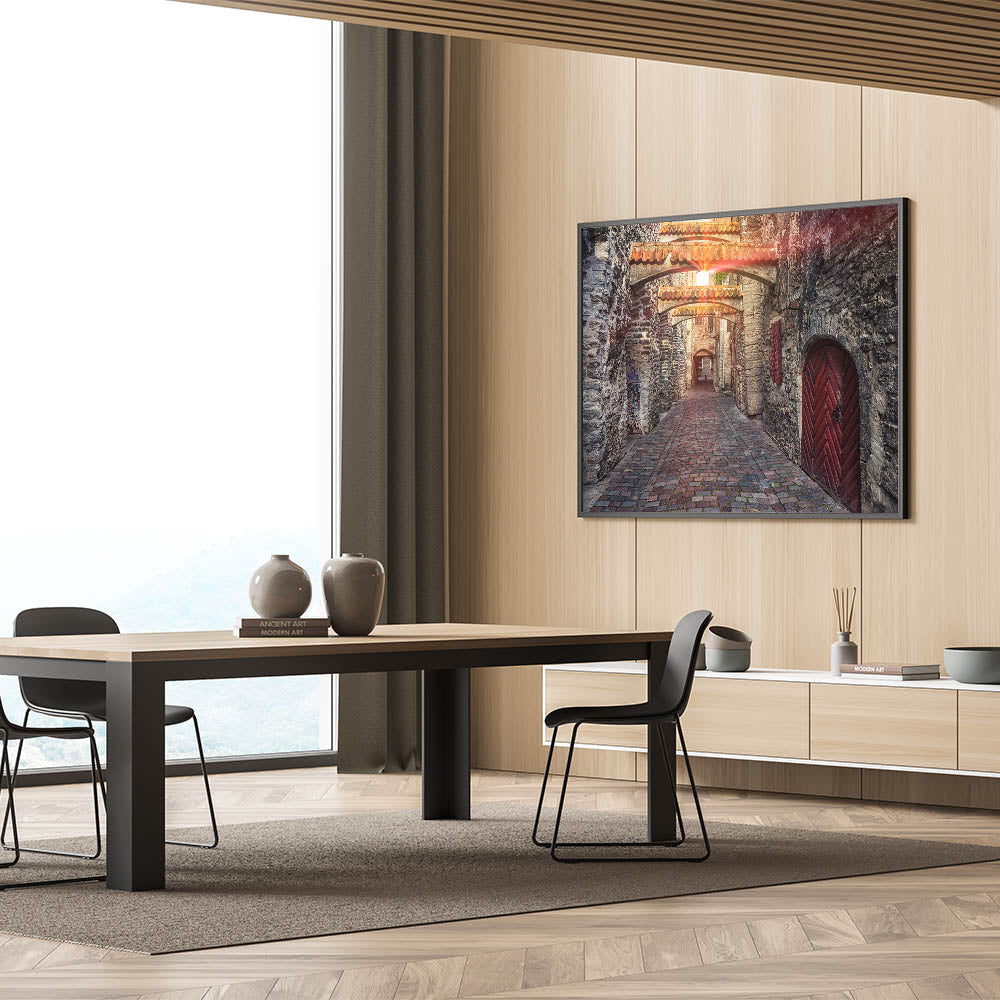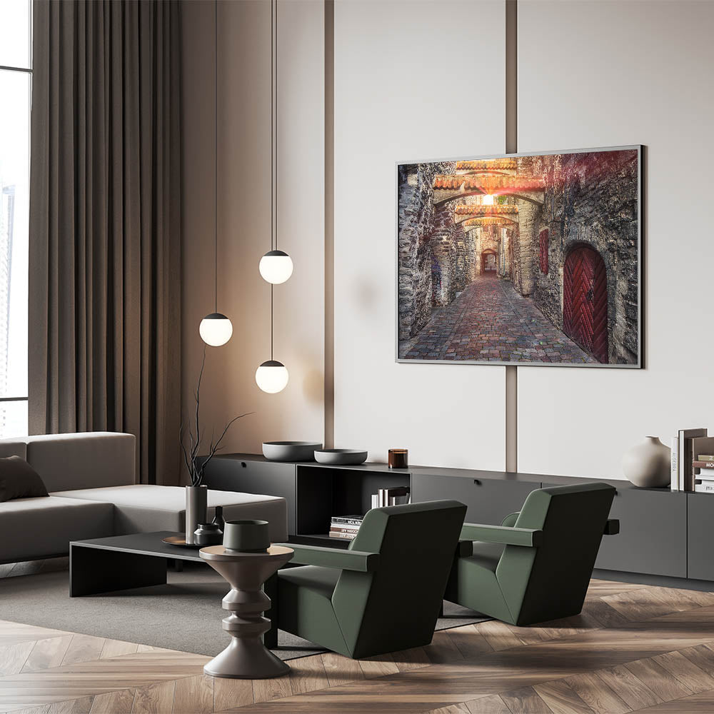 Step back in time with this captivating wall art, featuring a medieval alley in Tallinn’s Old Town. The rustic stone walls and cobblestone path are beautifully illuminated by the warm rays of the sun, creating a peaceful yet mysterious atmosphere. This artwork perfectly captures the essence of Estonia’s architectural history and charm, making it an excellent addition to any space.