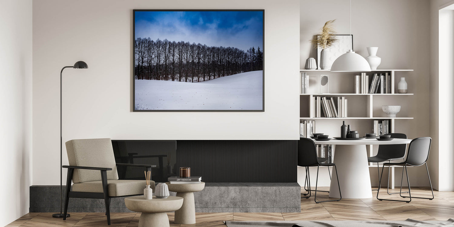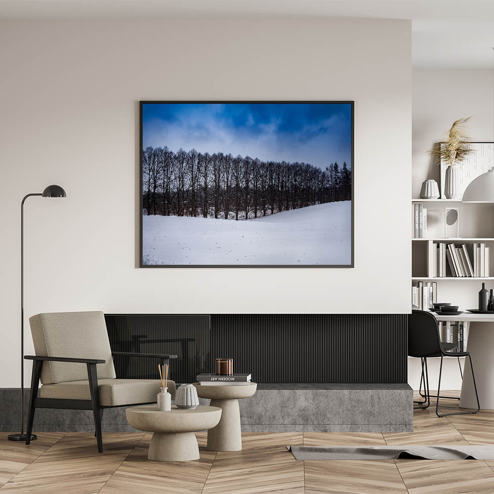 This stunning piece of Estonian landscape art captures a peaceful, snow-covered winter scene, with a line of bare trees standing against the cold blue sky. The simplicity and quiet beauty of the winter landscape evoke a sense of calm and reflection, making it a perfect addition to any space seeking a serene and minimalist atmosphere. Part of the "Estonia Scenery By Region" collection, this artwork brings the tranquility of Northern Europe’s winters into your home.