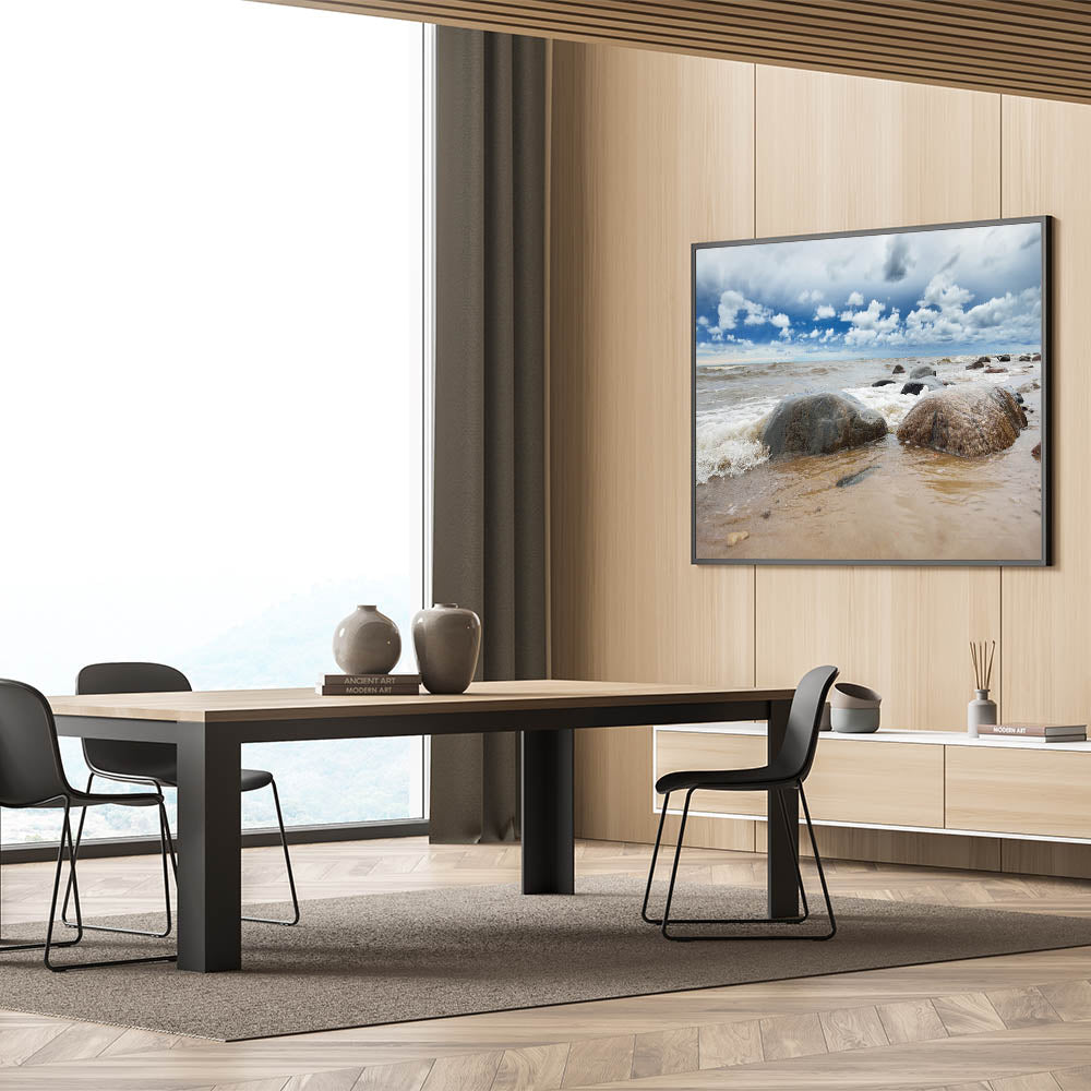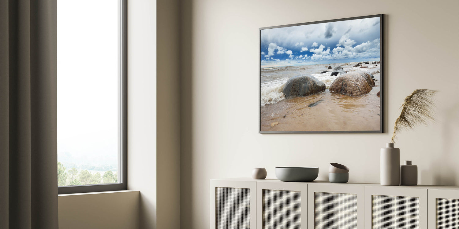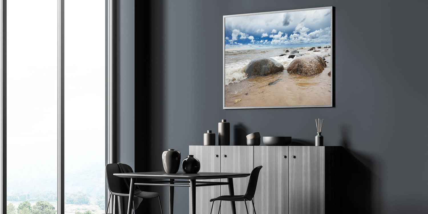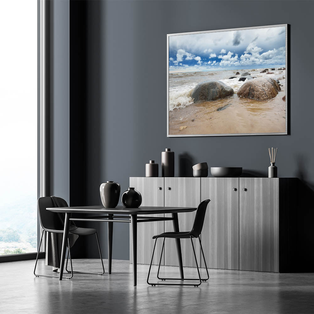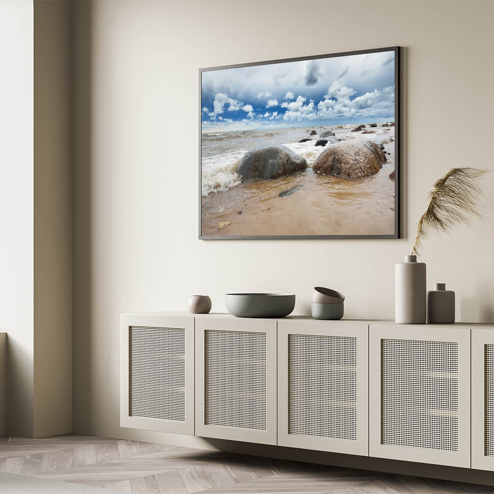 • High-resolution printing ensures vivid colors and details of the rocky shore and clouds.