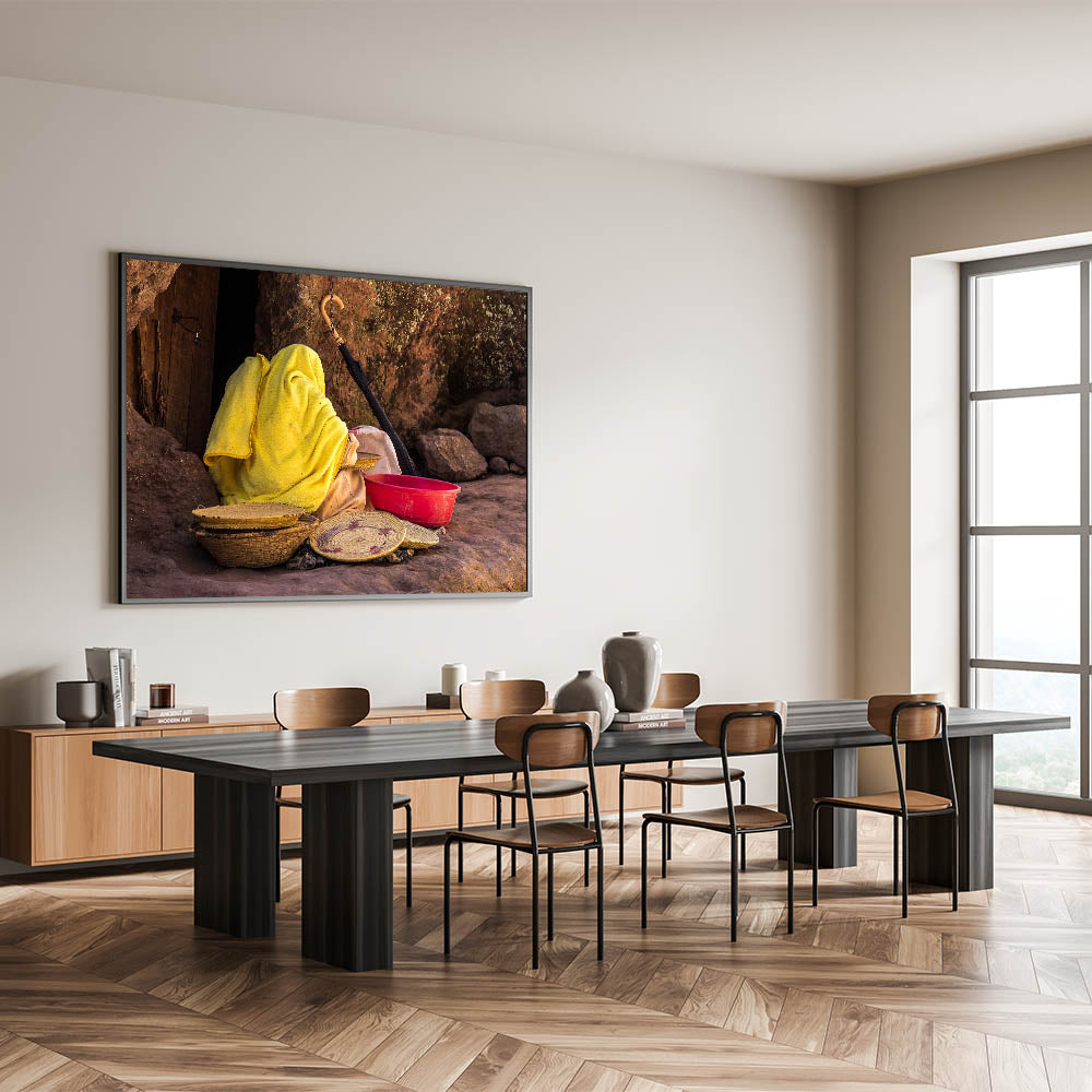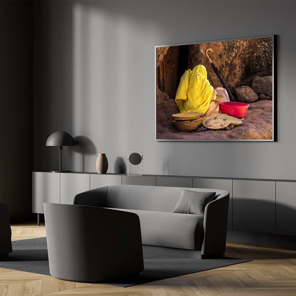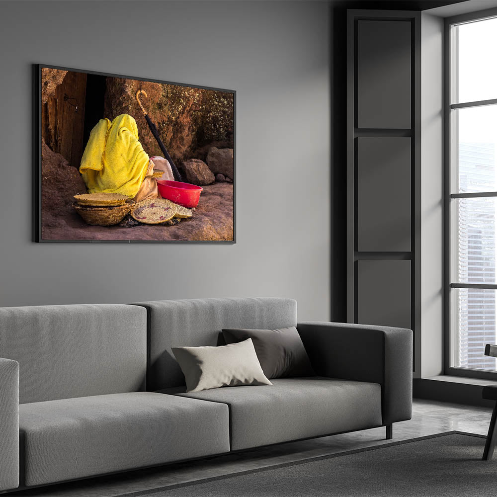 Immerse yourself in the rich cultural heritage of Ethiopia with this evocative wall art featuring a traditional Ethiopian monk surrounded by handmade woven baskets. The vibrant yellow cloak of the monk contrasts beautifully with the earthy tones of the surrounding rocks and the bright red basin, creating a visually striking composition that celebrates Ethiopian craftsmanship and spirituality. This piece is a perfect representation of Ethiopian heritage, bringing a touch of African culture into your home.