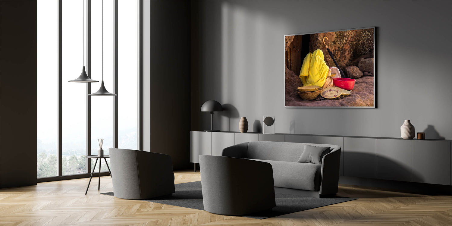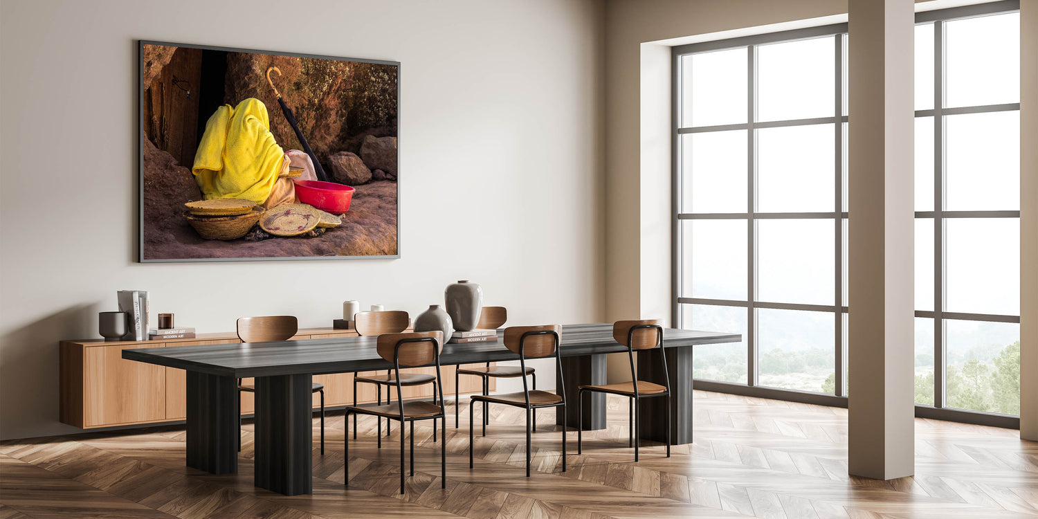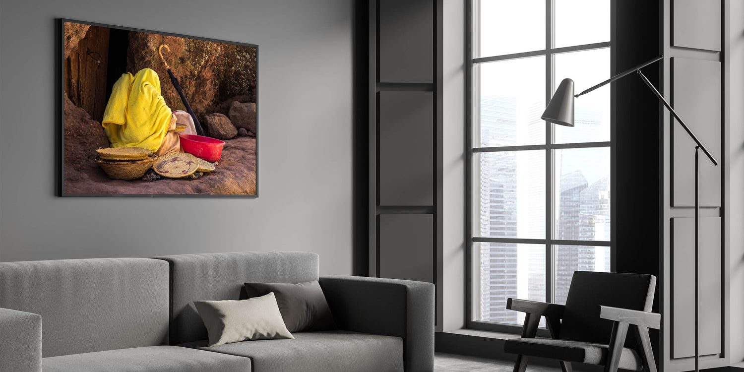 Immerse yourself in the rich cultural heritage of Ethiopia with this evocative wall art featuring a traditional Ethiopian monk surrounded by handmade woven baskets. The vibrant yellow cloak of the monk contrasts beautifully with the earthy tones of the surrounding rocks and the bright red basin, creating a visually striking composition that celebrates Ethiopian craftsmanship and spirituality. This piece is a perfect representation of Ethiopian heritage, bringing a touch of African culture into your home.