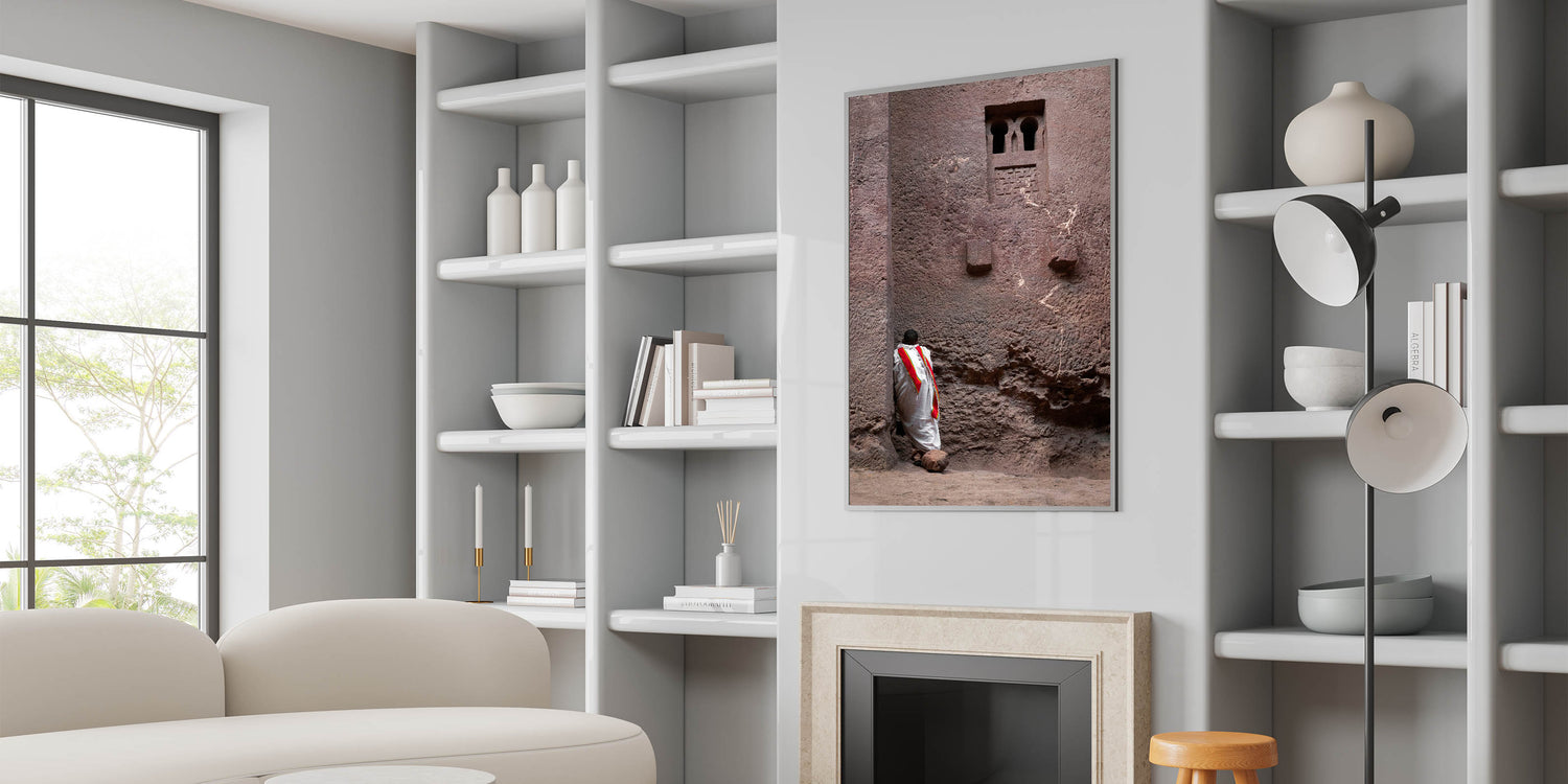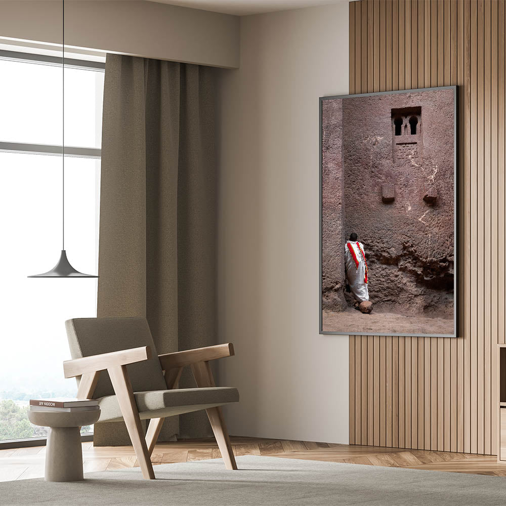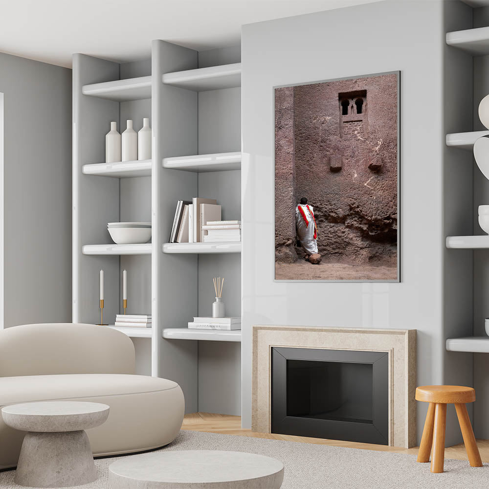 Immerse yourself in the deep spirituality and ancient traditions of Ethiopia with this powerful wall art featuring a monk in prayer within a rock-hewn church. This artwork captures the solemn devotion of Ethiopian Christianity, with the monk standing against the backdrop of intricately carved stone, symbolizing centuries of faith and dedication. The vivid red and gold accents of the monk's robe contrast beautifully with the earthy tones of the rock, creating a striking visual narrative that speaks to the heart of Ethiopian heritage.