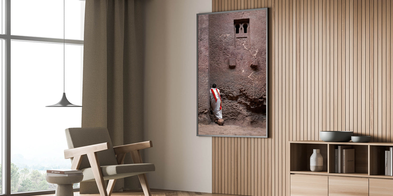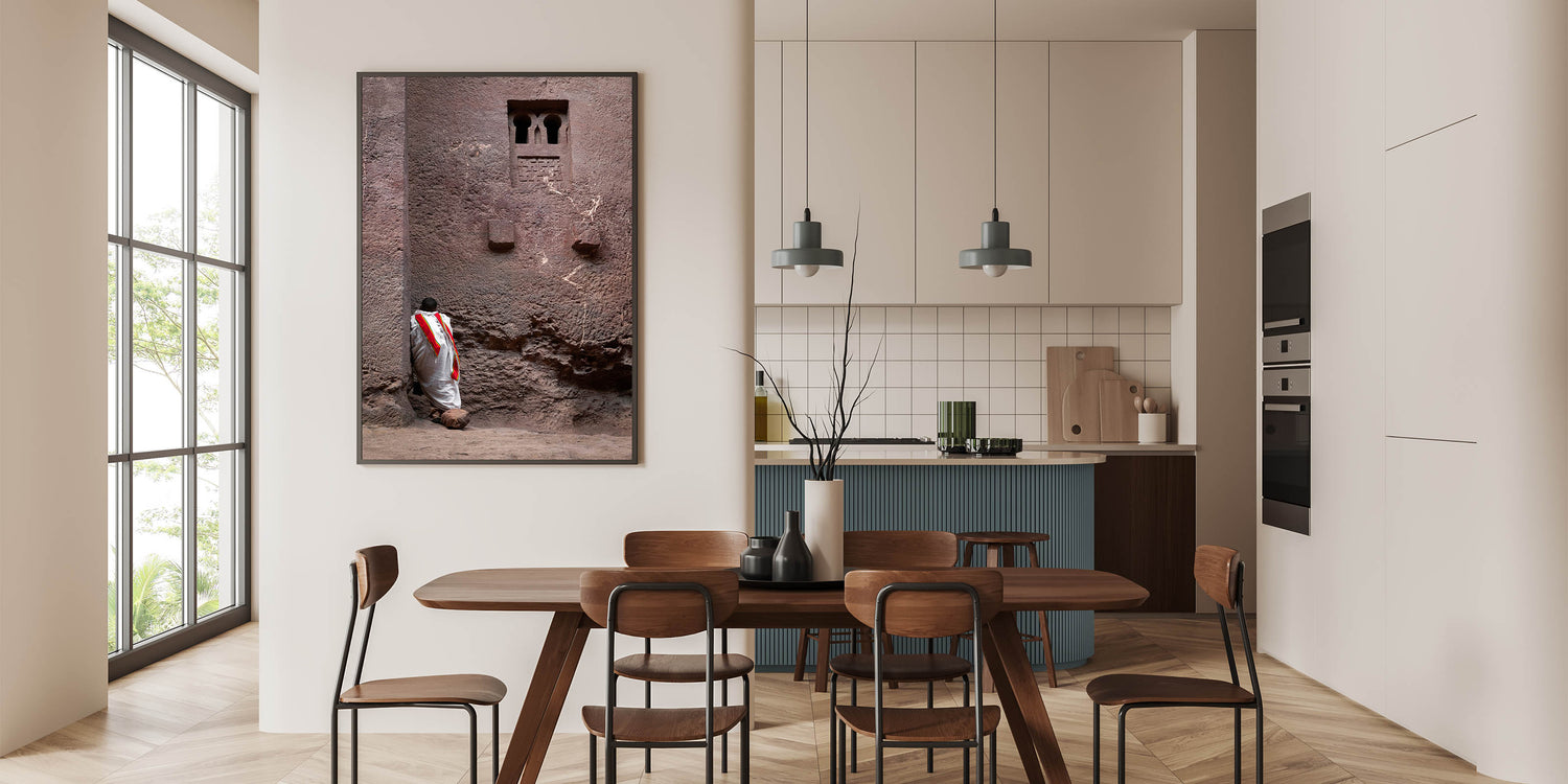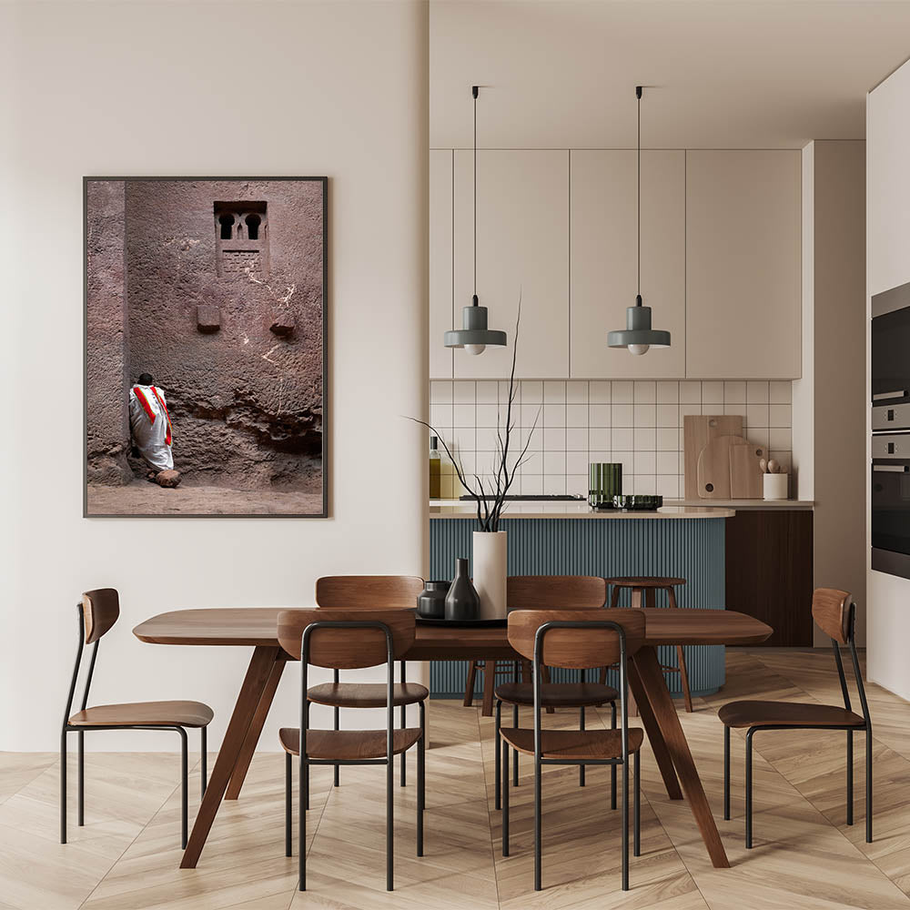 Immerse yourself in the deep spirituality and ancient traditions of Ethiopia with this powerful wall art featuring a monk in prayer within a rock-hewn church. This artwork captures the solemn devotion of Ethiopian Christianity, with the monk standing against the backdrop of intricately carved stone, symbolizing centuries of faith and dedication. The vivid red and gold accents of the monk's robe contrast beautifully with the earthy tones of the rock, creating a striking visual narrative that speaks to the heart of Ethiopian heritage.