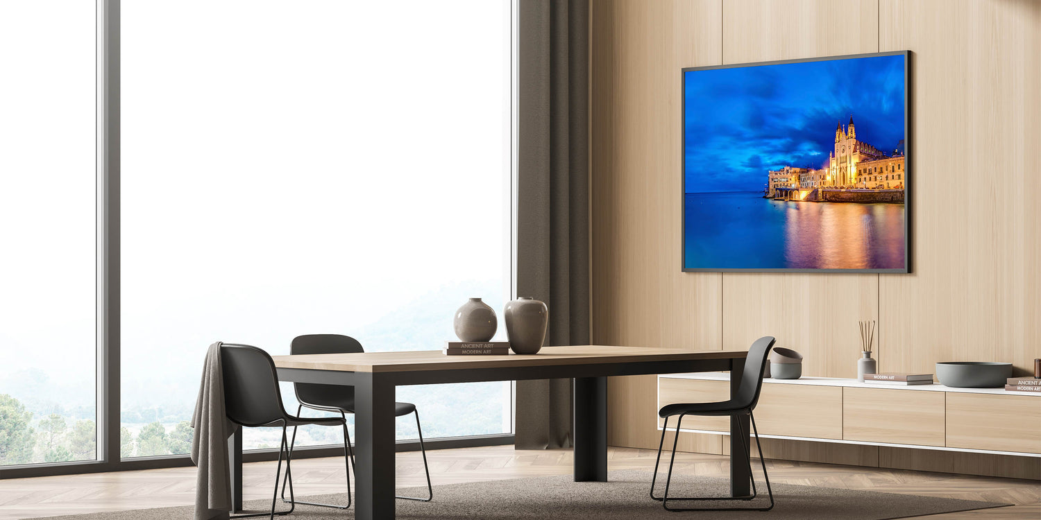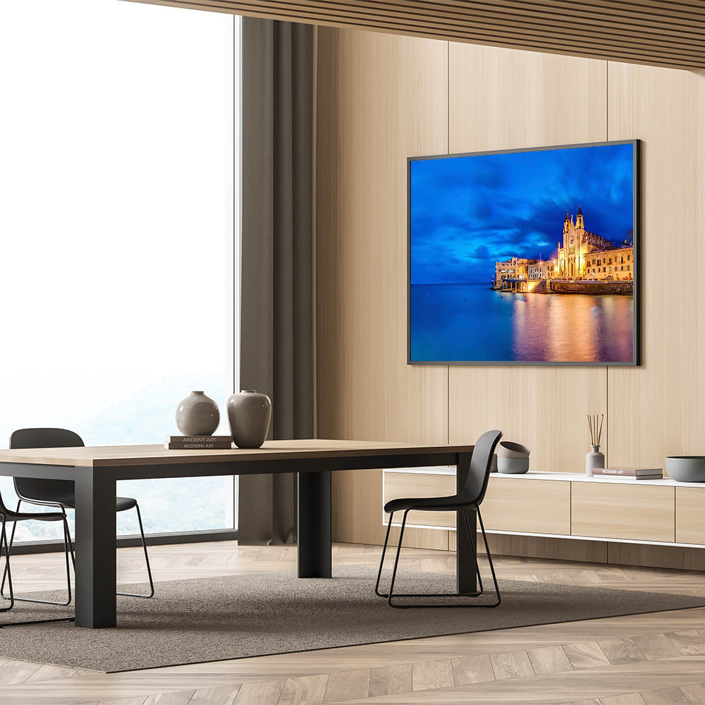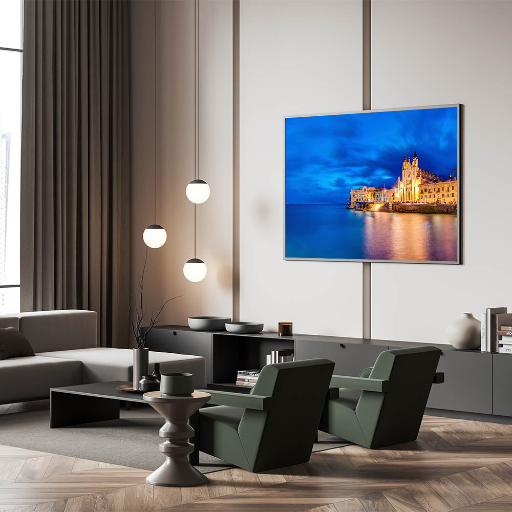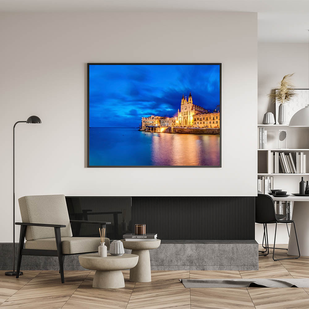 Capture the captivating beauty of Malta’s evening coastal cityscape with this mesmerizing wall art. The deep blue hues of the Mediterranean sea and sky meet the illuminated historic architecture, creating a breathtaking scene that reflects the enchanting charm of this European coastal city. Perfect for adding sophistication and a sense of calm to any room, this piece is ideal for lovers of Malta Scenic Art.