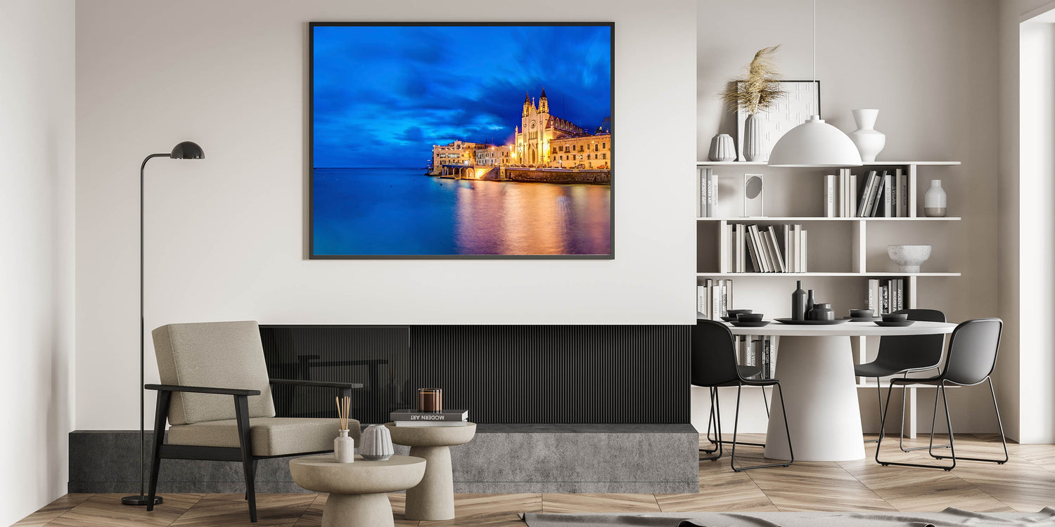 Bring the magic of Malta into your home with this stunning evening coastal scene, perfect for both contemporary and classic interiors. The calming color palette and striking architecture make this artwork an excellent addition to your art collection.