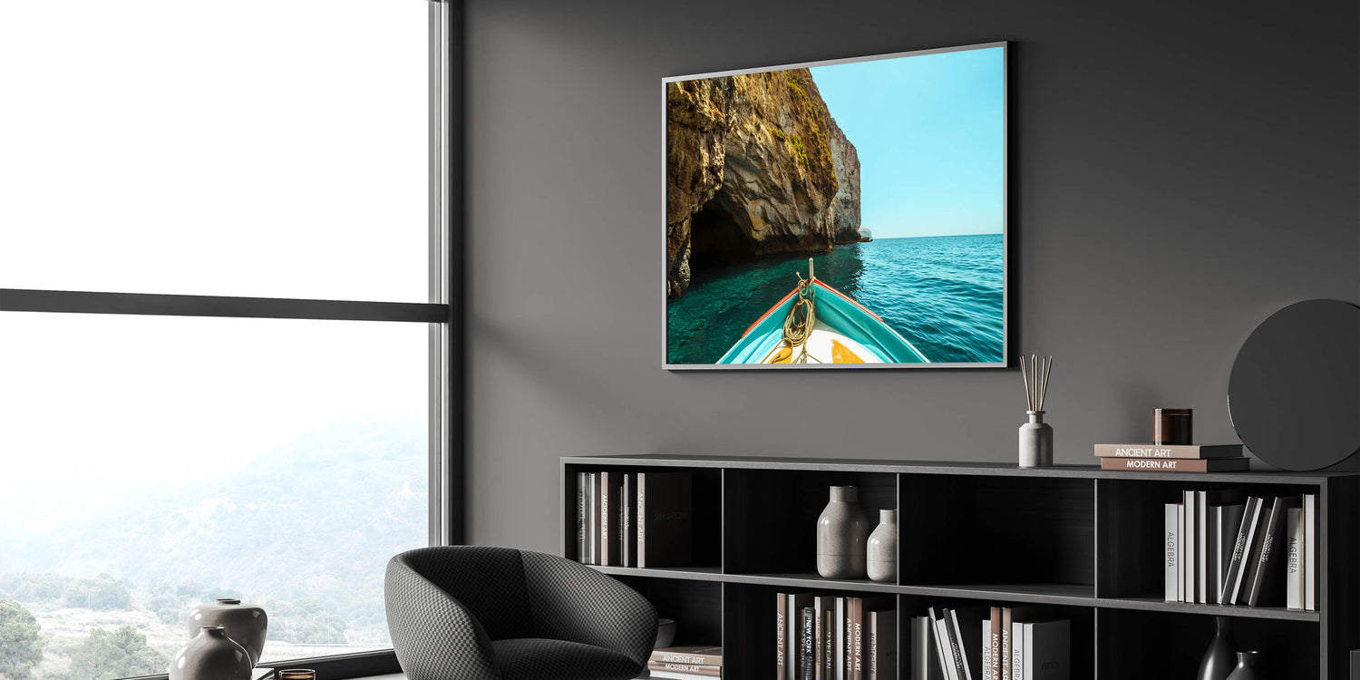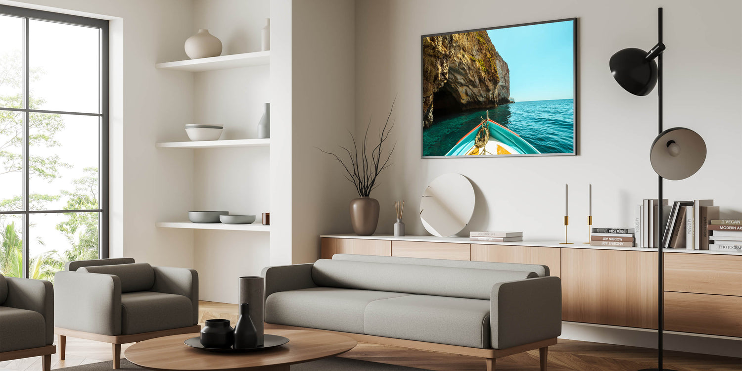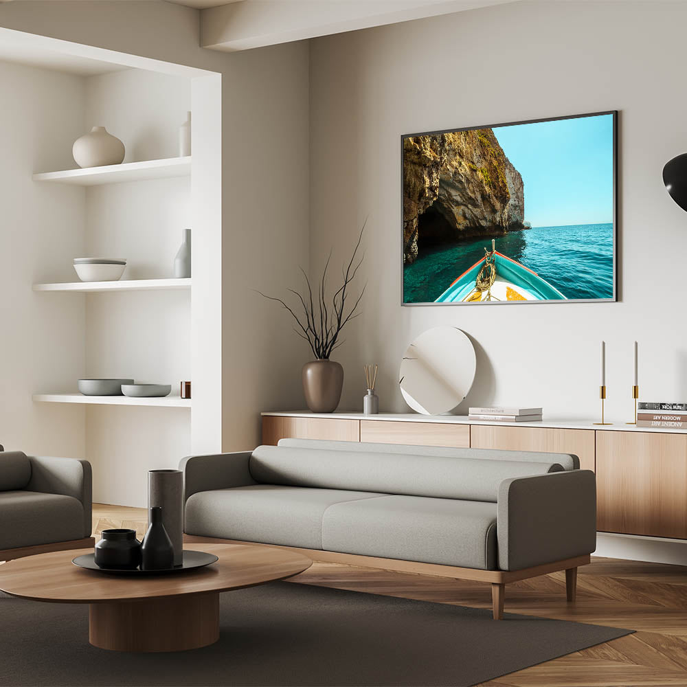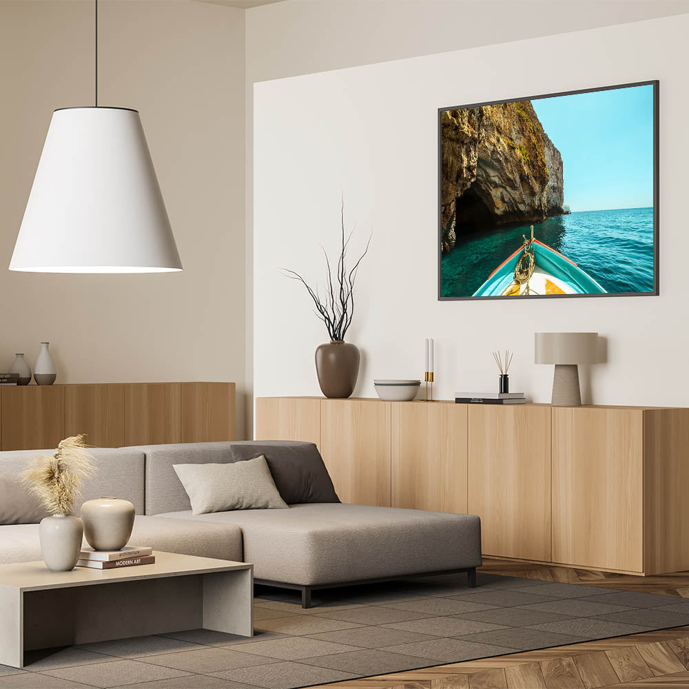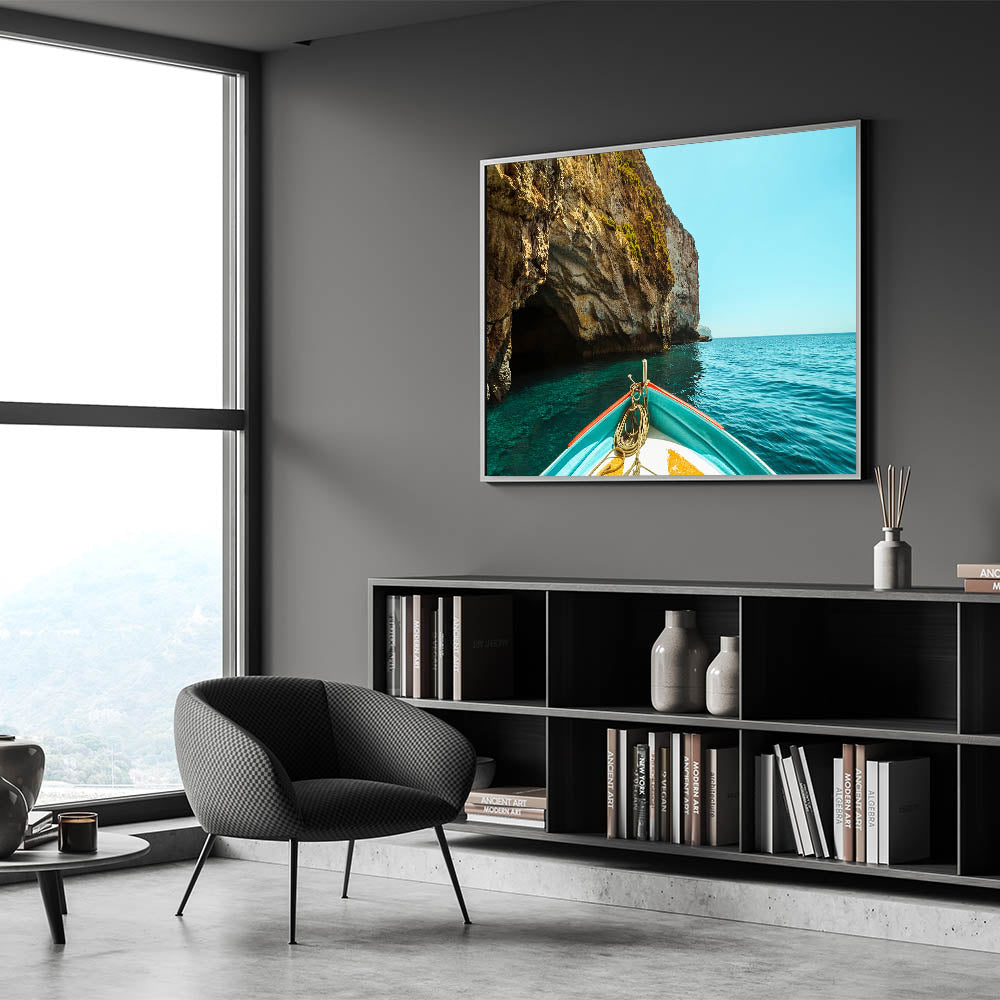 Embark on a tranquil journey through the famous Blue Grotto of Malta with this stunning wall art. The photograph captures the breathtaking contrast of rugged cliffs against the deep blue waters of the Mediterranean Sea, viewed from the bow of a boat. This scenic artwork is perfect for bringing a sense of adventure and natural beauty into your home, transporting you to Malta’s picturesque coastal landscapes.
