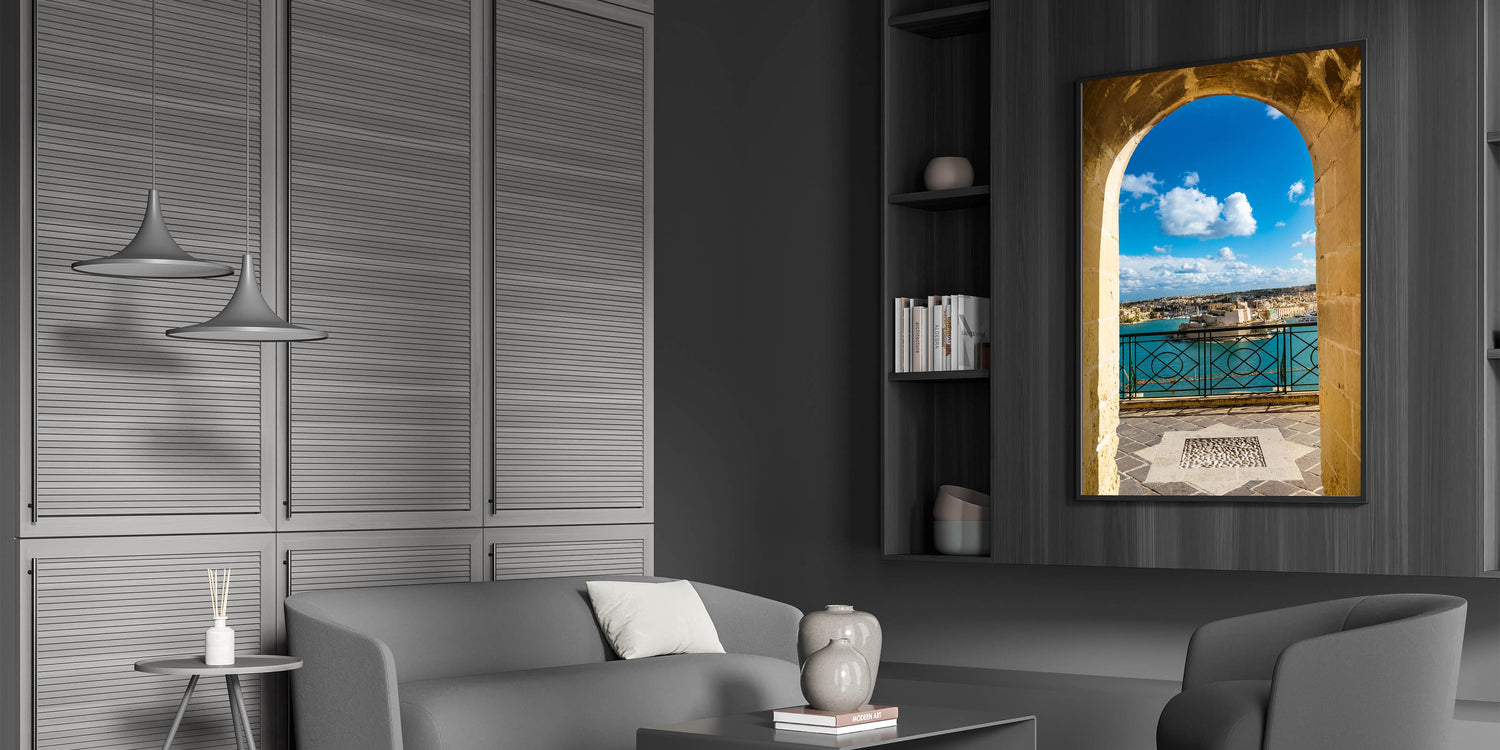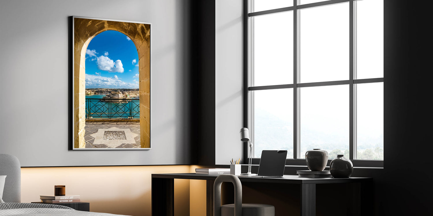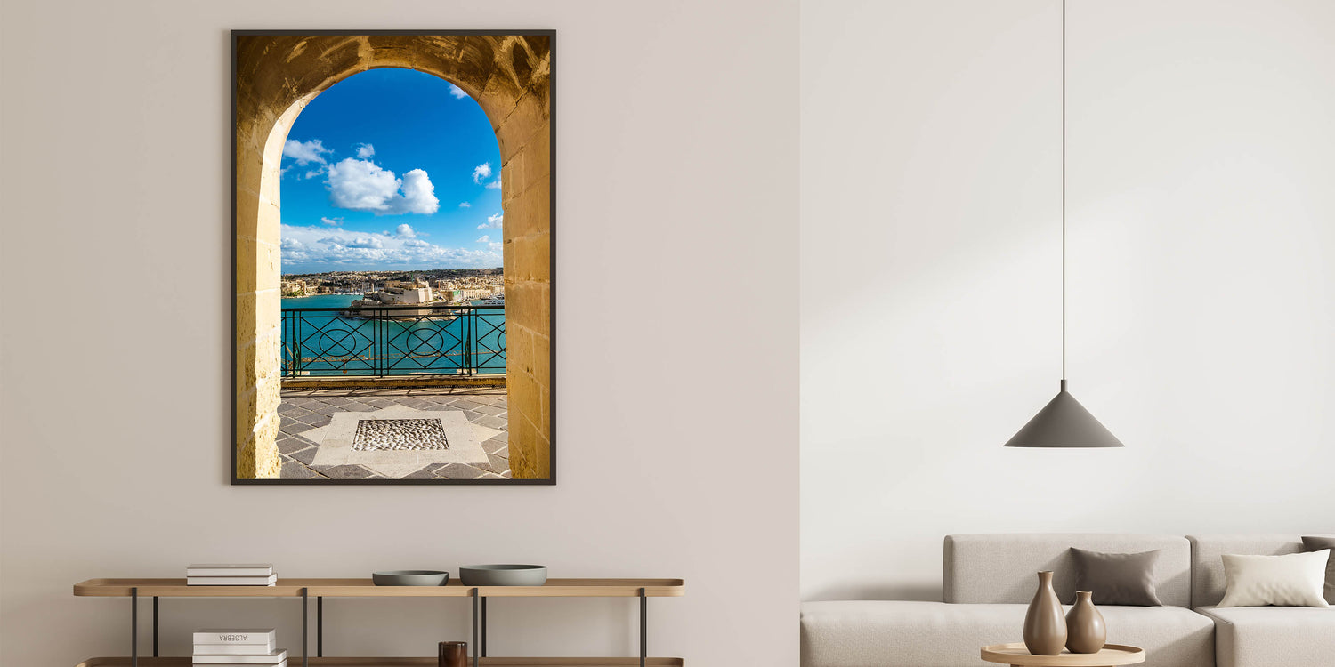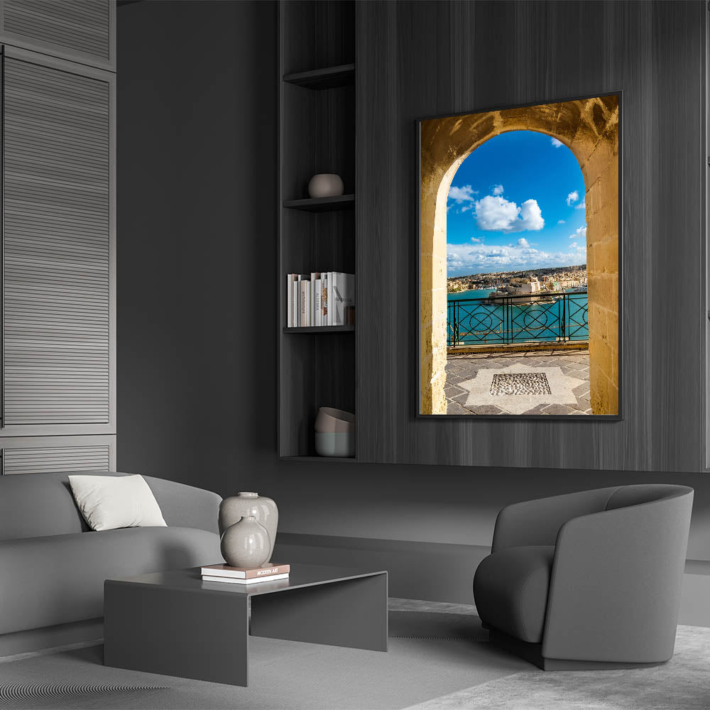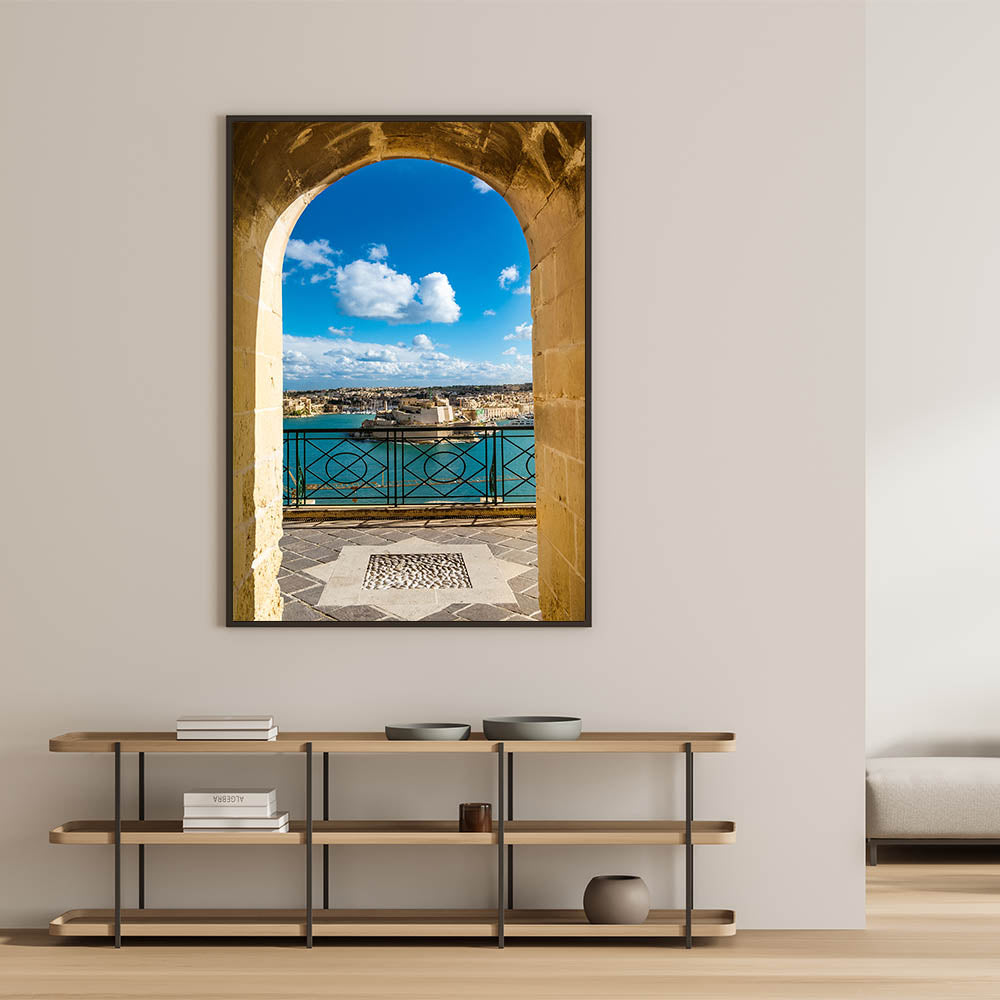 Step into the heart of Malta’s rich history with this breathtaking scenic wall art. This piece beautifully frames the vibrant Mediterranean Sea through an ancient archway, offering a unique perspective of the stunning Maltese coastline and historic architecture. The combination of striking blues and warm stone textures makes this artwork perfect for adding a touch of elegance and history to any room.