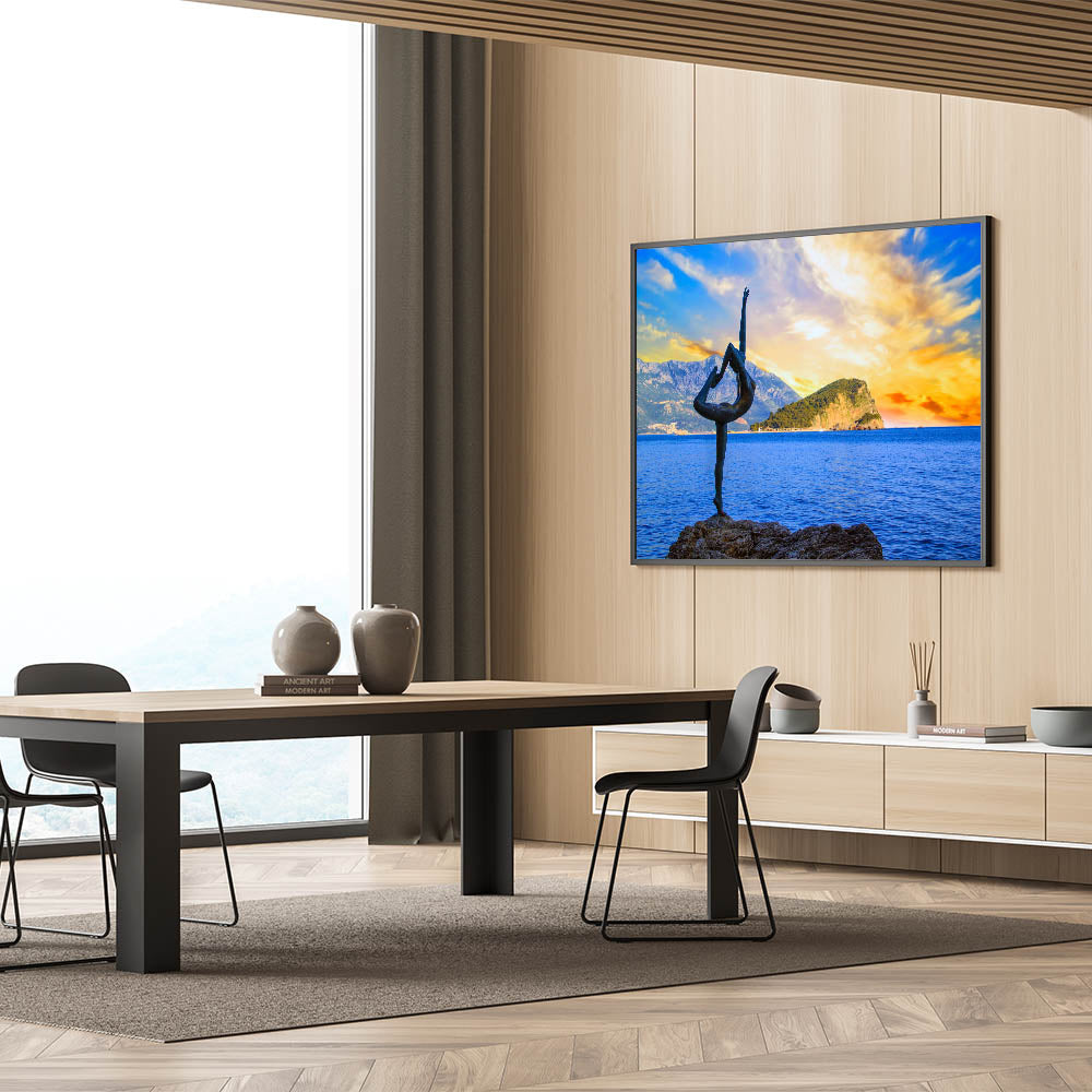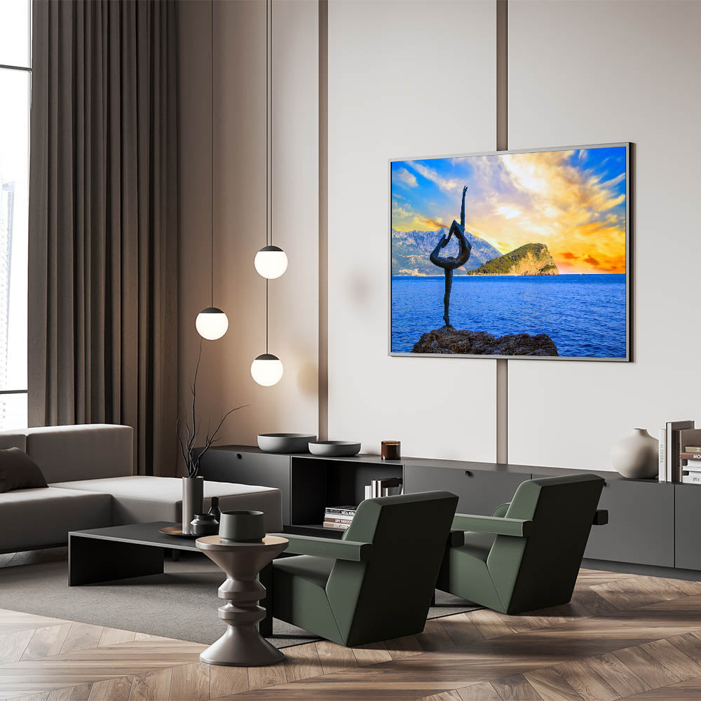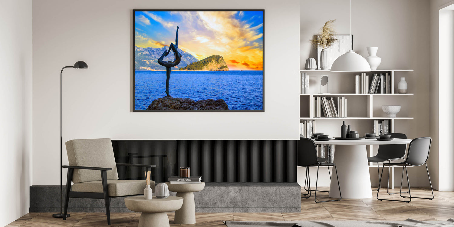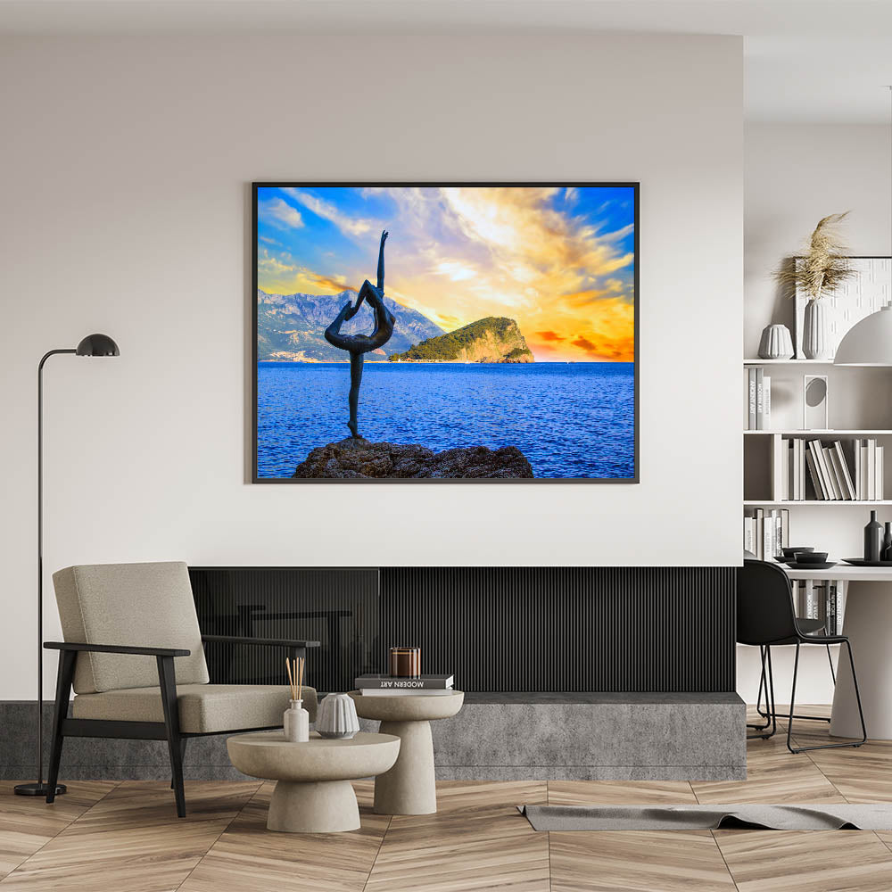 Bring the dynamic beauty of Montenegro’s coastal sunset to your walls with this captivating wall art. Featuring the famous dancer statue, gracefully posed against the backdrop of a vivid sunset and calm waters, this piece captures both movement and serenity in one breathtaking moment. The vibrant colors of the sky and the surrounding natural beauty make this artwork perfect for those looking to add a touch of artistic elegance to their home décor.