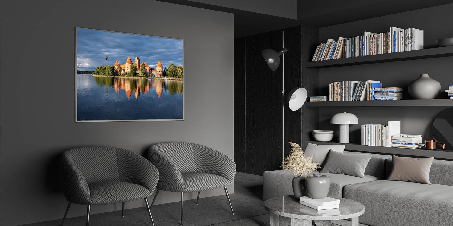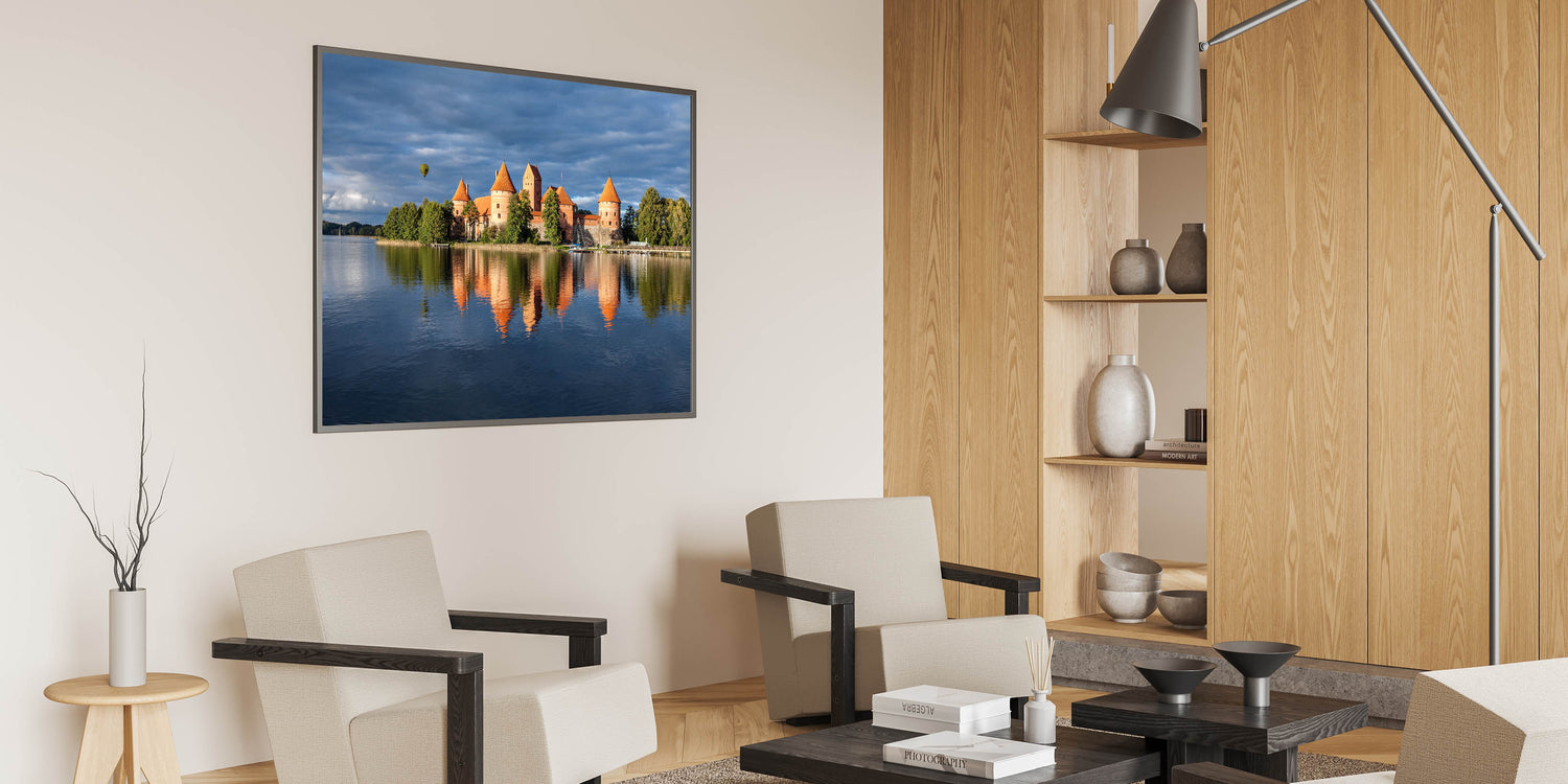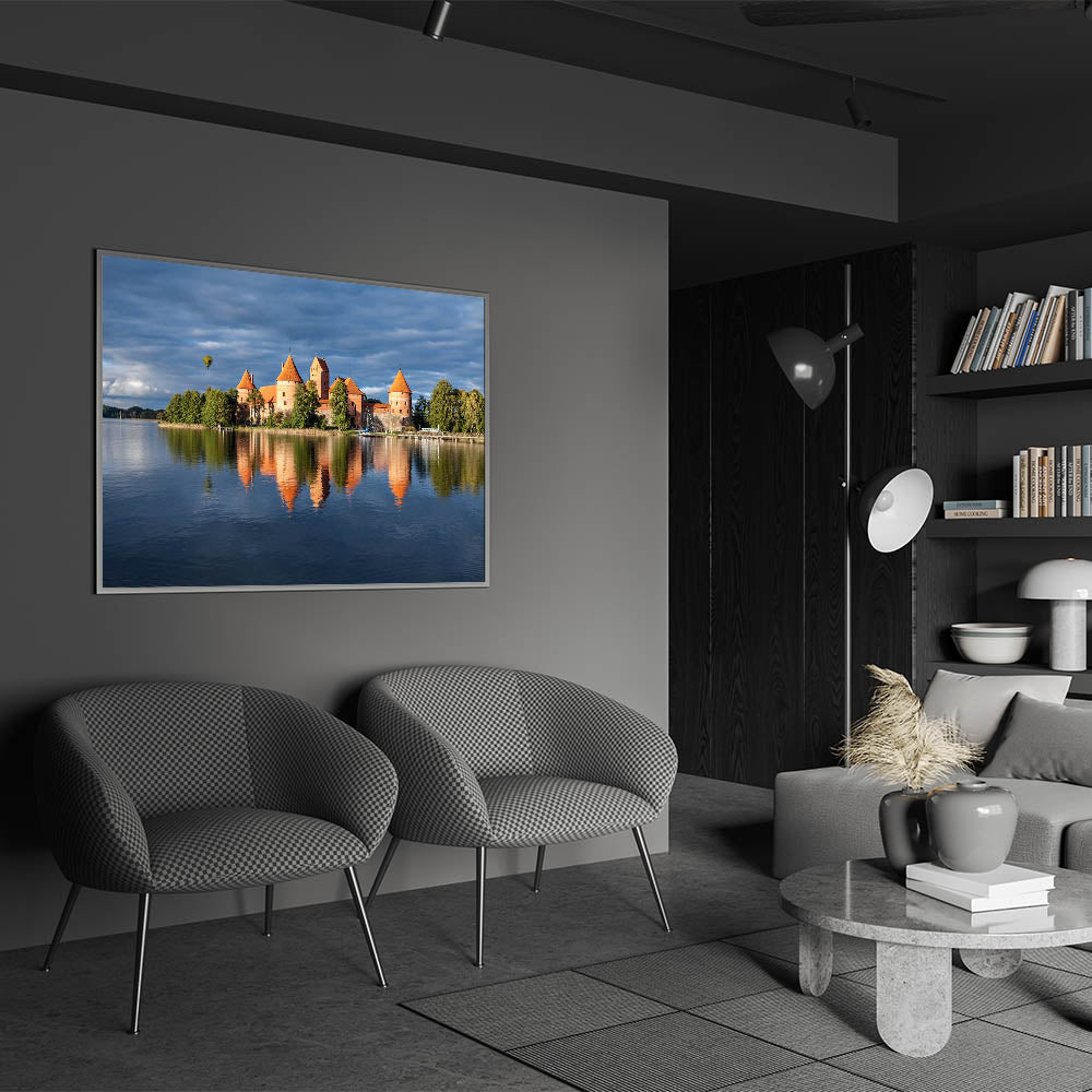 - Scenic Baltic region prints showcasing Trakai Castle’s reflection.