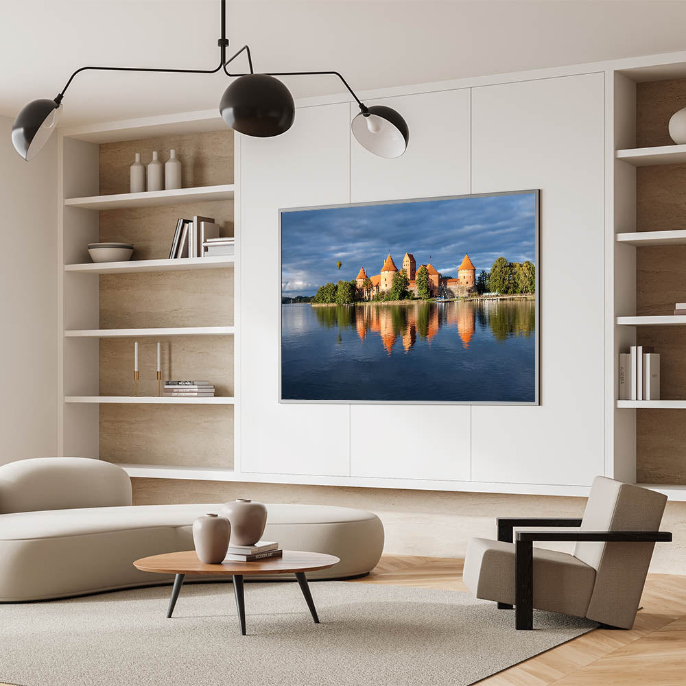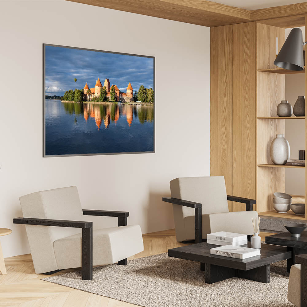 Bring the serene beauty of Lithuania into your space with this stunning artwork featuring the iconic Trakai Castle and its perfect reflection on the tranquil waters of Lake Galvė. This captivating scene blends historical architecture with nature's peaceful harmony, offering a unique view of one of the most treasured landmarks in the Baltic region. Ideal for living rooms, offices, or bedrooms, this beautiful Lithuania artwork provides an escape to a tranquil landscape, allowing you to experience the charm of the region daily.