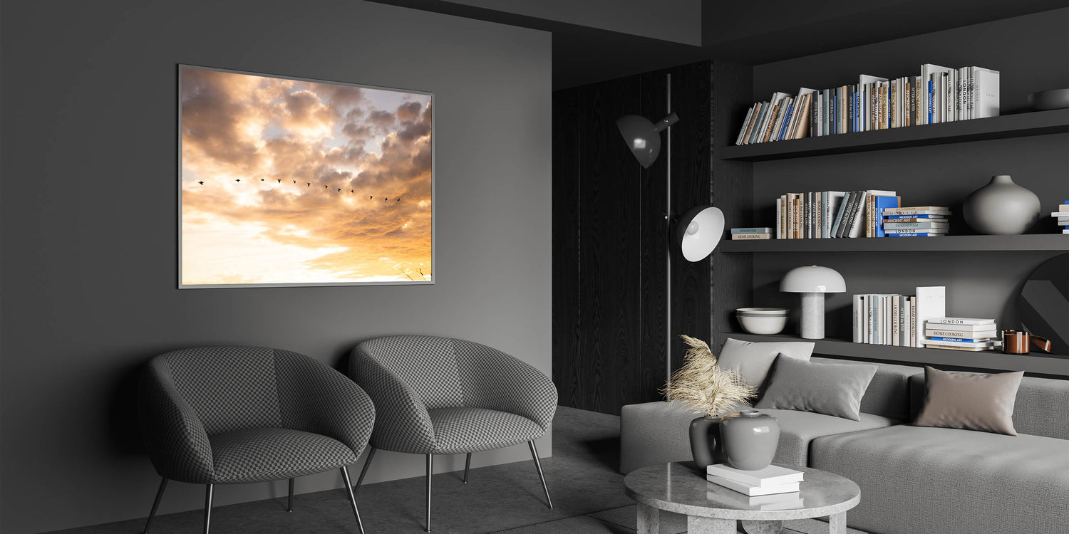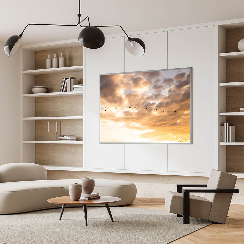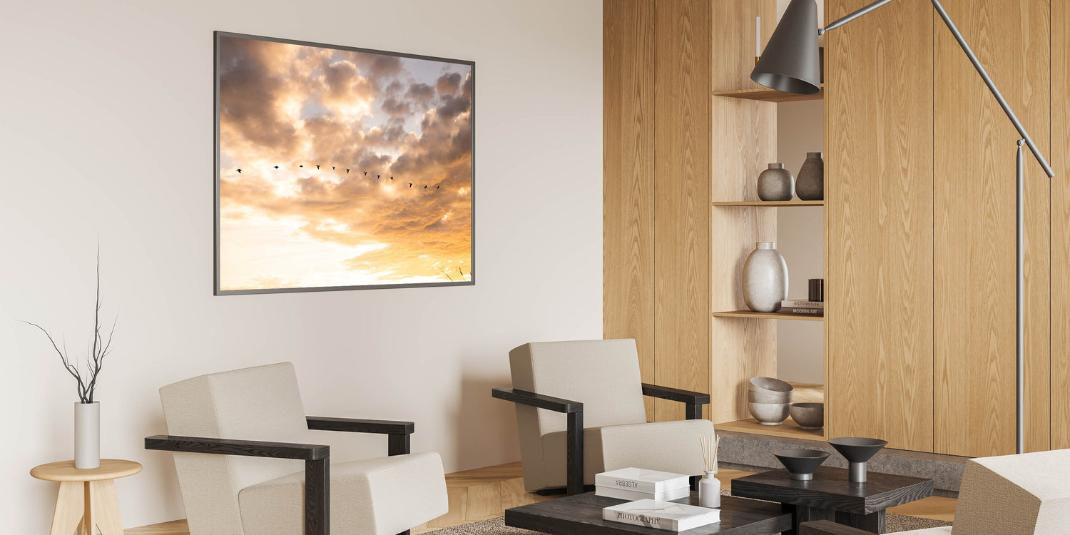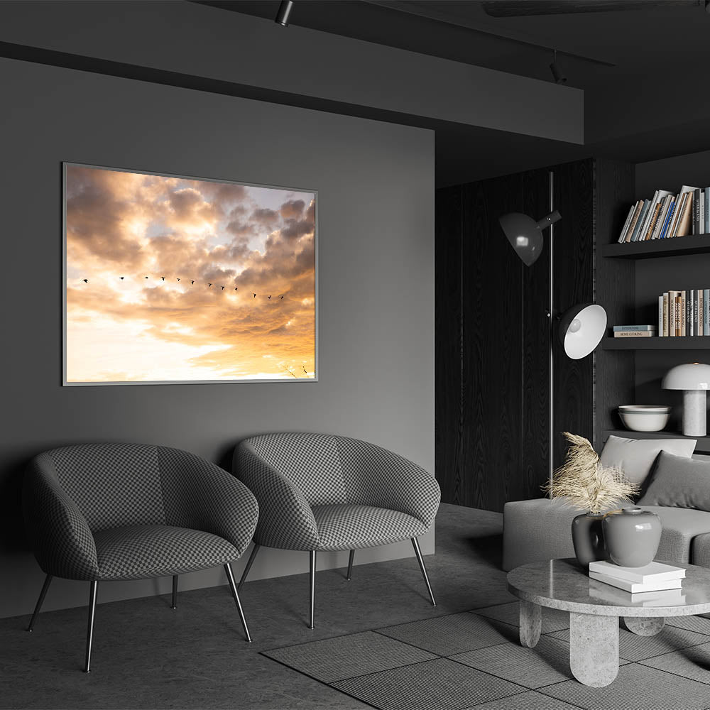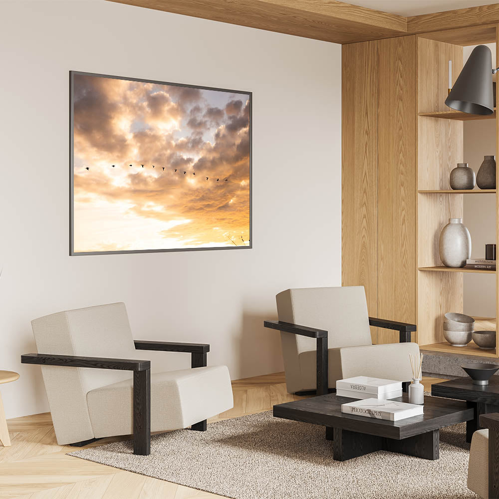 Add this unique Everglades photography to your Florida Wetlands Art Collection. The warm sunset colors and elegant movement of the birds make this piece perfect for creating a calm, nature-inspired environment.
