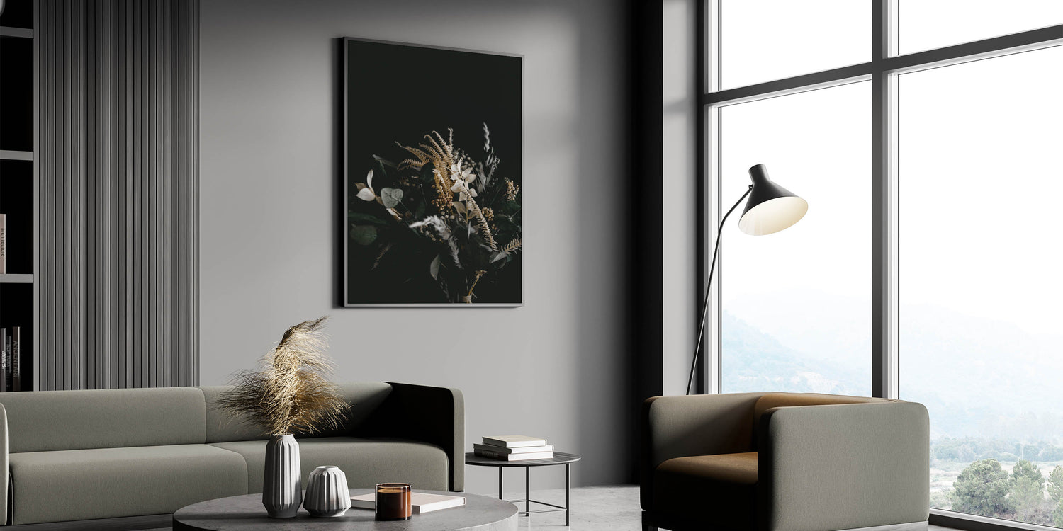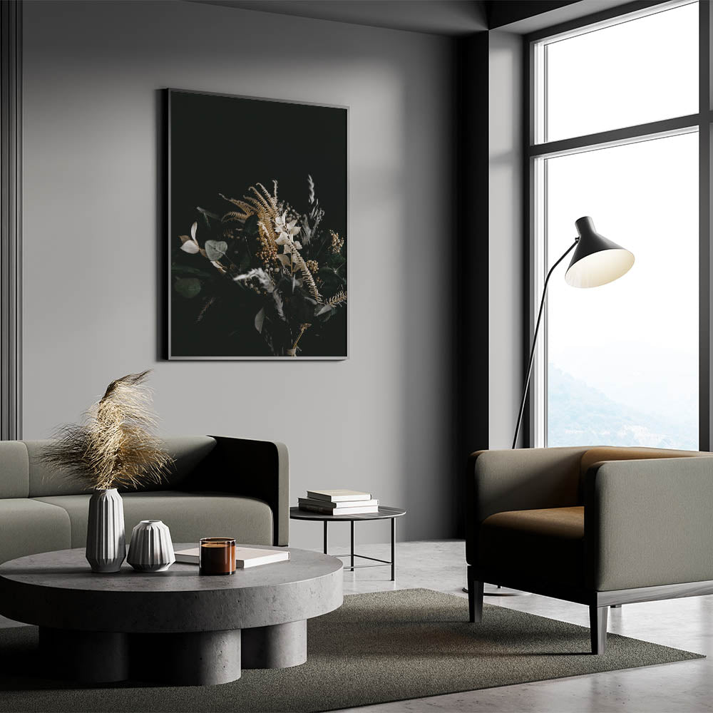 This fall wall art showcases a beautifully arranged autumn bouquet featuring dried ferns, delicate beige leaves, and muted golden berries against a dark background. The rich contrast between light and shadow gives this autumn canvas art a dramatic and sophisticated appeal, perfect for adding seasonal elegance to any space.