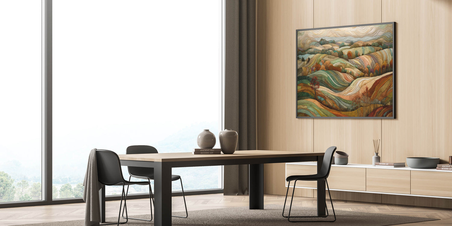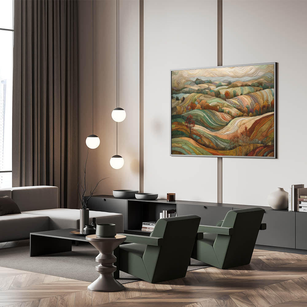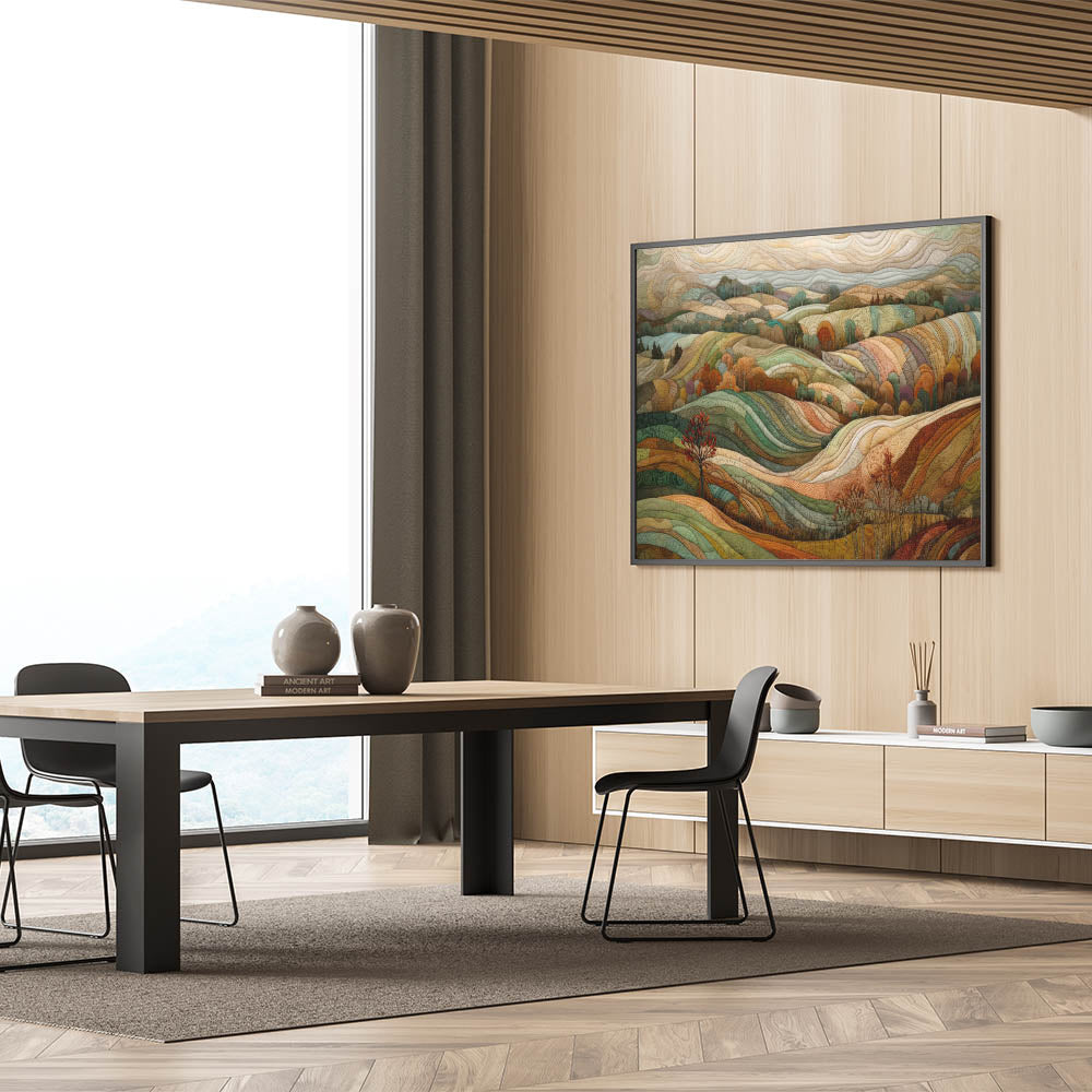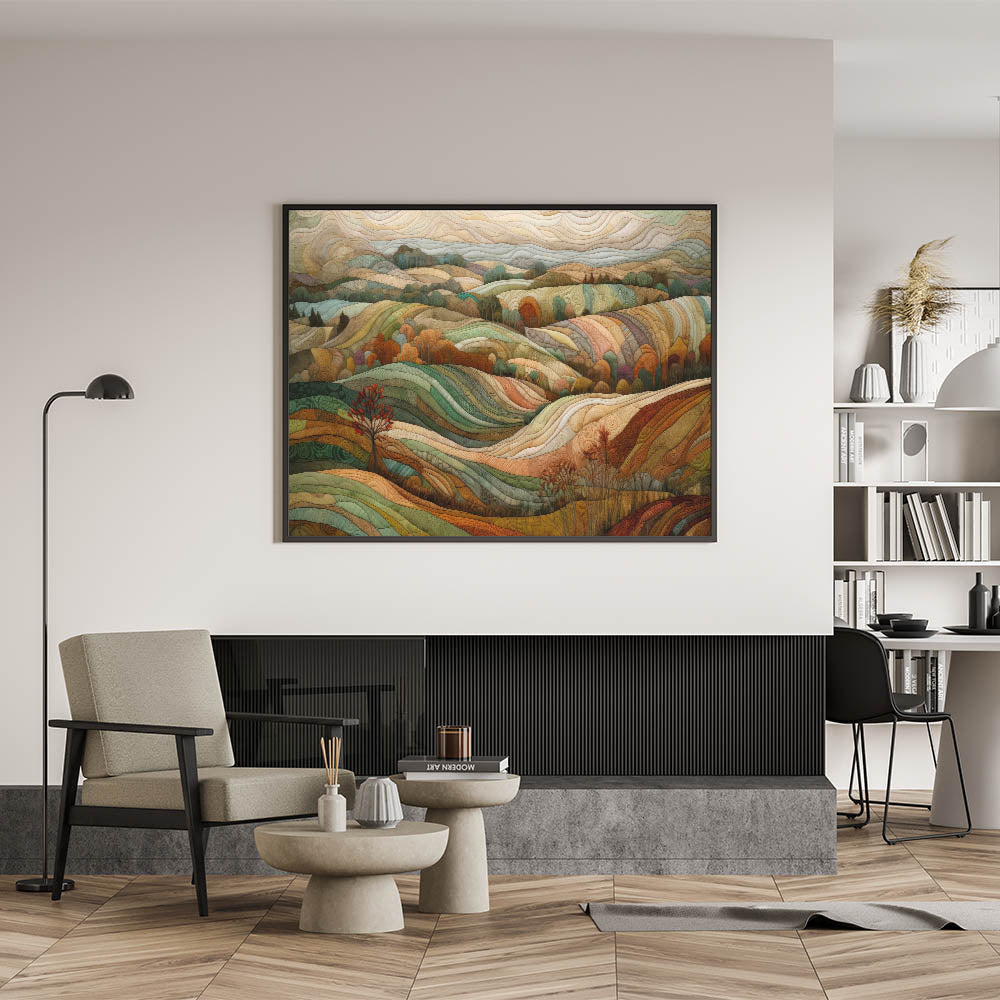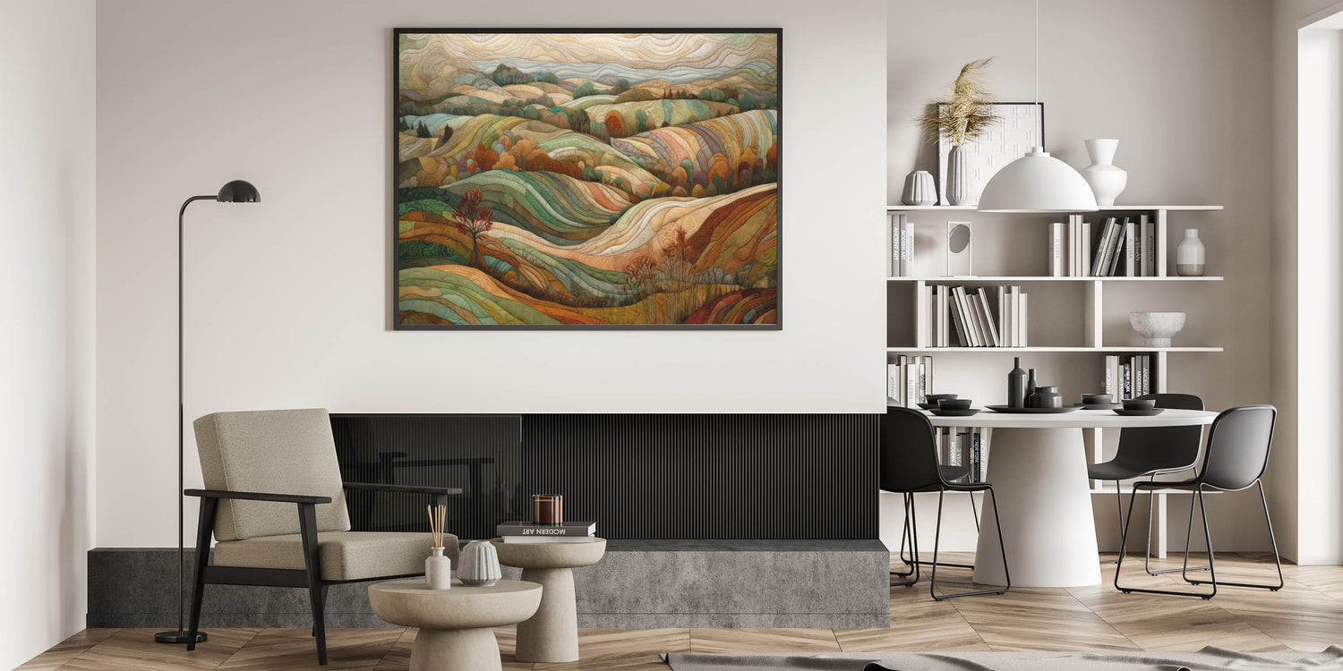 Experience the tranquility of the fall season with this stunning abstract landscape wall art. Featuring rolling hills in a vibrant patchwork of autumn colors, the artwork beautifully blends earthy greens, warm oranges, muted blues, and soft beige tones. The layered textures and swirling lines evoke the feeling of a countryside quilt, capturing the beauty of the harvest season in a dynamic, flowing design.