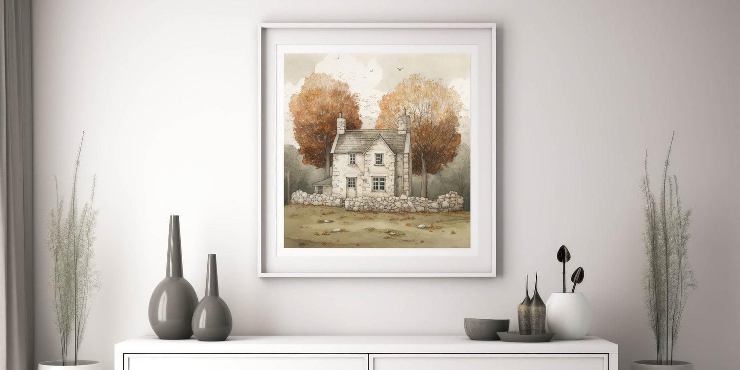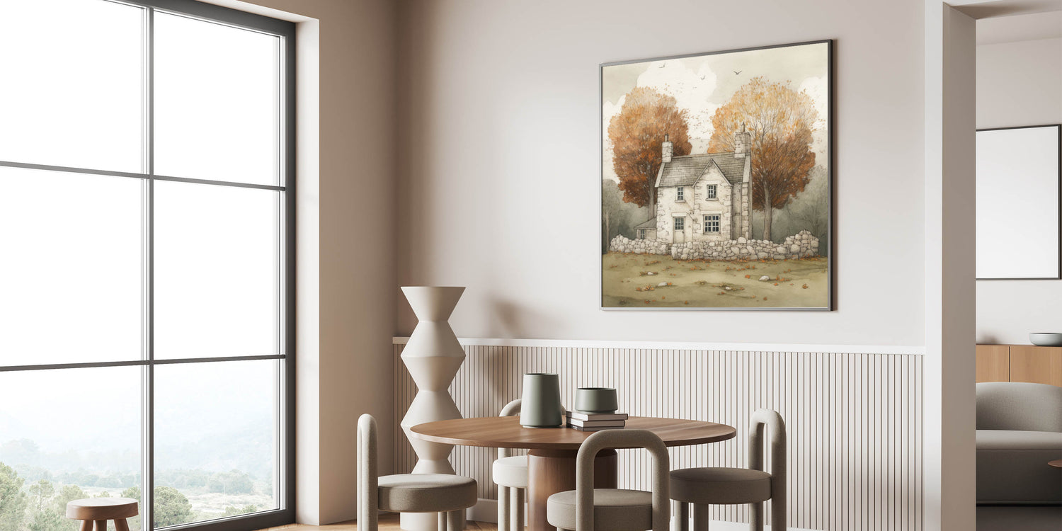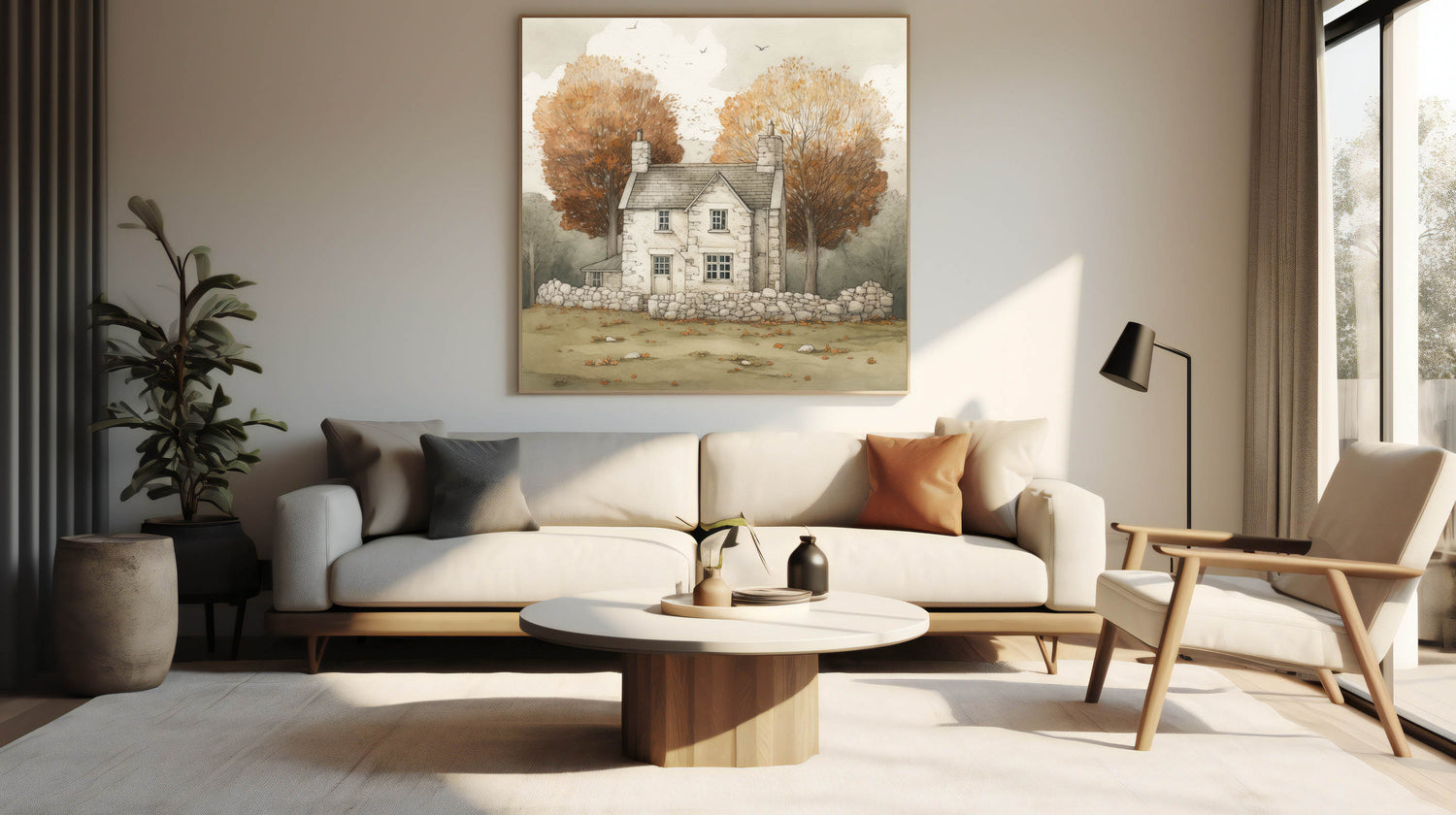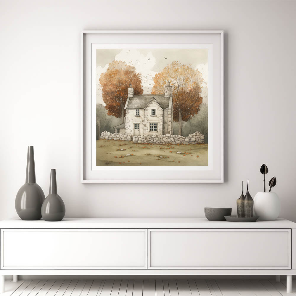 Cottage Fall Wall Art - Cozy Autumn Scene in Light Brown and Beige