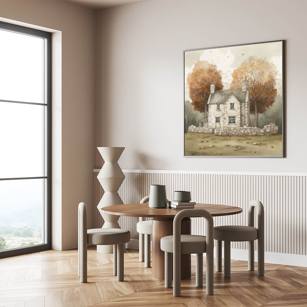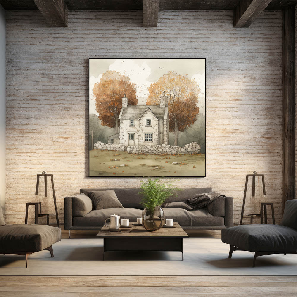 Step into a serene autumn setting with this charming cottage fall wall art. The piece features a picturesque stone cottage surrounded by tall trees, their leaves painted in warm shades of light brown and soft orange. The muted beige tones in the background evoke a sense of calm and nostalgia, making it an ideal choice for seasonal wall decor. This artwork beautifully captures the quiet beauty of the countryside during the fall season.
