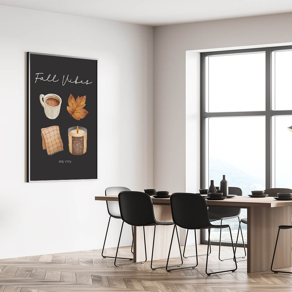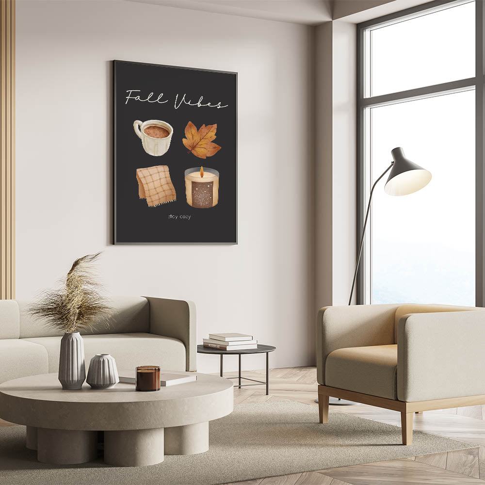 Embrace the warmth and comfort of autumn with this Cozy Fall Vibes Wall Art, featuring charming watercolor illustrations of a cozy blanket, a steaming cup of cocoa, a flickering candle, and a rustic autumn leaf. Set against a sleek black background, this Autumn Canvas Art creates a striking contrast that enhances any space with a sophisticated yet inviting seasonal touch.