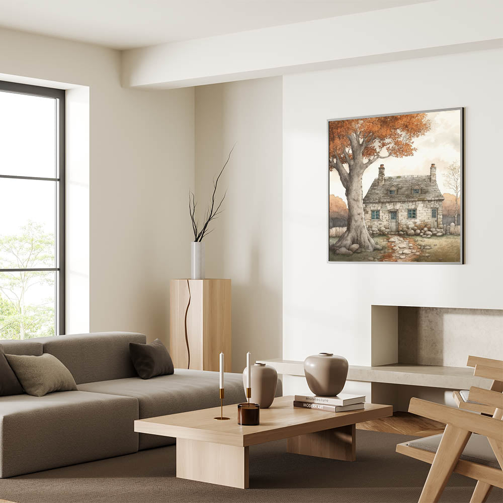 Capture the essence of a peaceful autumn retreat with this charming fall wall art. The artwork showcases a quaint stone cottage nestled under a large tree with golden-brown leaves, perfectly encapsulating the beauty of the harvest season. The soft, watercolor textures and muted tones create a tranquil atmosphere, making this piece ideal for adding a touch of rustic charm to your home decor.