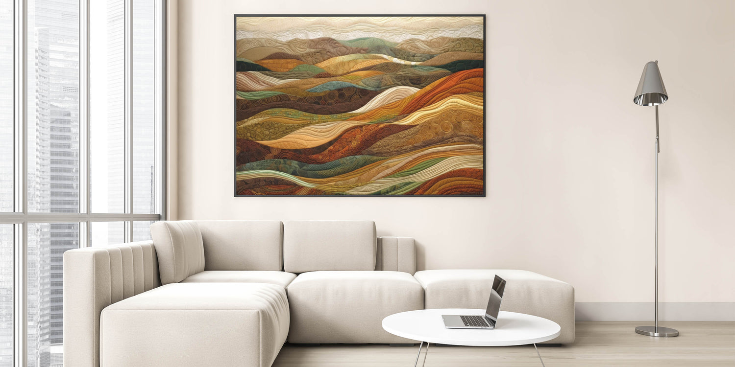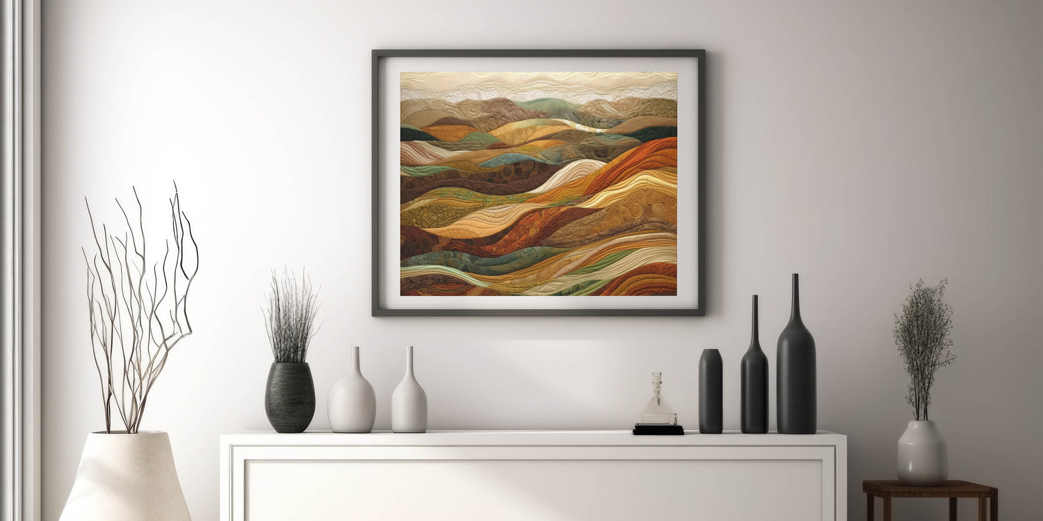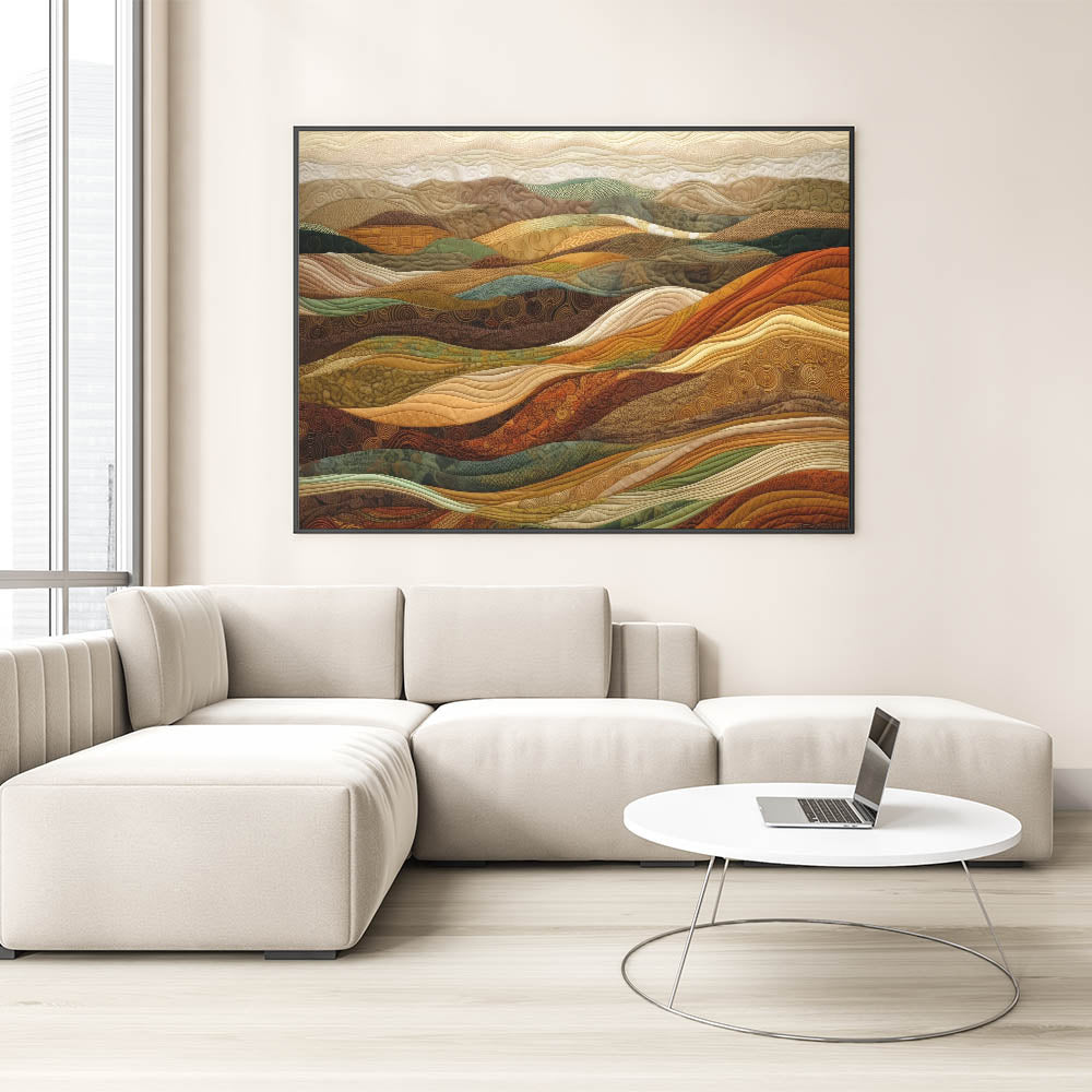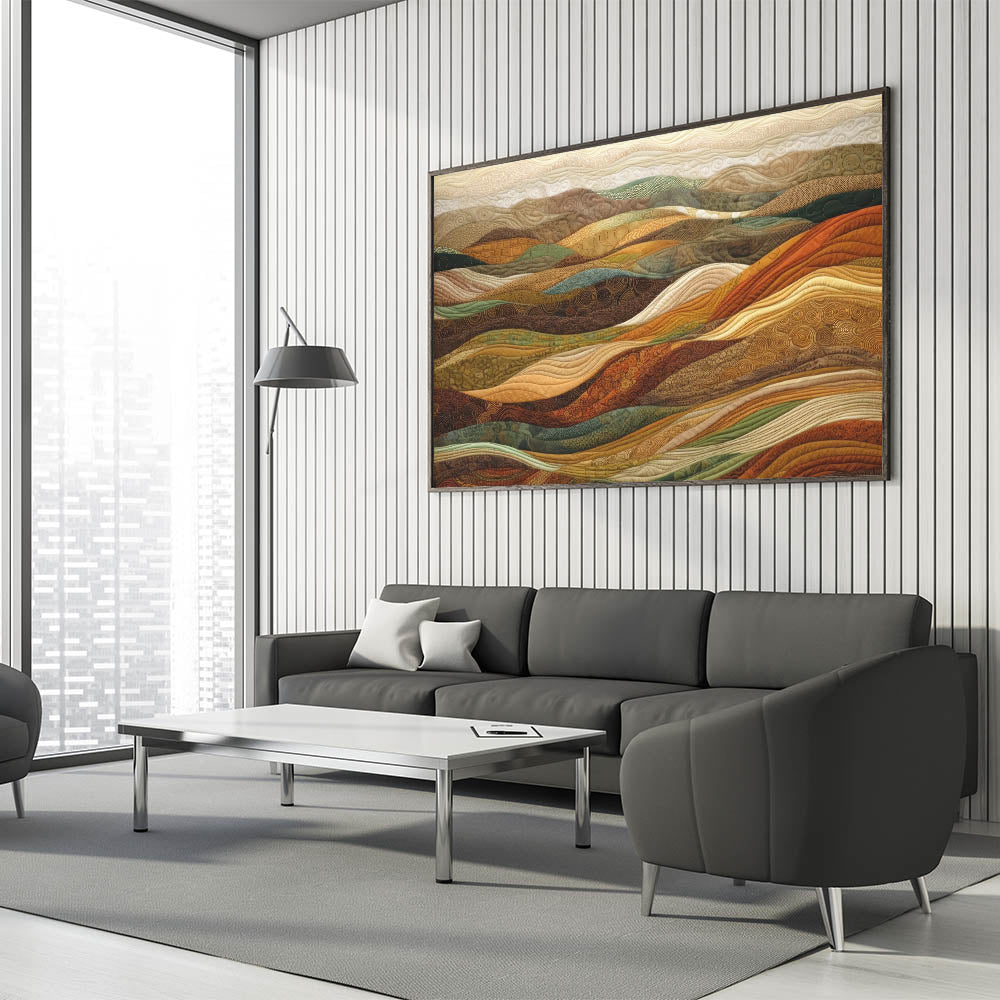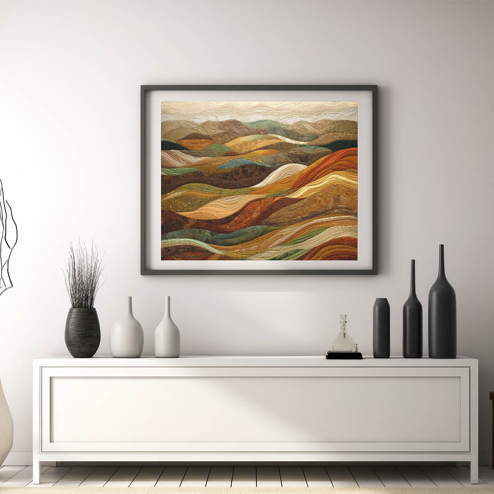 Experience the natural beauty of the autumn landscape with this earthy hills wall art. Featuring a harmonious blend of deep brown, muted olive green, and warm golden yellow, this piece captures the tranquil essence of the harvest season. The intricate textures and layered patterns evoke the gentle curves of rolling hills, making it a perfect addition for those who appreciate the serene charm of nature.