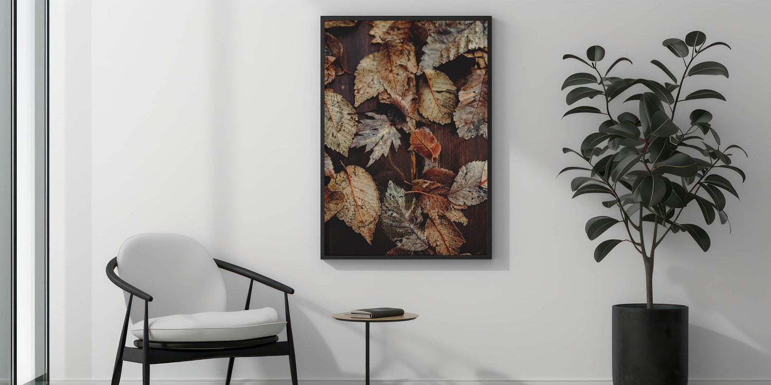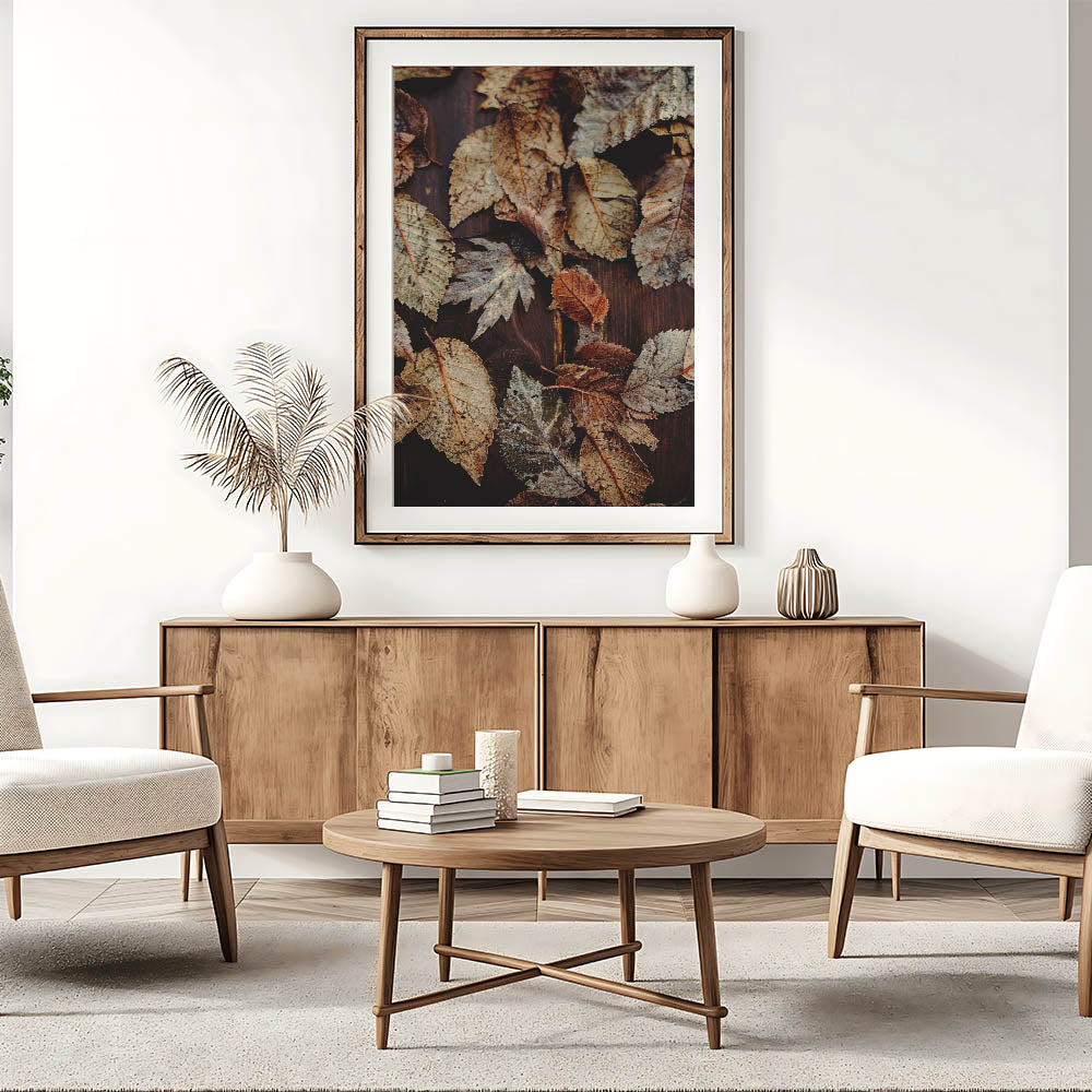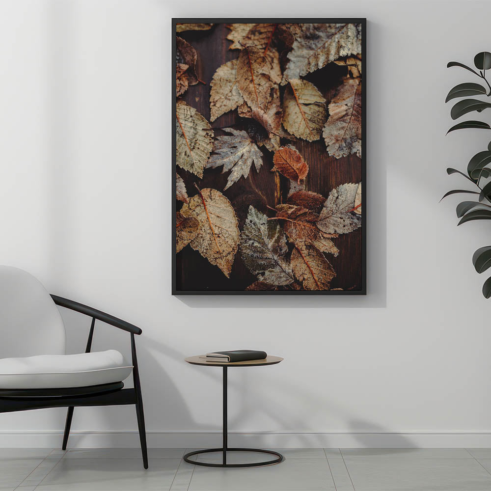 Embrace the rustic beauty of autumn with this fall wall art, featuring a stunning close-up of frost-touched leaves resting on a rich wooden background. The intricate details of each leaf, from delicate frost patterns to warm earthy hues, create a cozy and timeless composition. This autumn wall art is perfect for farmhouse, rustic, and nature-inspired interiors, bringing the crisp essence of the season indoors.