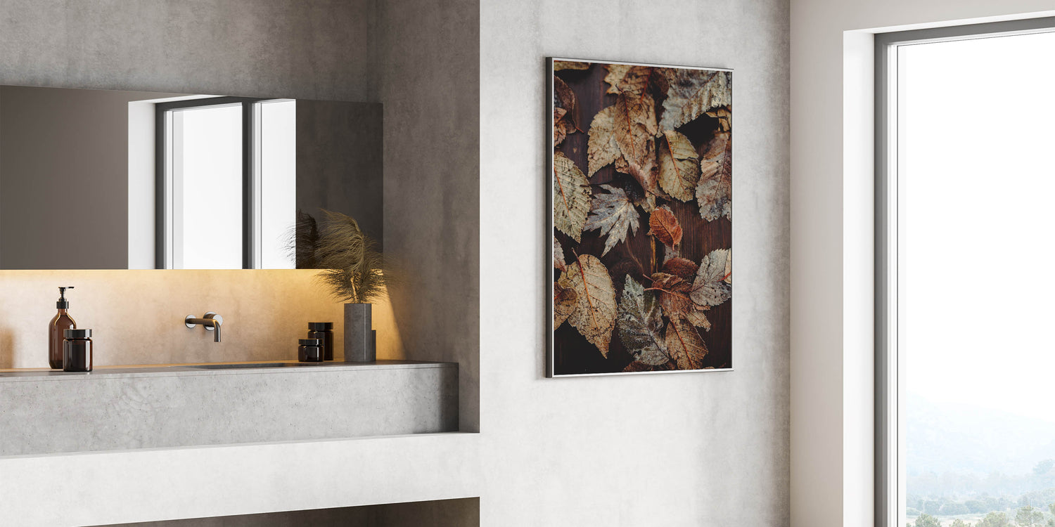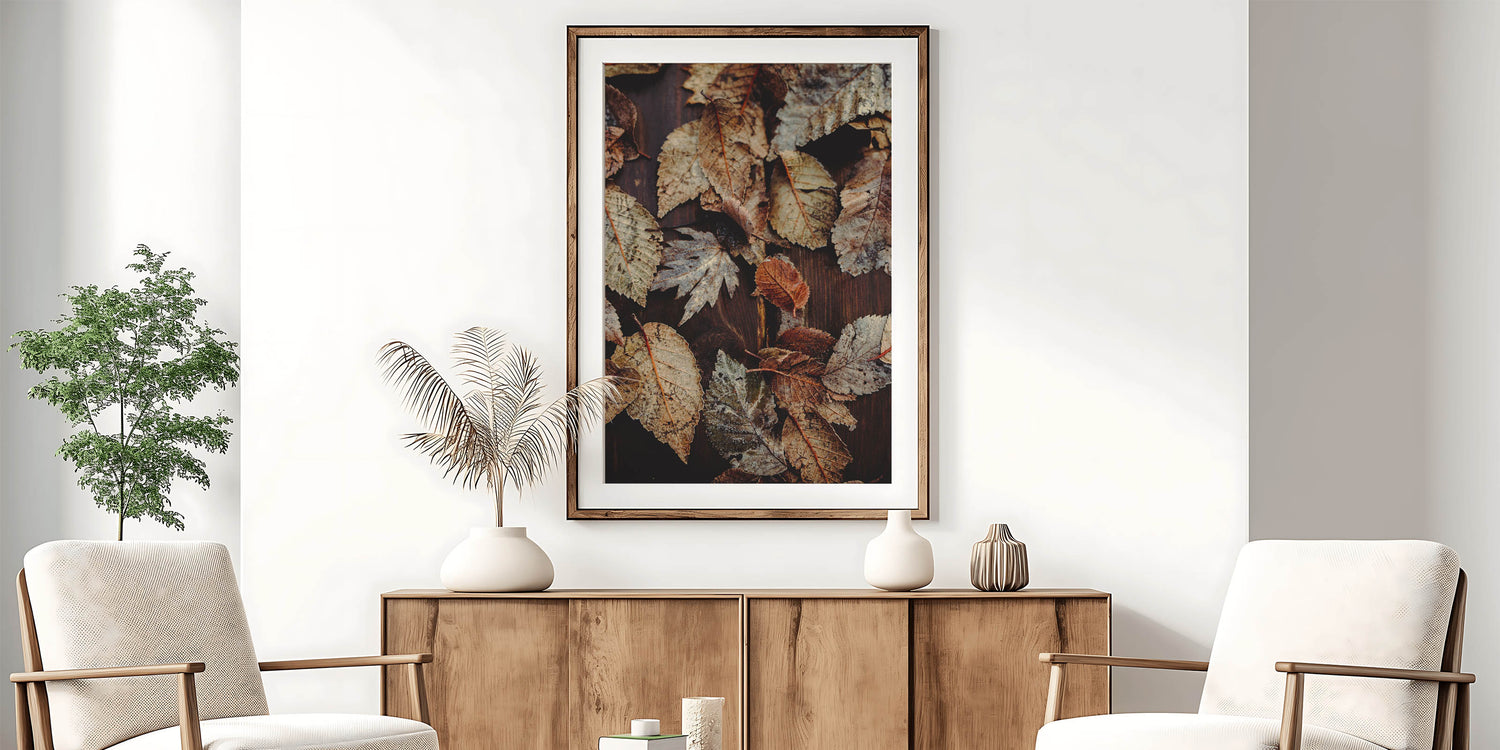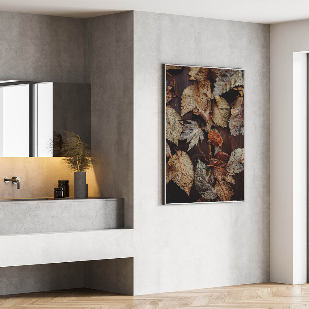 Embrace the rustic beauty of autumn with this fall wall art, featuring a stunning close-up of frost-touched leaves resting on a rich wooden background. The intricate details of each leaf, from delicate frost patterns to warm earthy hues, create a cozy and timeless composition. This autumn wall art is perfect for farmhouse, rustic, and nature-inspired interiors, bringing the crisp essence of the season indoors.