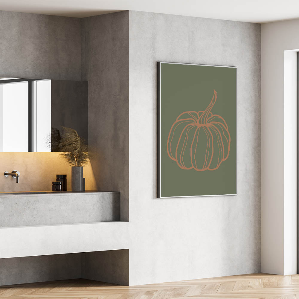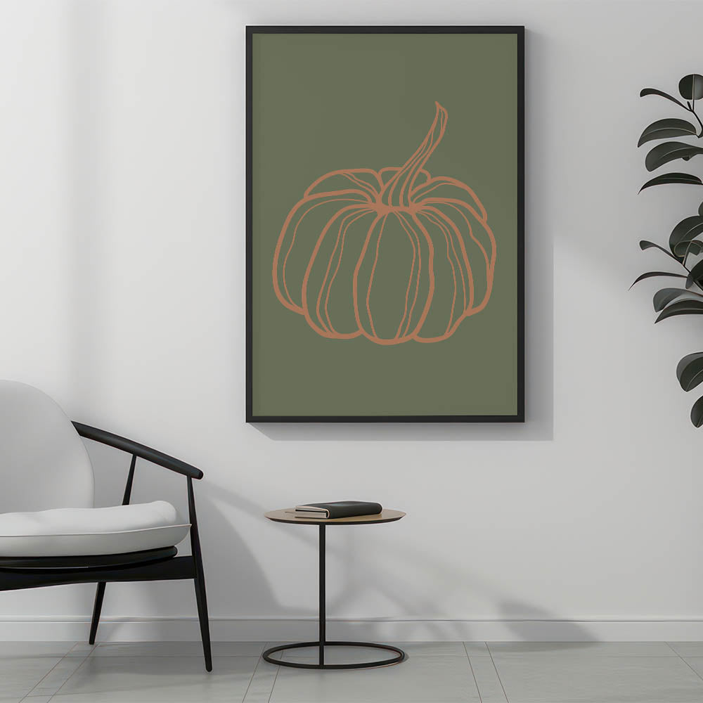 Celebrate the beauty of fall with this Minimalist Pumpkin Wall Art, featuring a simple yet elegant line-art pumpkin illustration in warm autumn hues. Set against a deep forest green background, the bold orange outline creates a striking contrast that makes this Autumn Canvas Art a standout piece in any space. Whether used for seasonal decorating or as a modern farmhouse accent, this Fall Wall Decor blends seamlessly into rustic, contemporary, and minimalist interiors.