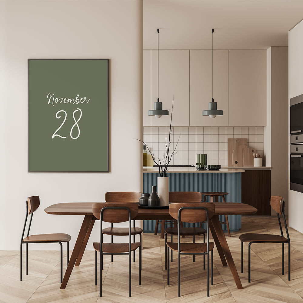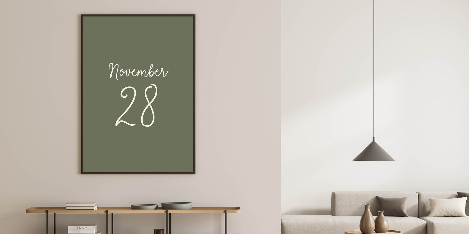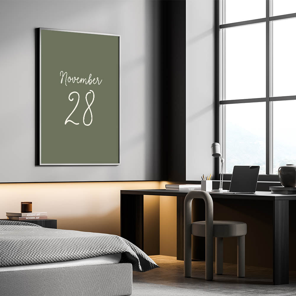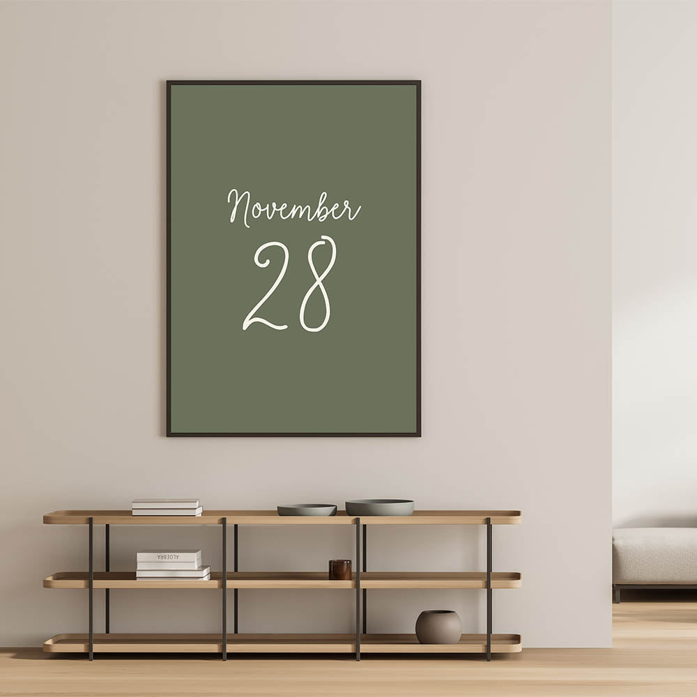 Celebrate a special date with this November 28 Wall Art, featuring a minimalist yet elegant typography design on a rich forest green background. Whether this date holds sentimental value for you or represents a meaningful occasion, this Autumn Canvas Art adds a unique and personal touch to your Fall Wall Decor. Perfect for seasonal decorations, milestone celebrations, or as a thoughtful gift, this artwork embodies the warmth and beauty of late autumn.