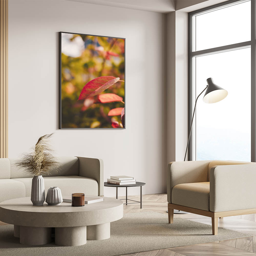 Capture the delicate beauty of autumn with this stunning fall wall art, featuring a close-up of a vibrant red leaf against a softly blurred background. The intricate veins and warm hues create a striking contrast, making this autumn canvas art a perfect addition to any nature-inspired decor. The soft golden tones in the background add depth and warmth, evoking the peaceful charm of fall.