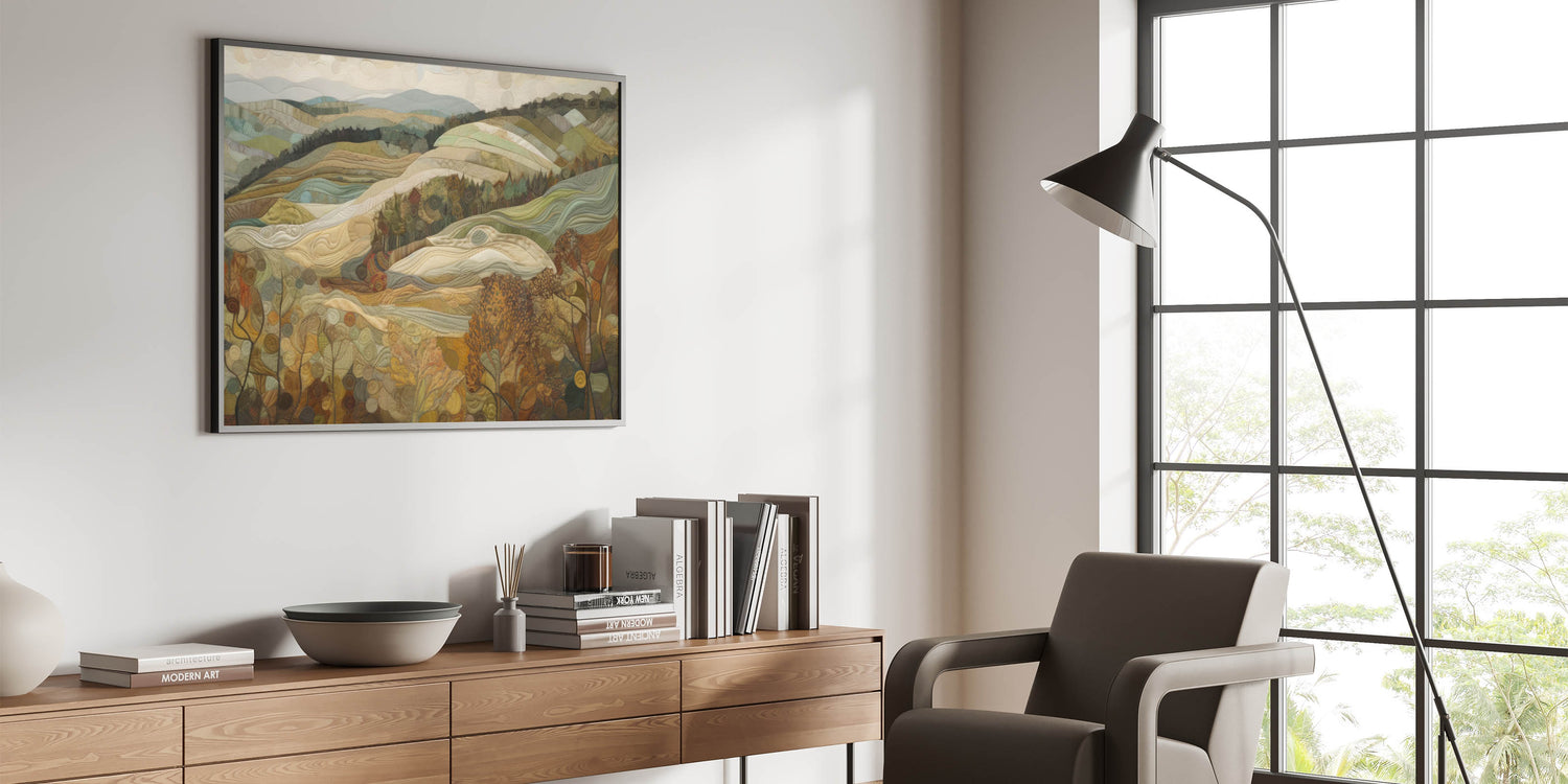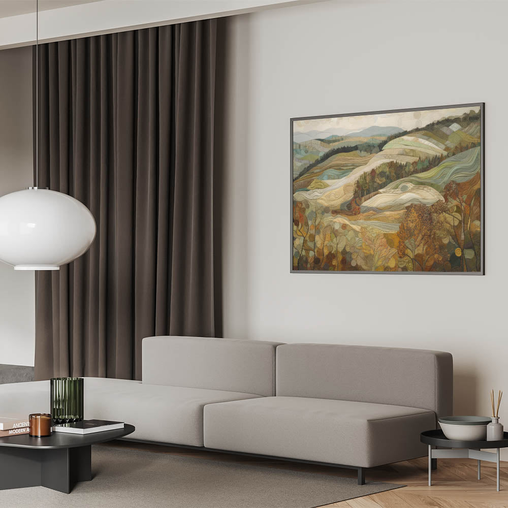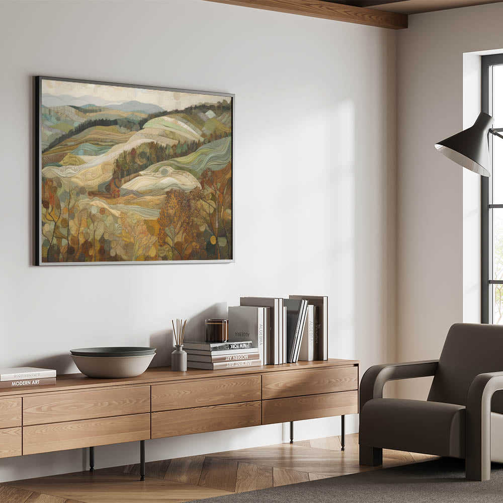 Immerse yourself in the beauty of the fall season with this breathtaking abstract landscape wall art. The artwork features rolling hills in a stunning patchwork of earth tones, including shades of beige, olive green, and muted blue. The textured, quilt-like layers create a sense of depth, evoking the peaceful ambiance of a countryside during the harvest season. Autumn trees with vibrant orange and yellow hues add a dynamic contrast, making this piece a captivating focal point for any room.