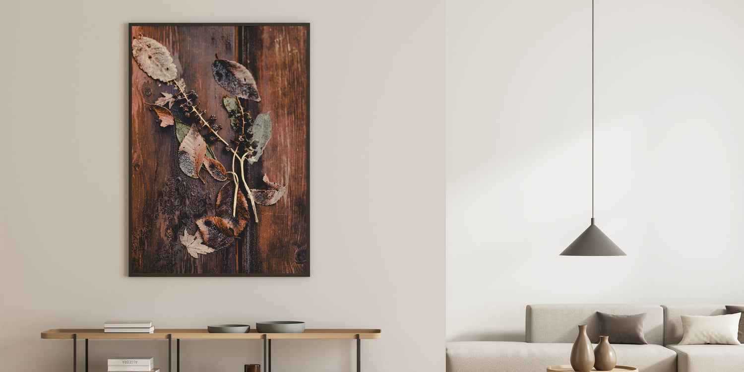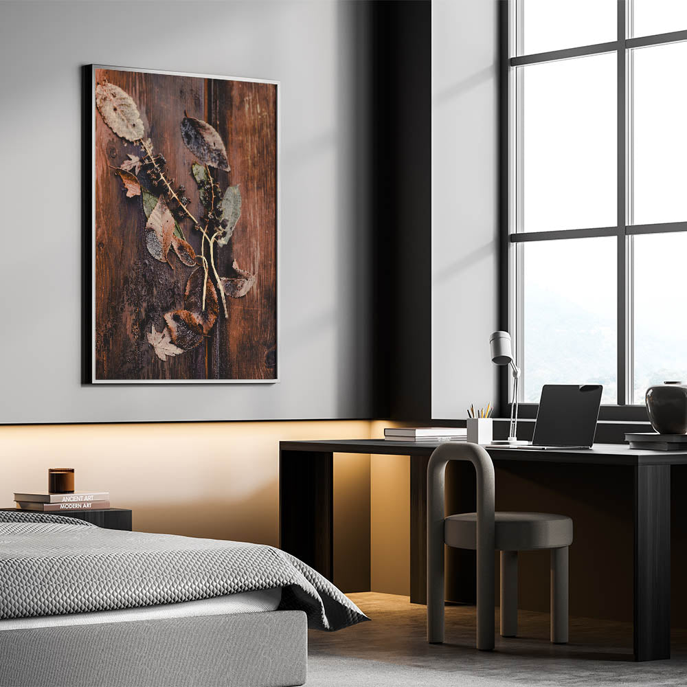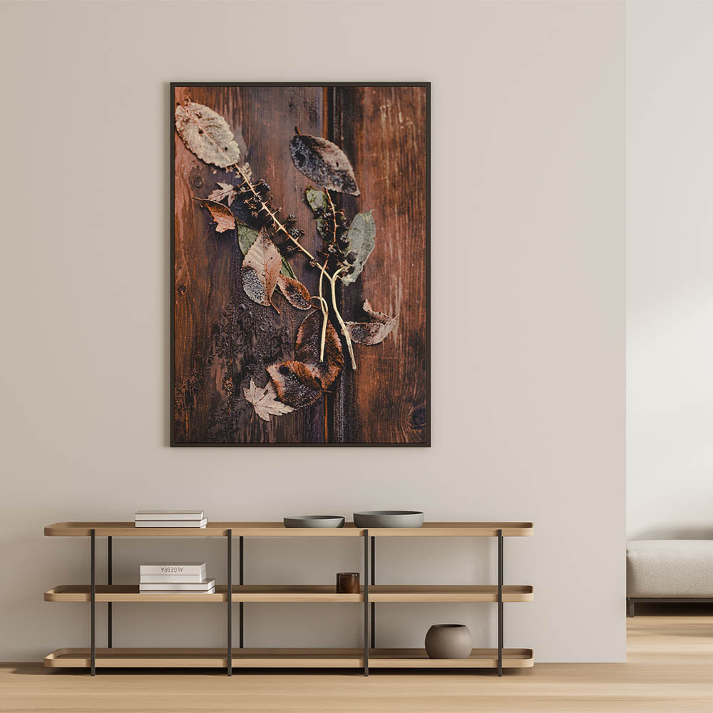 Bring the serene beauty of late autumn into your home with this fall wall art, featuring frost-kissed leaves and delicate branches against a rustic wooden backdrop. The blend of earthy browns, muted greens, and soft frost details captures the quiet elegance of the changing seasons. This autumn wall art is a perfect choice for nature lovers and those who appreciate rustic, farmhouse, or vintage-inspired interiors.