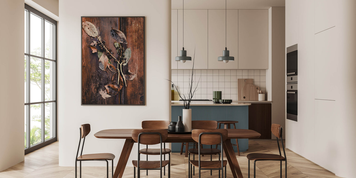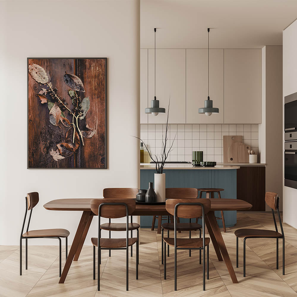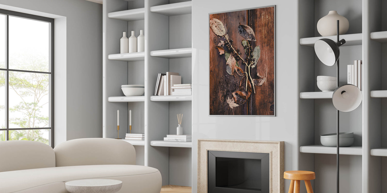 Bring the serene beauty of late autumn into your home with this fall wall art, featuring frost-kissed leaves and delicate branches against a rustic wooden backdrop. The blend of earthy browns, muted greens, and soft frost details captures the quiet elegance of the changing seasons. This autumn wall art is a perfect choice for nature lovers and those who appreciate rustic, farmhouse, or vintage-inspired interiors.