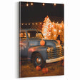 Capture the nostalgia of autumn with this charming fall wall decor, featuring a vintage blue truck adorned with pumpkins under warm festival lights. The blend of rustic textures, golden lights, and harvest-inspired elements creates a cozy and inviting ambiance. This autumn canvas art is perfect for those who love classic fall aesthetics, country charm, and seasonal warmth.