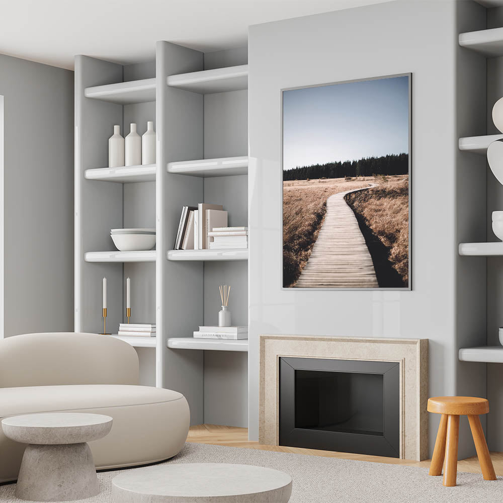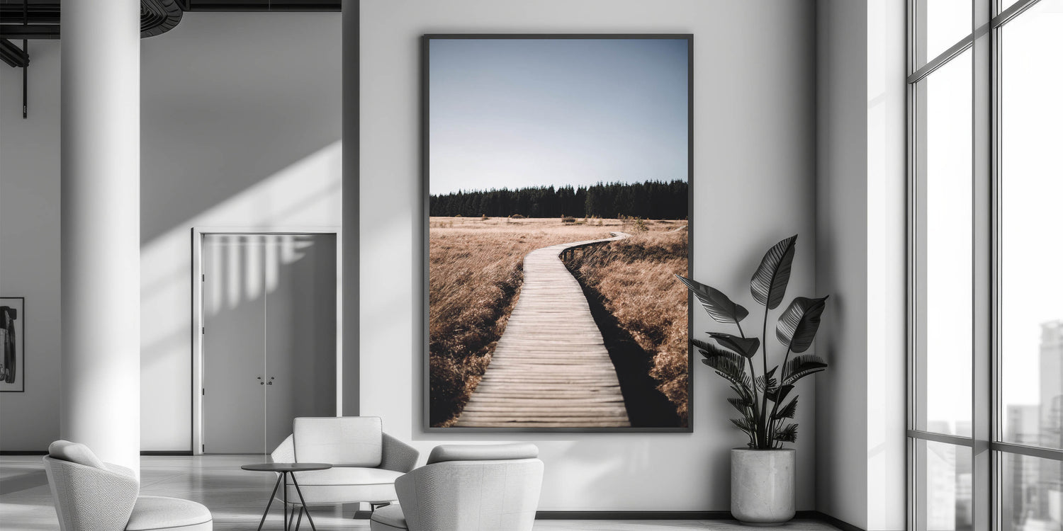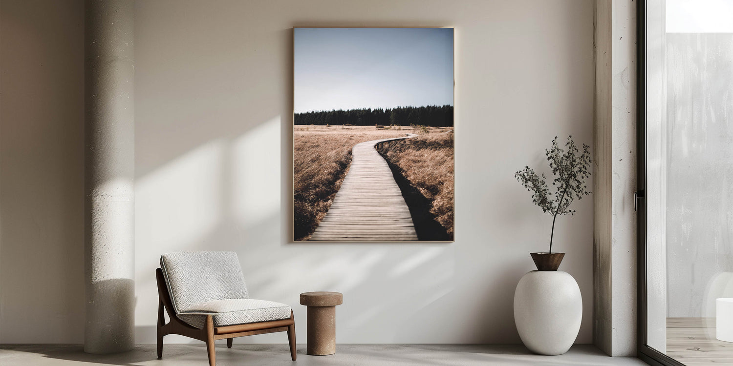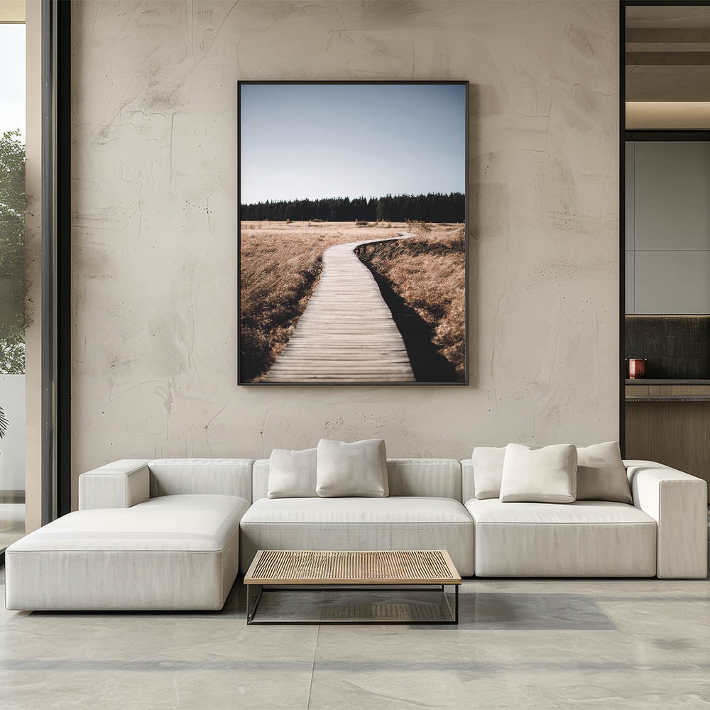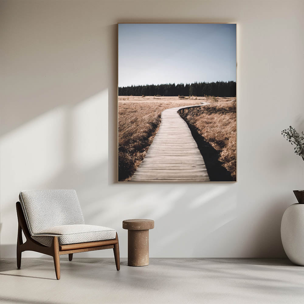 Invite tranquility into your space with this breathtaking Autumn Wall Art, capturing a winding wooden pathway through golden autumn fields. The soft natural tones and contrast of deep evergreen trees against a bright sky make this Fall Canvas Art a perfect blend of warmth and serenity. The winding boardwalk leads into the distance, symbolizing peace, reflection, and the beauty of the changing season.