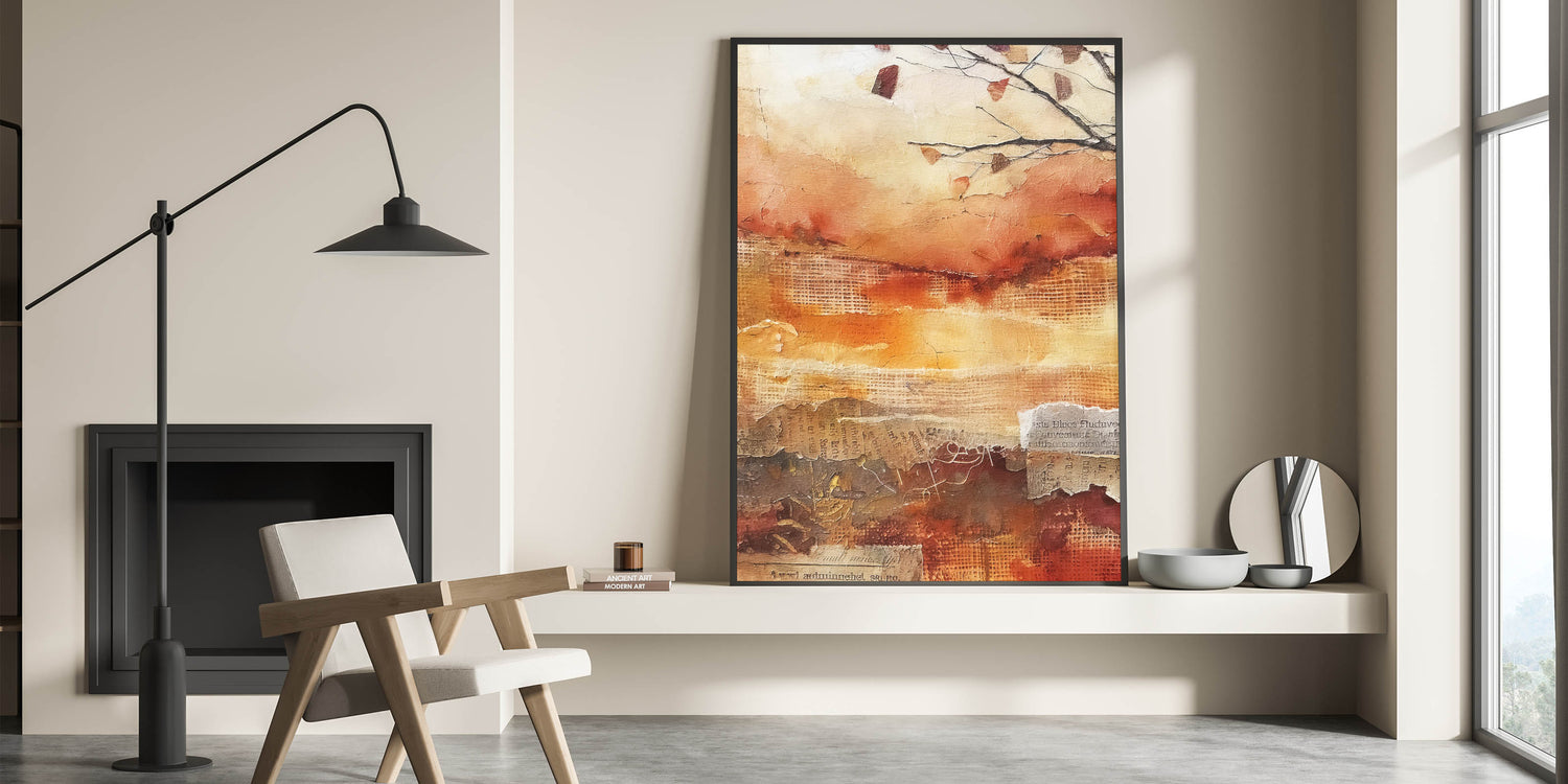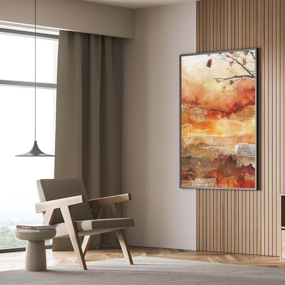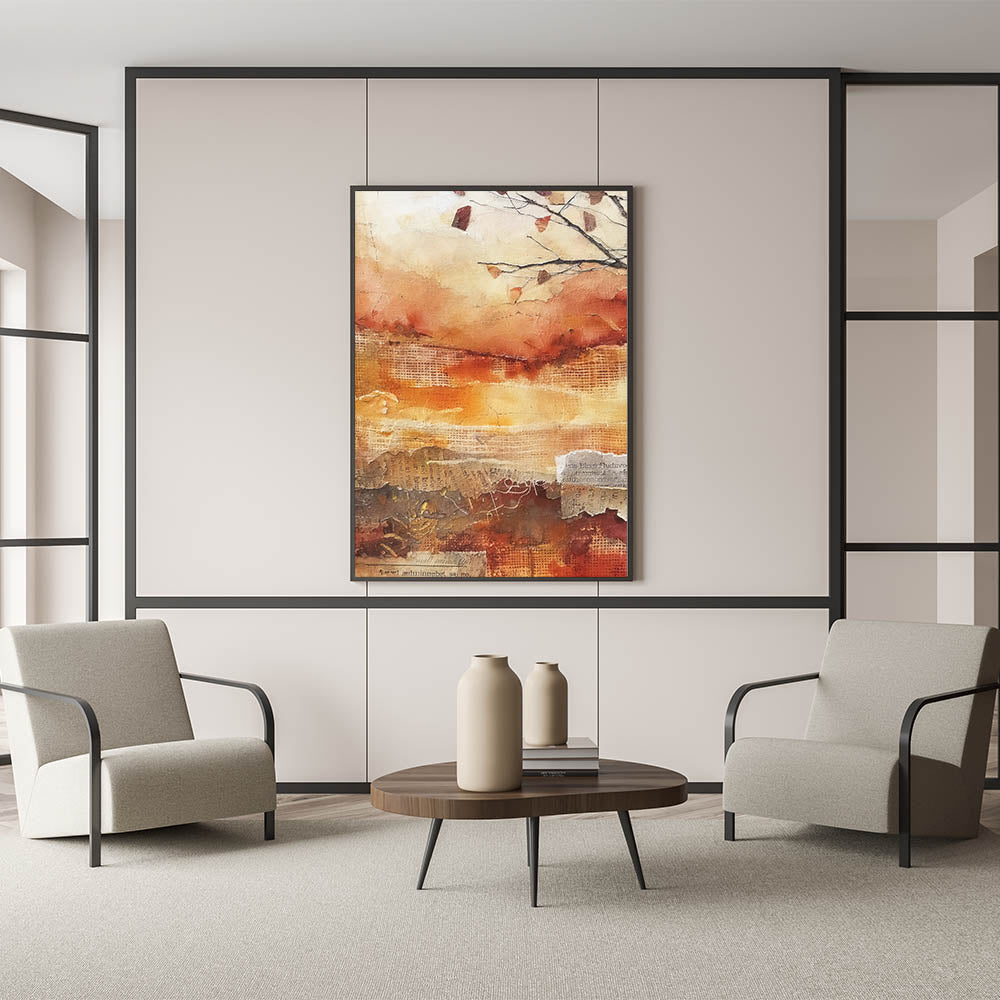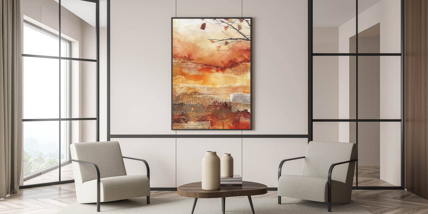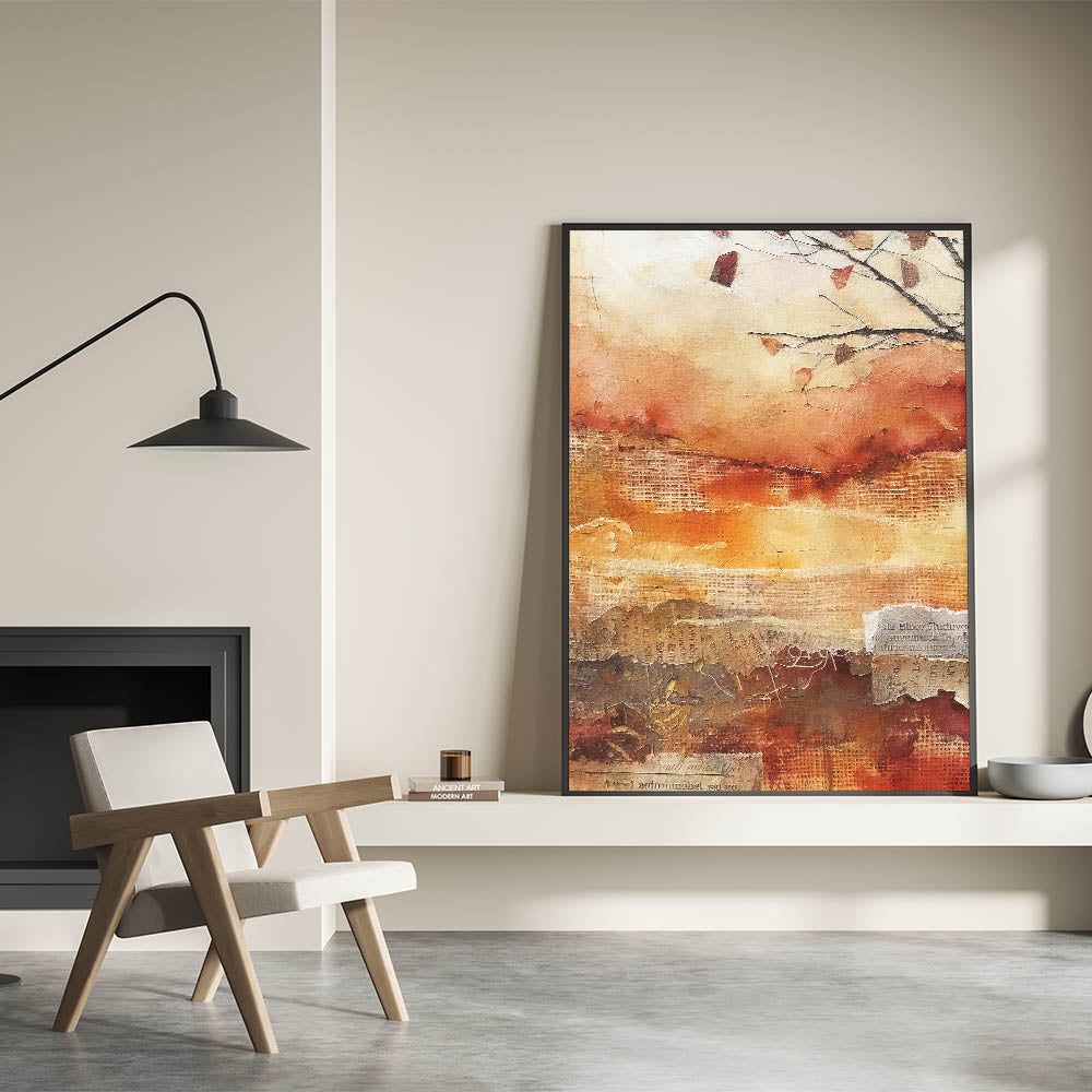 Capture the essence of a fall sunset with this stunning abstract autumn wall art. Featuring a vibrant palette of burnt orange, deep red, and warm beige, this piece evokes the fiery hues of the harvest season. The textured layers and organic patterns create a dynamic sense of movement, reminiscent of the changing leaves and the golden light of autumn evenings.