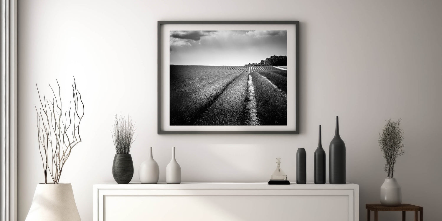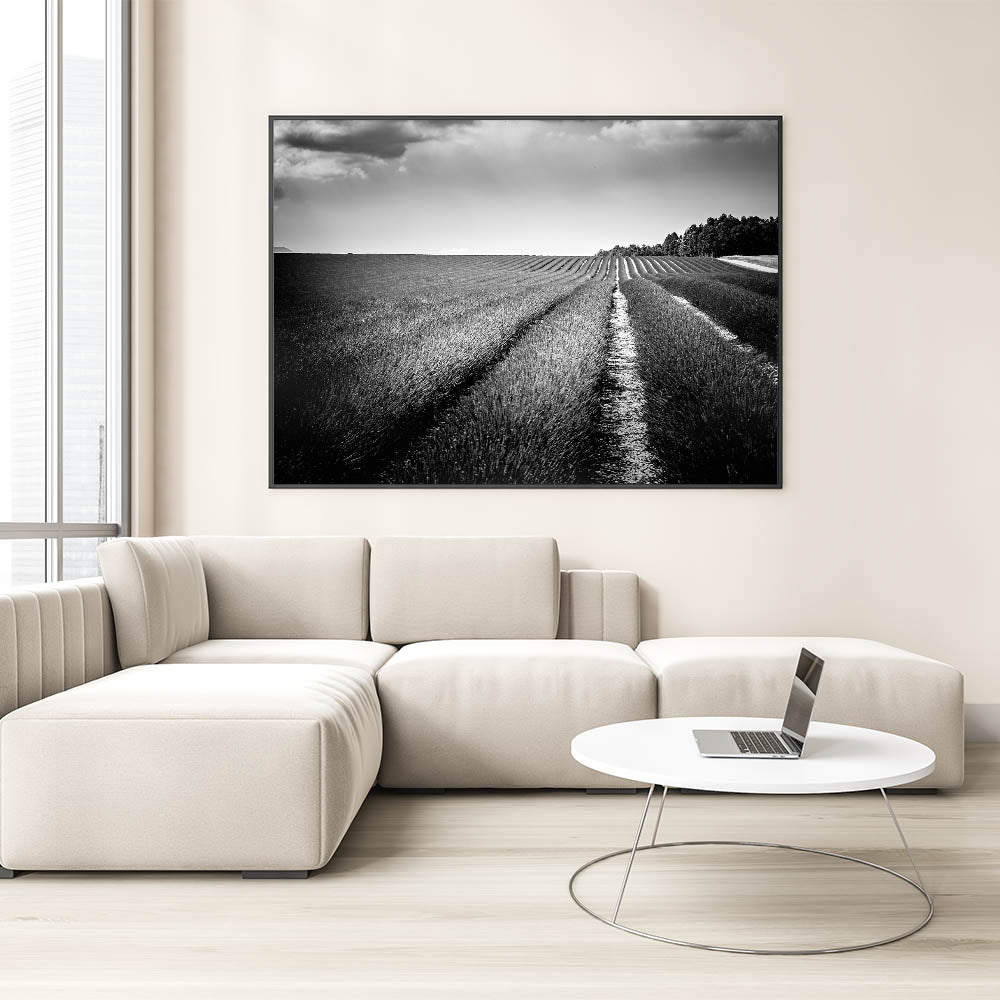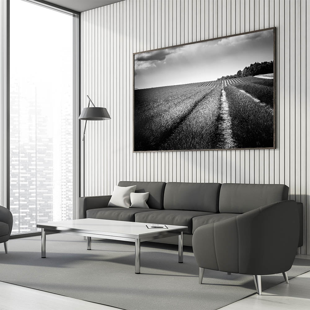This fields landscape art is perfect for those who appreciate the beauty of simplicity and the power of monochrome. Enhance your space with this elegant and timeless piece, and let the serene landscape bring a sense of calm and order to your surroundings.