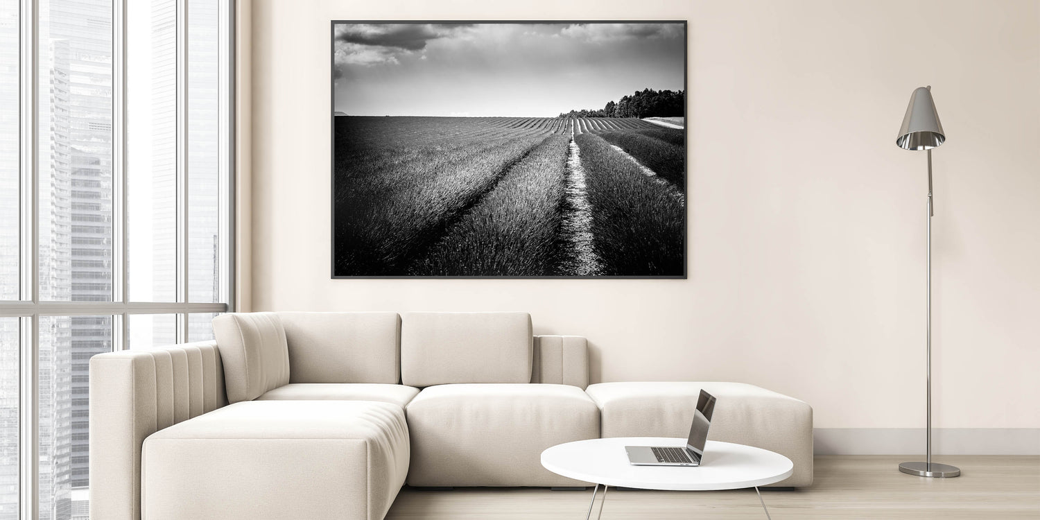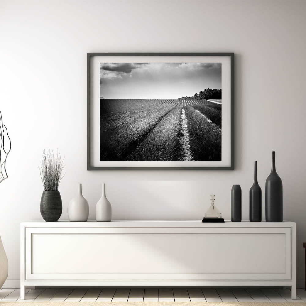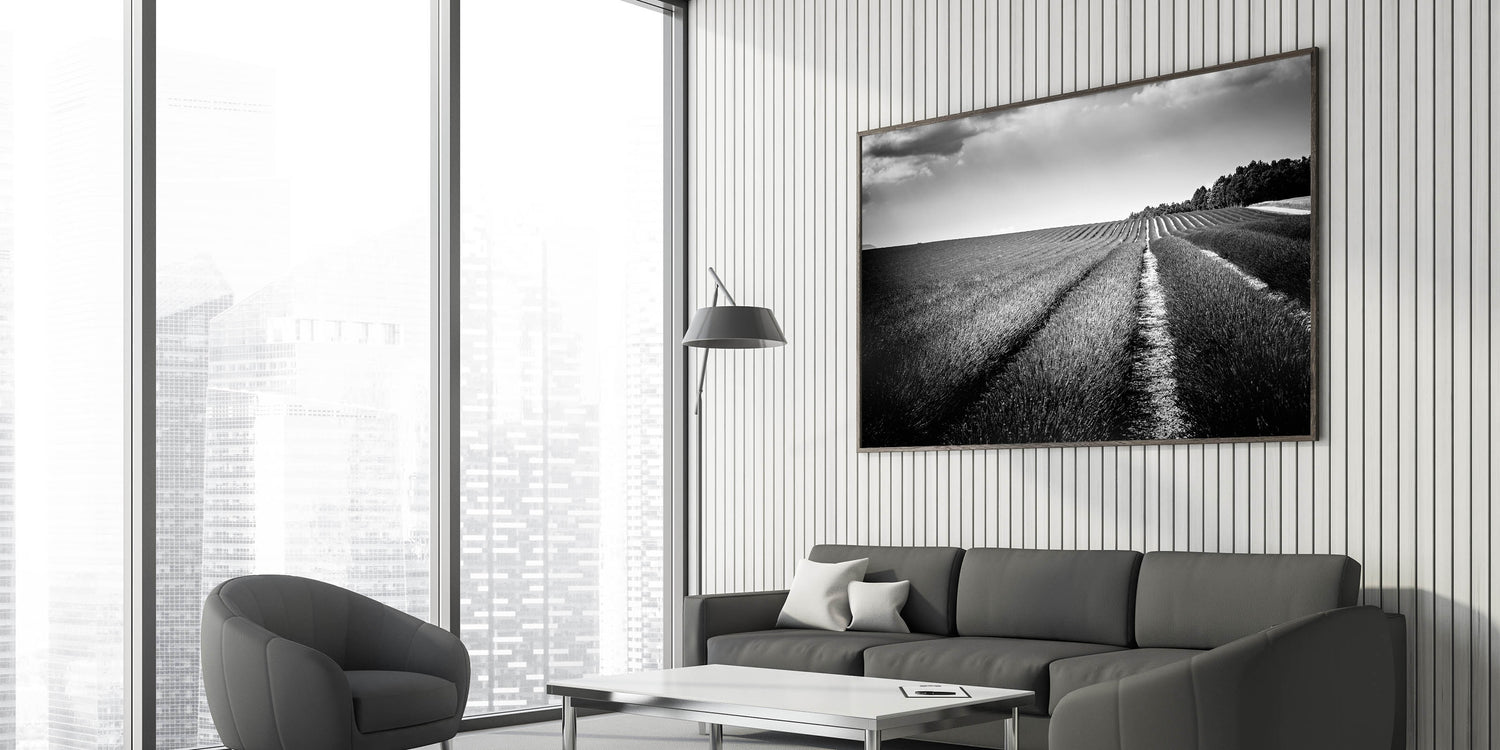 This fields landscape art is perfect for those who appreciate the beauty of simplicity and the power of monochrome. Enhance your space with this elegant and timeless piece, and let the serene landscape bring a sense of calm and order to your surroundings.