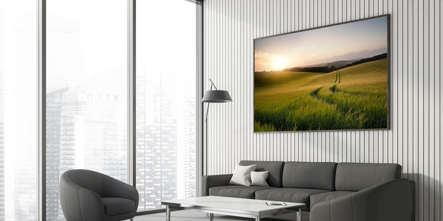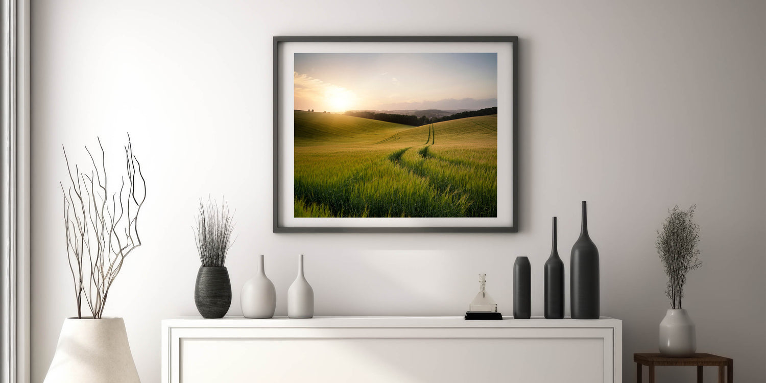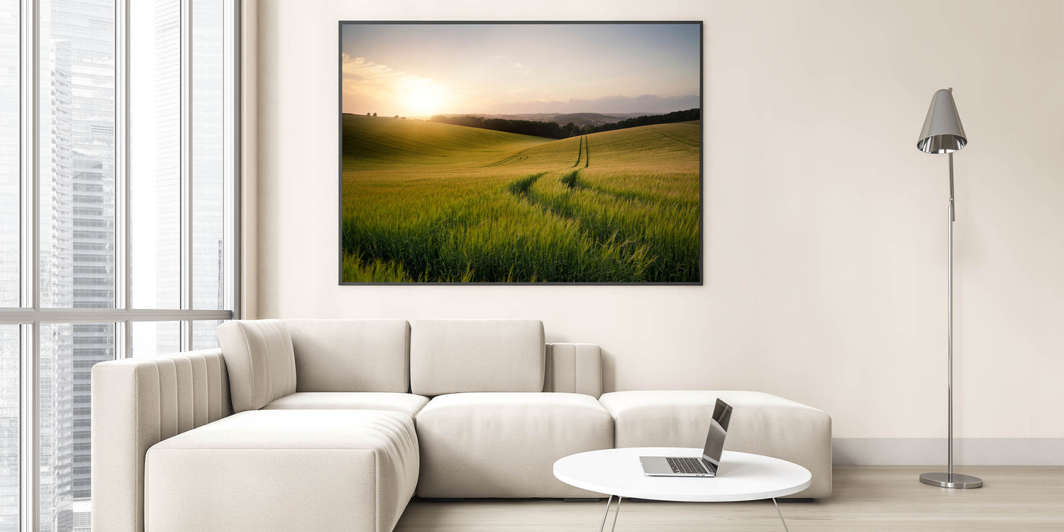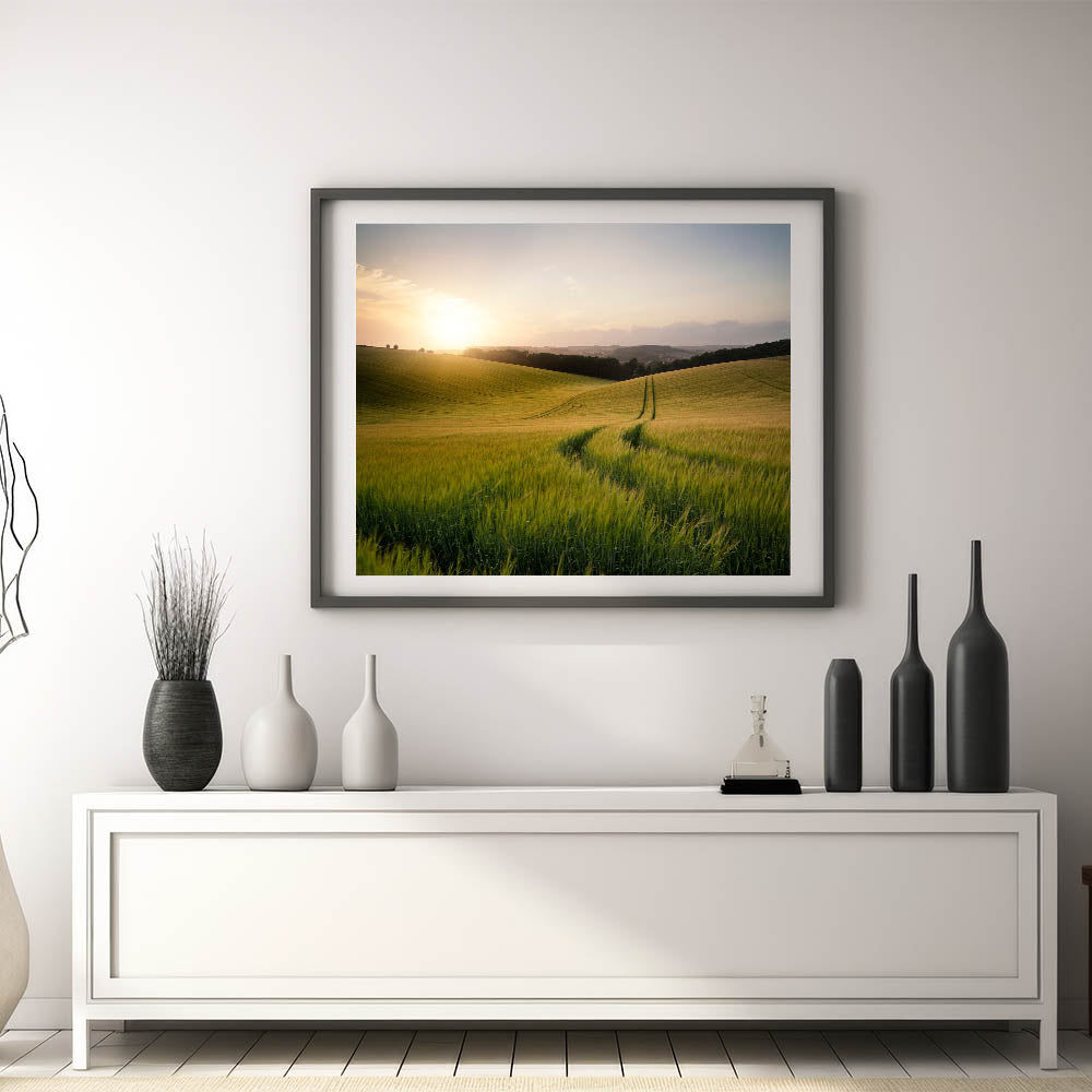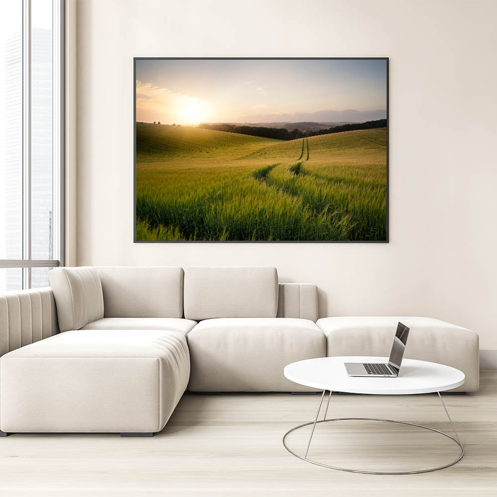 This golden wheat field print will bring the soothing presence of a sunrise over the countryside into your home, offering a moment of peace and quiet reflection in any space.
