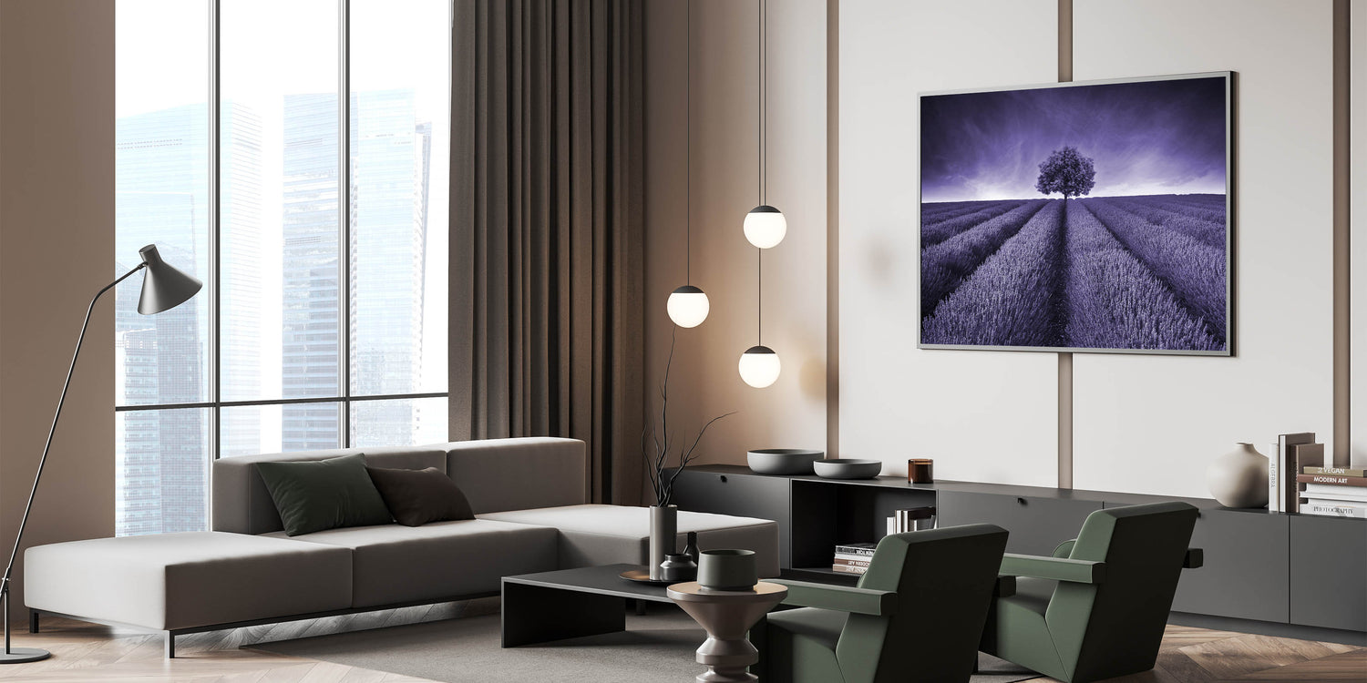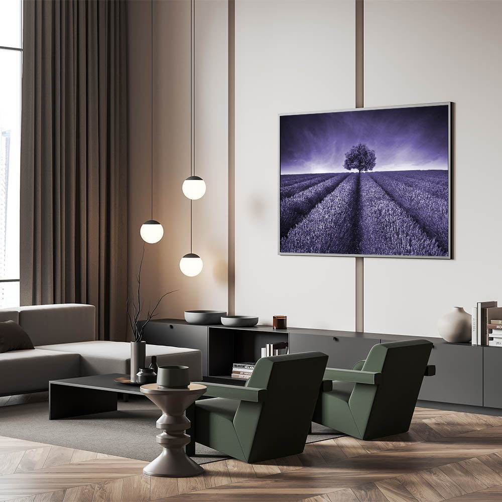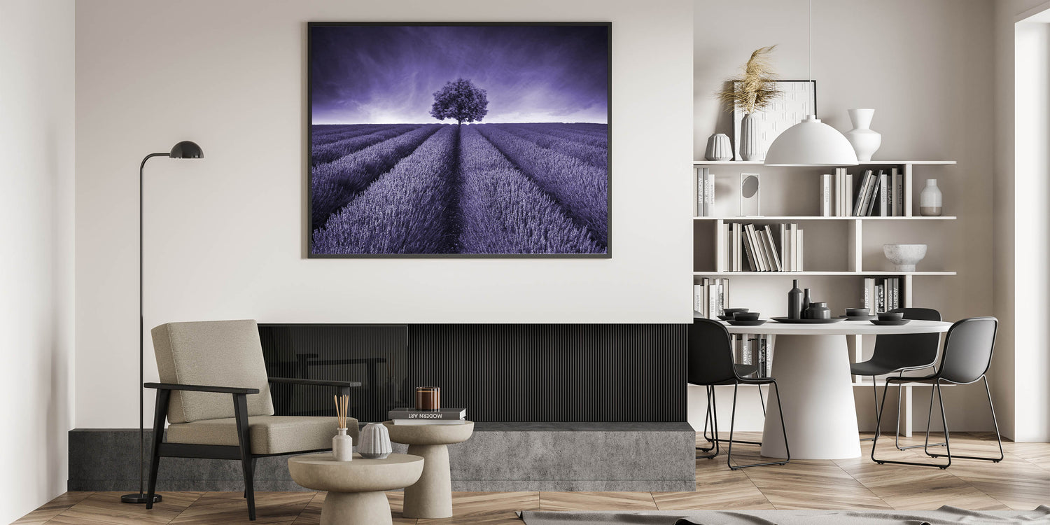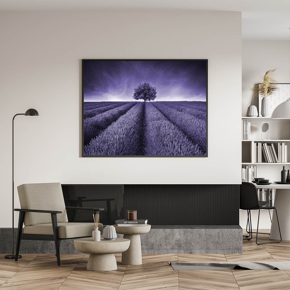 Elevate your space with this captivating Fields Landscape Acrylic Print, featuring a monochromatic lavender field that stretches towards a lone tree under a striking purple sky. This artwork's powerful simplicity and bold color scheme create a mesmerizing visual experience, making it an ideal centerpiece for modern and minimalist interiors.