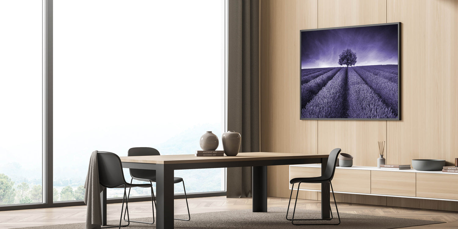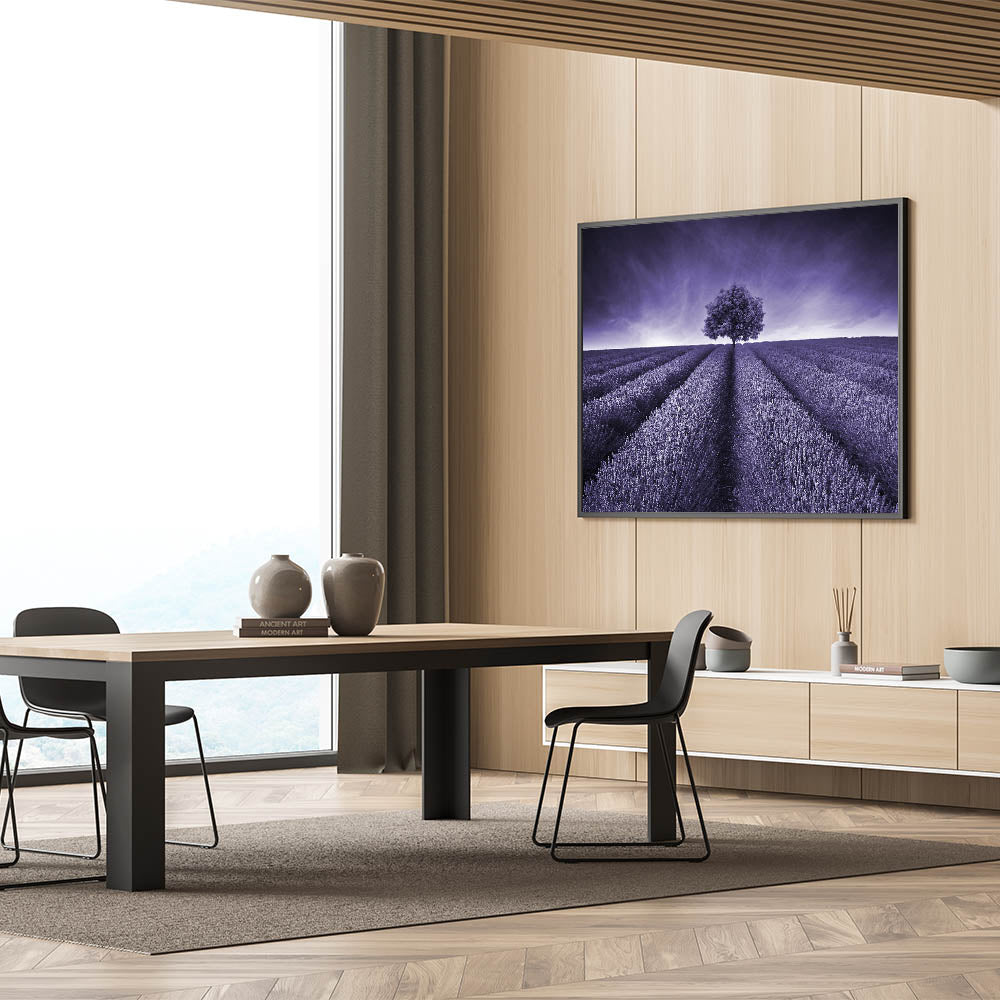 This monochrome lavender field landscape is perfect for those who appreciate bold, minimalist design. Whether you're looking to make a statement or simply add a touch of elegance to your decor, this piece is sure to stand out and become a focal point in any room.