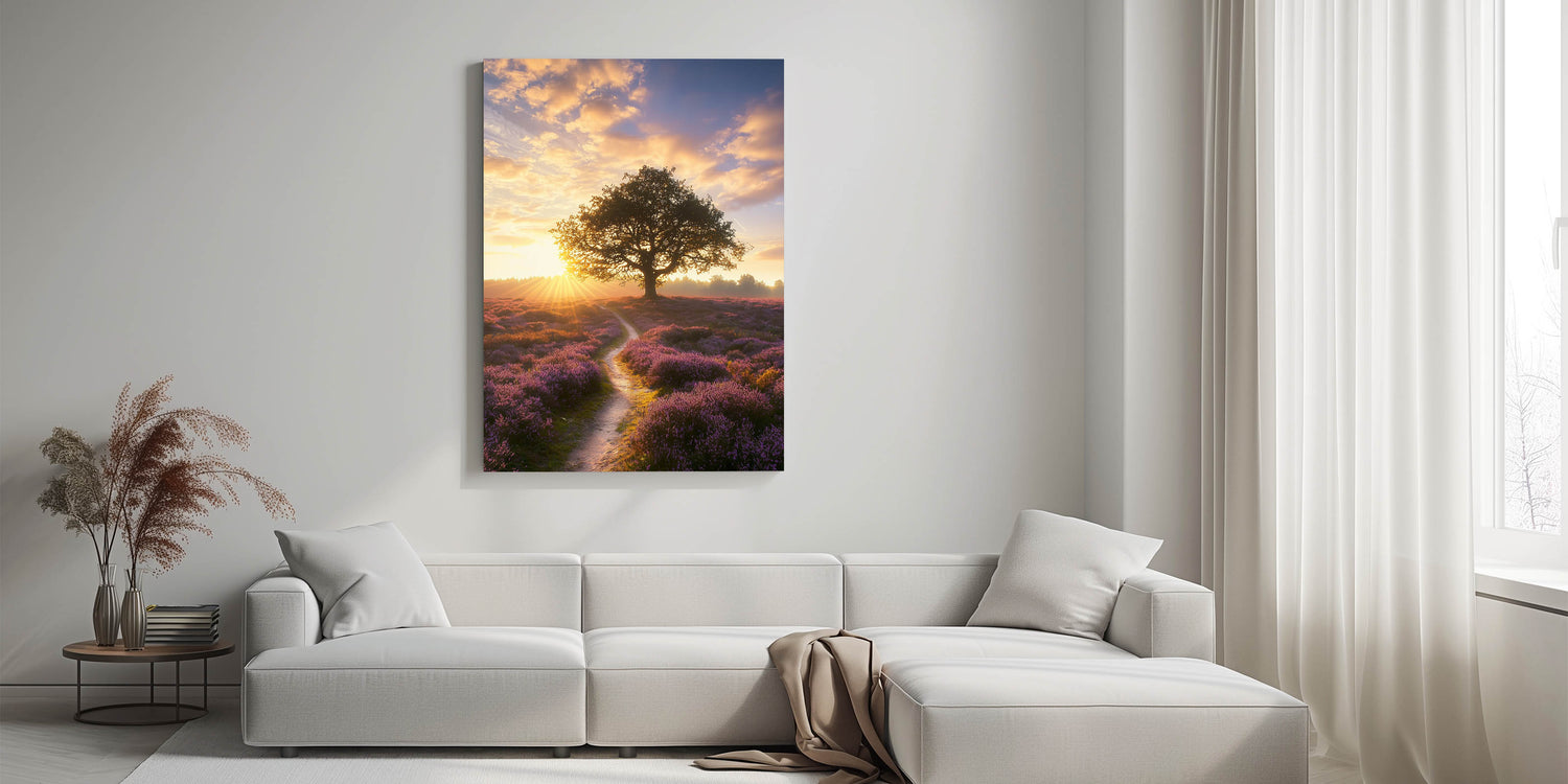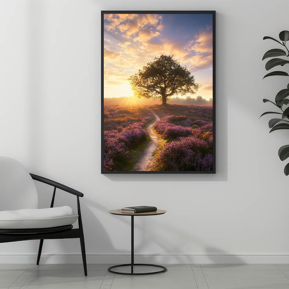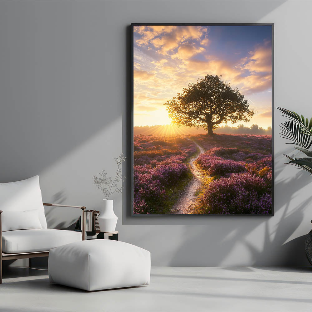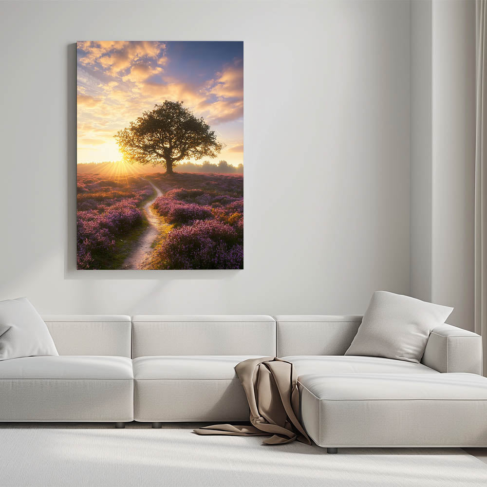Bring the tranquil beauty of nature into your home with this Fields Panorama Wall Decor, featuring a breathtaking lavender field under a golden sunrise. This serene artwork captures the essence of countryside charm, creating a warm and inviting atmosphere in any room. The central tree adds depth and focus to this scenic masterpiece, perfect for those who appreciate natural elegance.