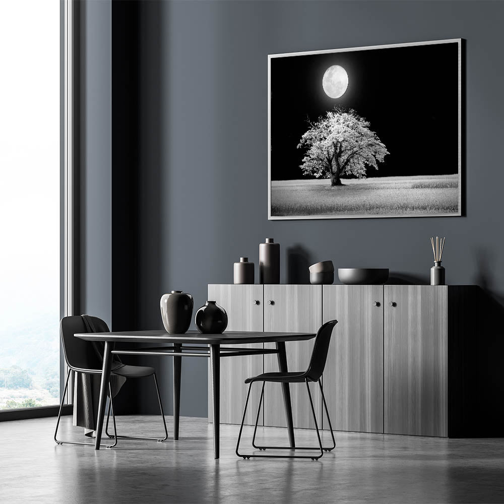 Add a touch of mystery and elegance to your space with this Night Tree Wall Art. This captivating monochrome artwork features a solitary tree standing in a quiet field under the glow of a full moon. The stark contrast between the dark sky and the illuminated tree creates a mesmerizing and serene atmosphere, making this piece a perfect focal point for modern and minimalist interiors.