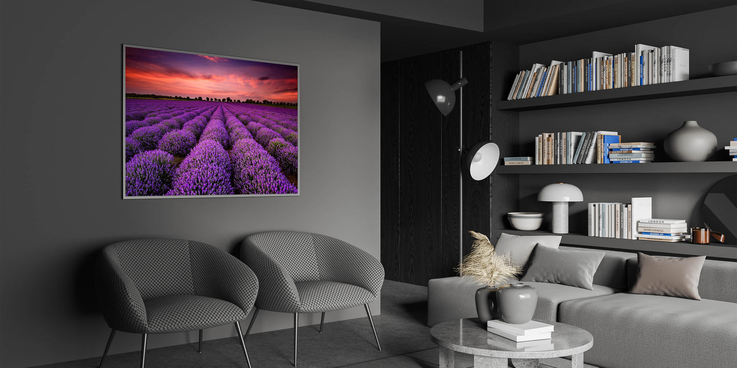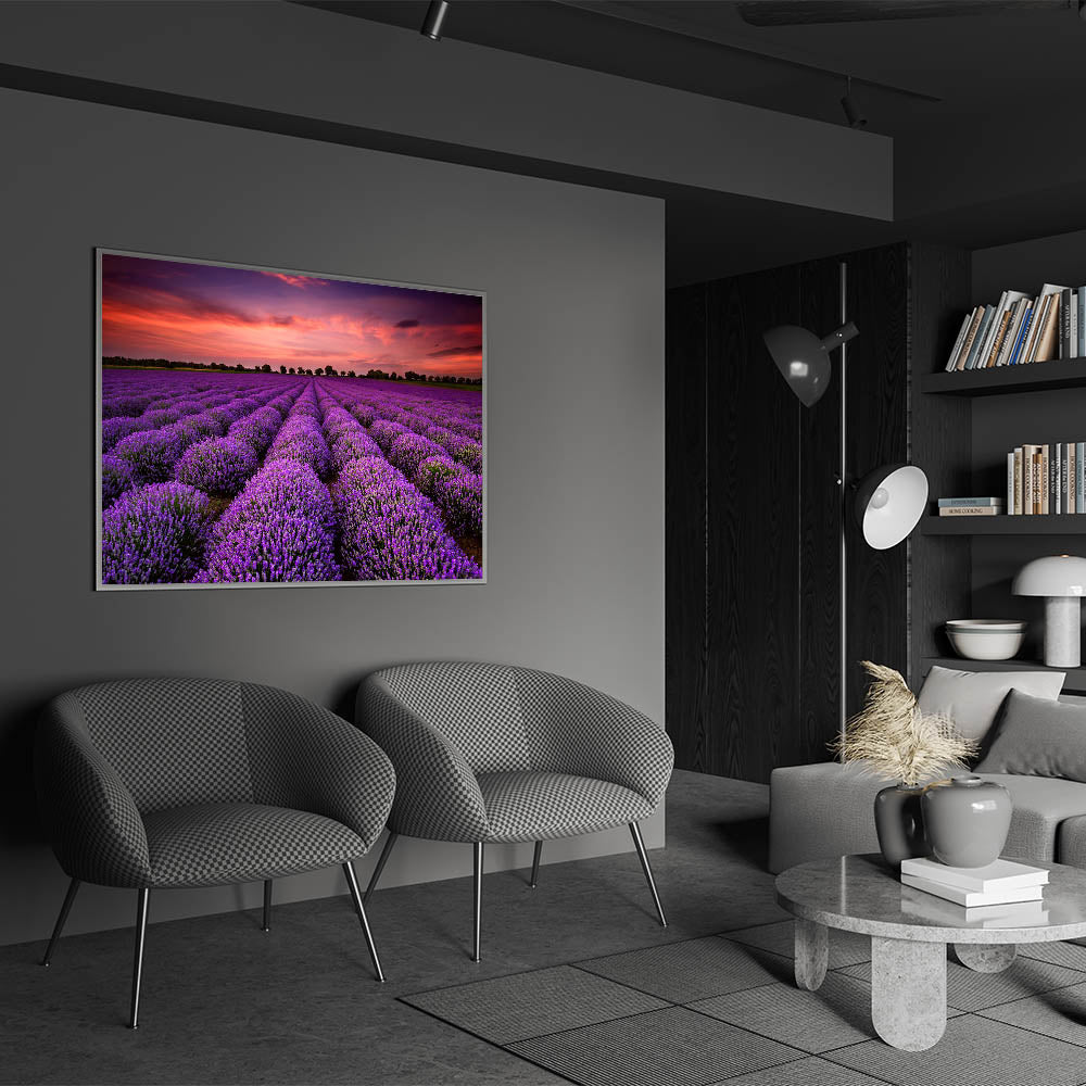 Bring the serenity of a lavender field at sunset into your home with this stunning print, designed to create a peaceful and inviting atmosphere.