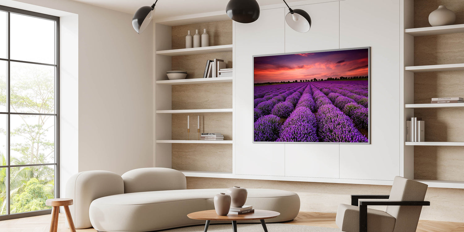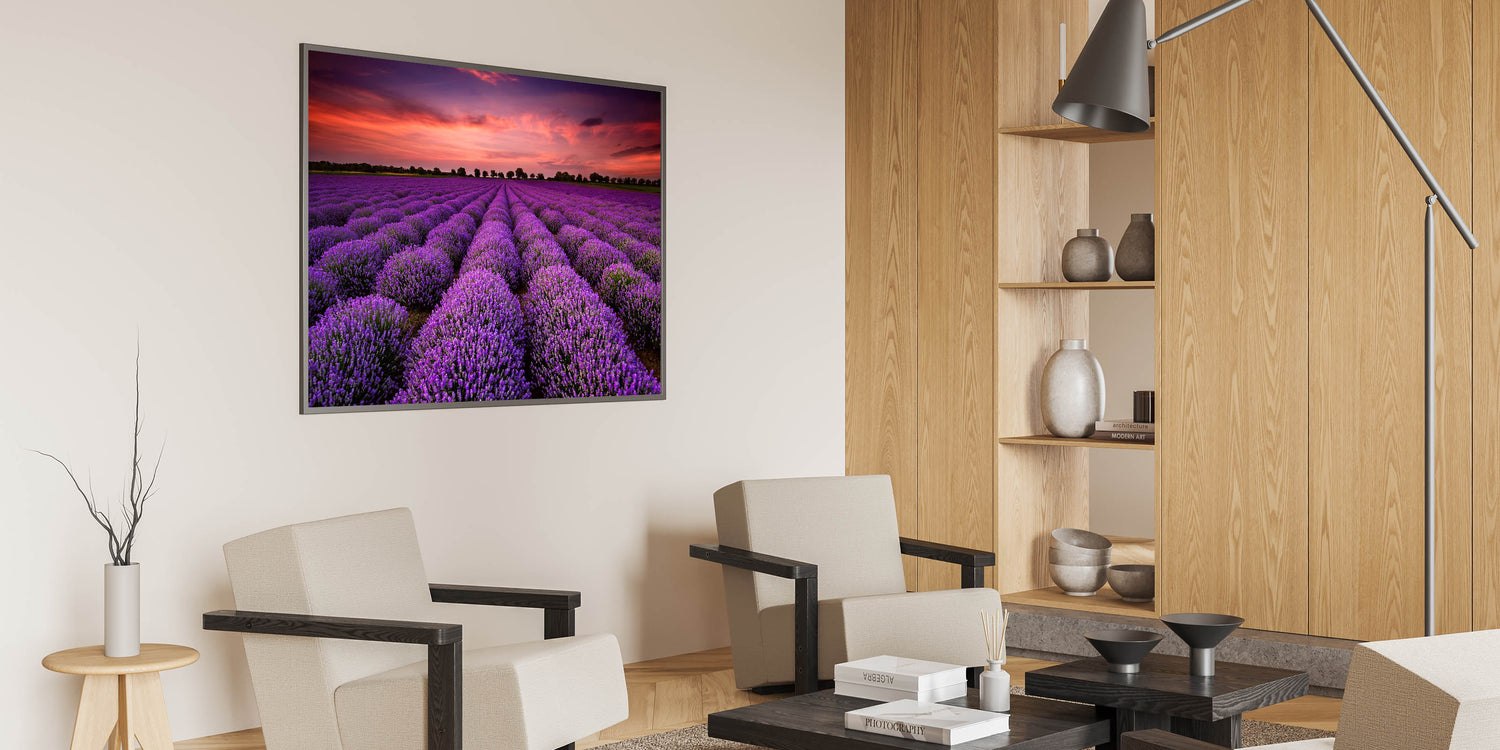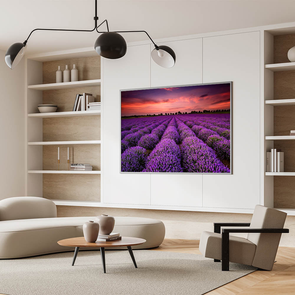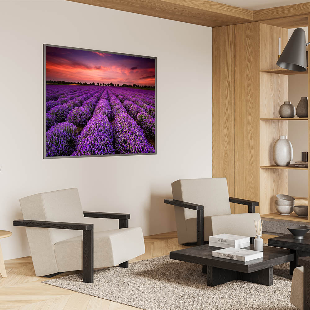 • Rich and Vibrant Colors: High-definition print that captures the vivid purples of the lavender and the striking sunset sky.