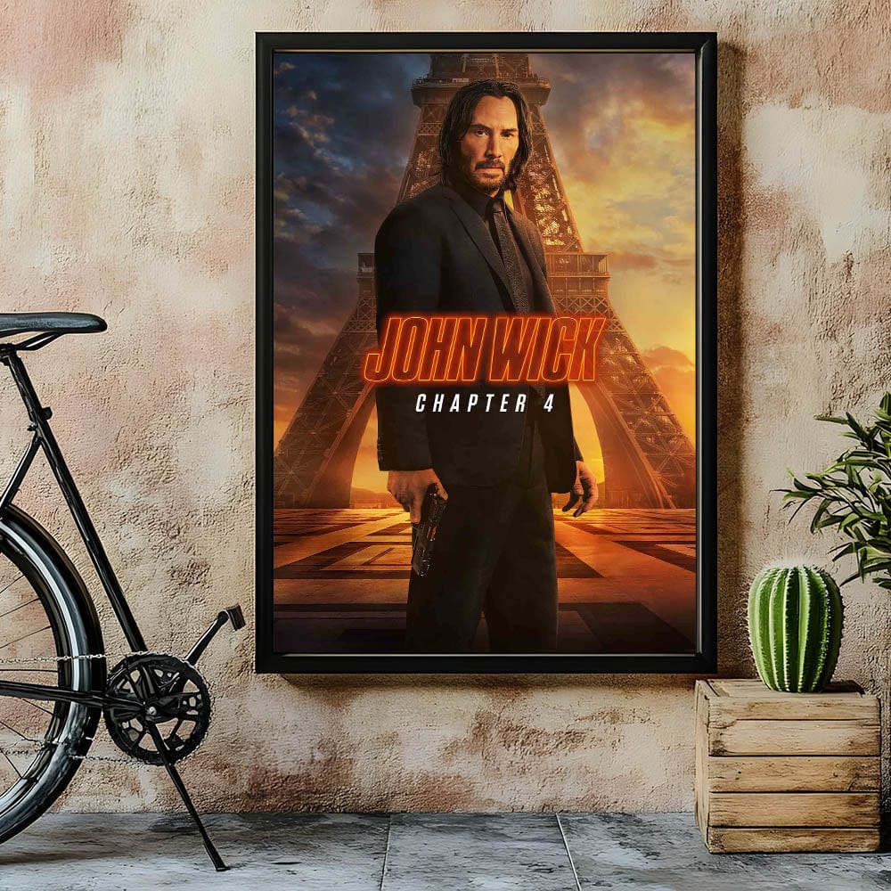 Embrace the action and intensity of an iconic 2020s film with this 2020s vintage movie poster featuring John Wick: Chapter 4. This retro film art print showcases the legendary assassin in a dramatic setting, with the Eiffel Tower in the background and a fiery sunset casting a cinematic glow. Designed with authentic vintage style, this limited edition cinema art is a must-have for action film lovers and movie memorabilia collectors.