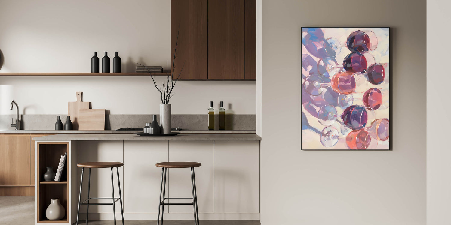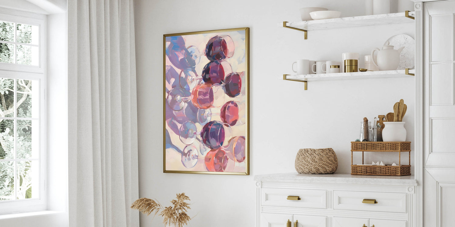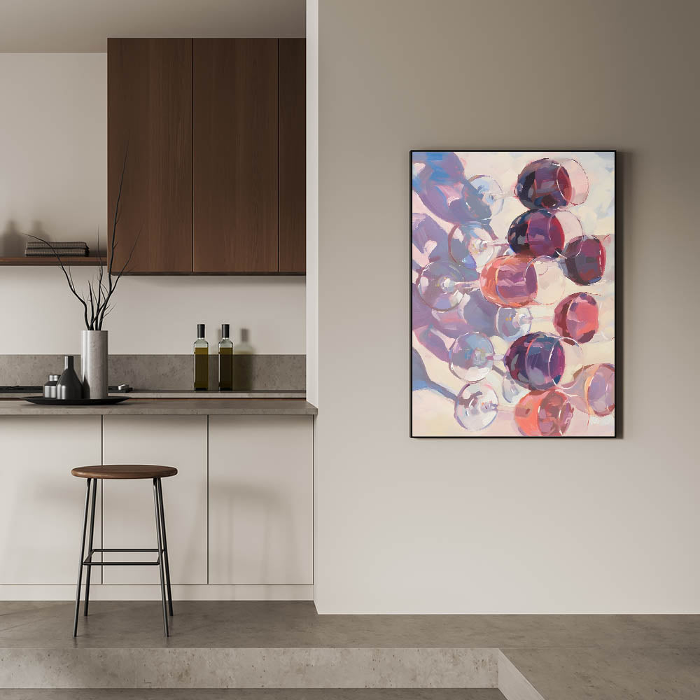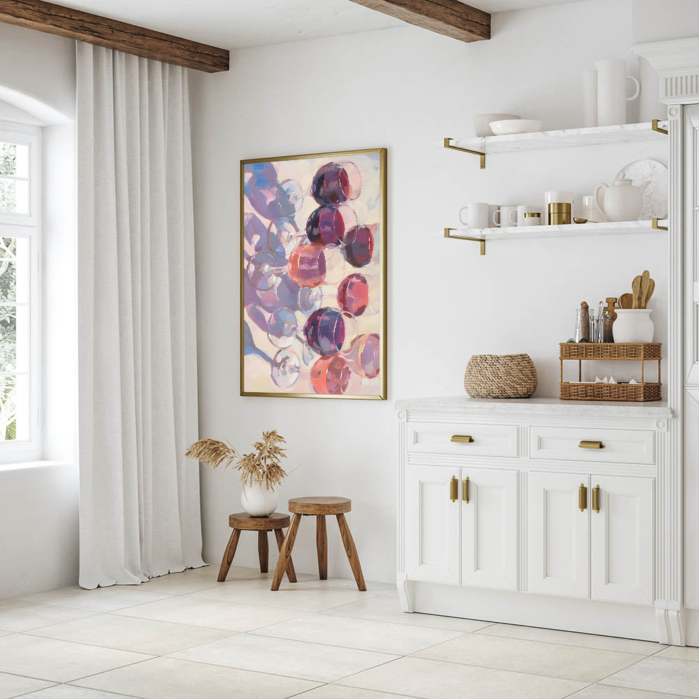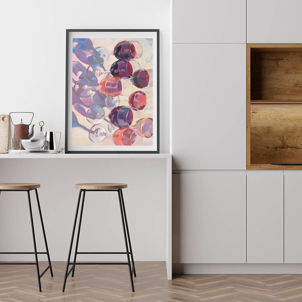Celebrate the beauty of fine wine with this stunning abstract Fruits Wall Art, featuring a mesmerizing arrangement of wine glasses in rich shades of burgundy, plum, and deep red. This Fruit Art Print captures the elegance of a wine-filled evening, making it a perfect addition to Kitchen Fruit Decor, wine cellars, bars, or contemporary dining spaces. The artistic brushstrokes and fluid reflections bring a sophisticated and modern touch to any interior.