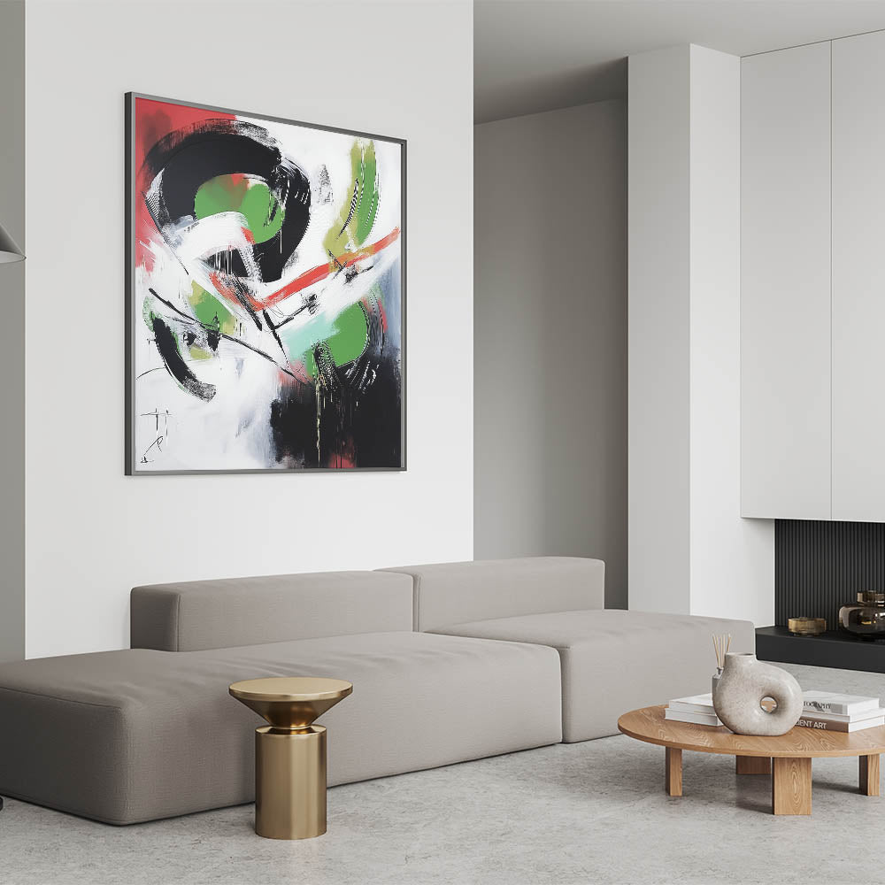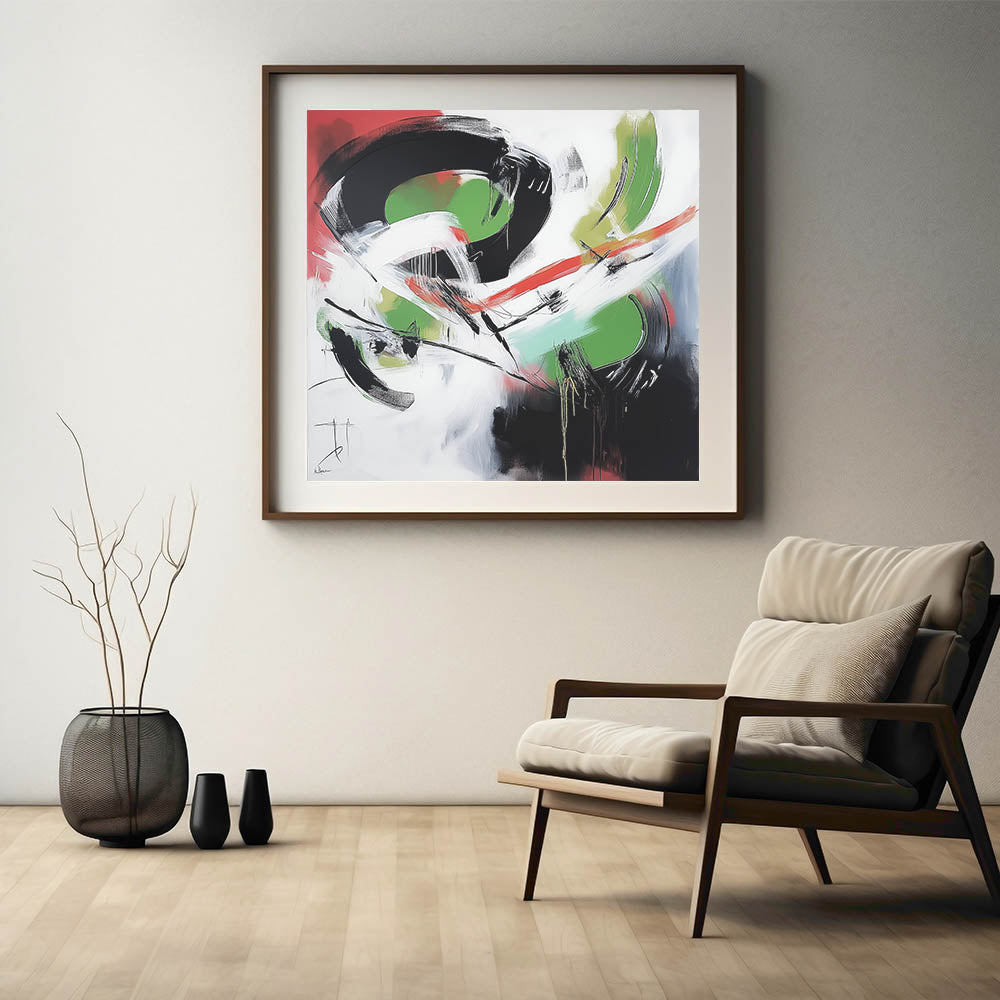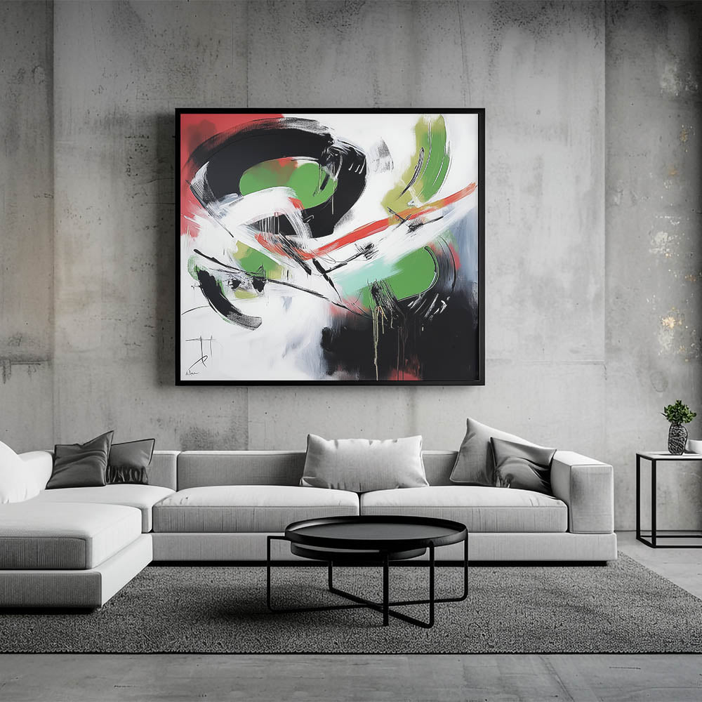 Infuse your space with bold energy and modern flair through this striking contemporary abstract canvas. Featuring a dynamic mix of black, vibrant green, white, and crimson red, this expressive design exudes motion and contrast. Every brushstroke and curve brings rhythm and raw emotion, making it a powerful centerpiece in any contemporary interior.