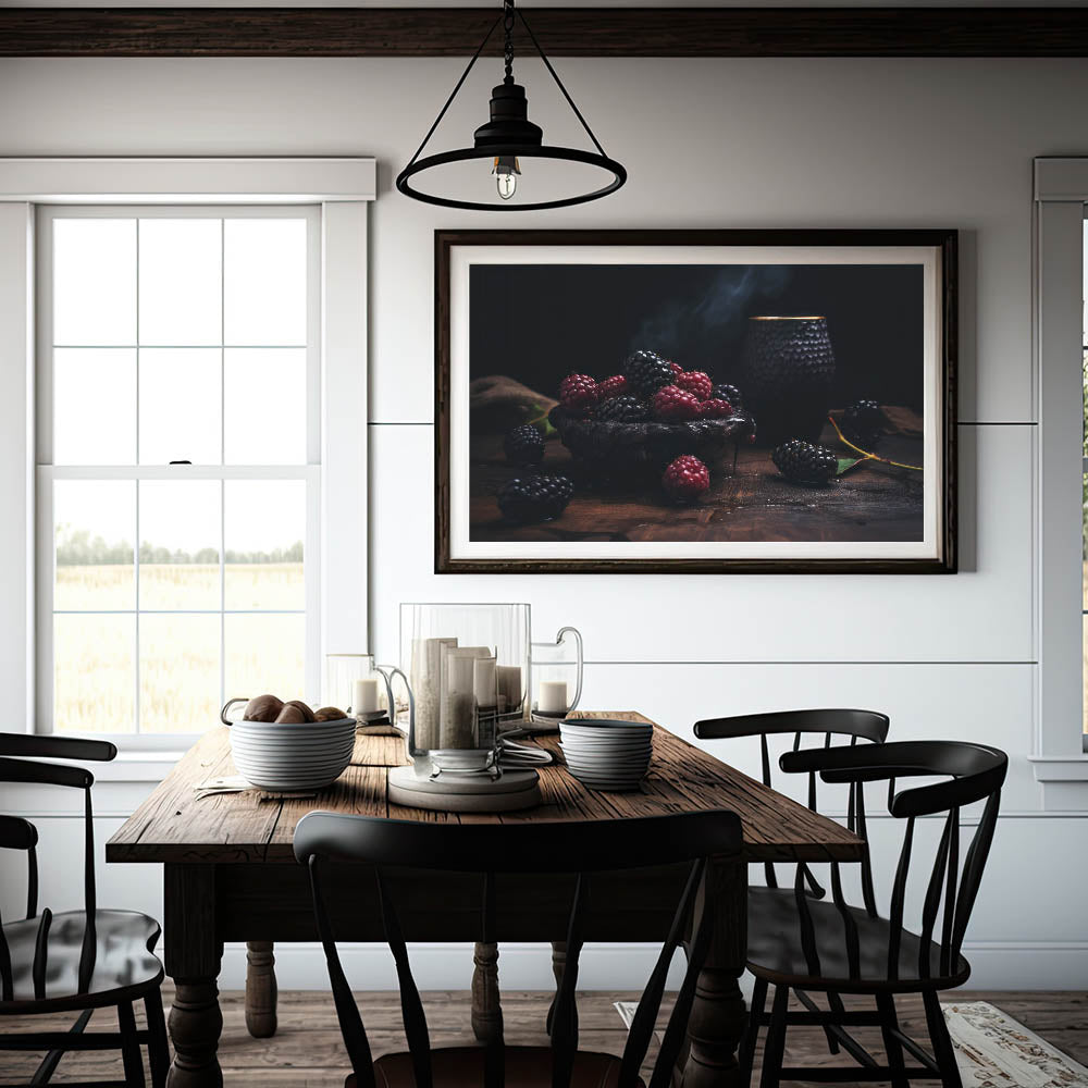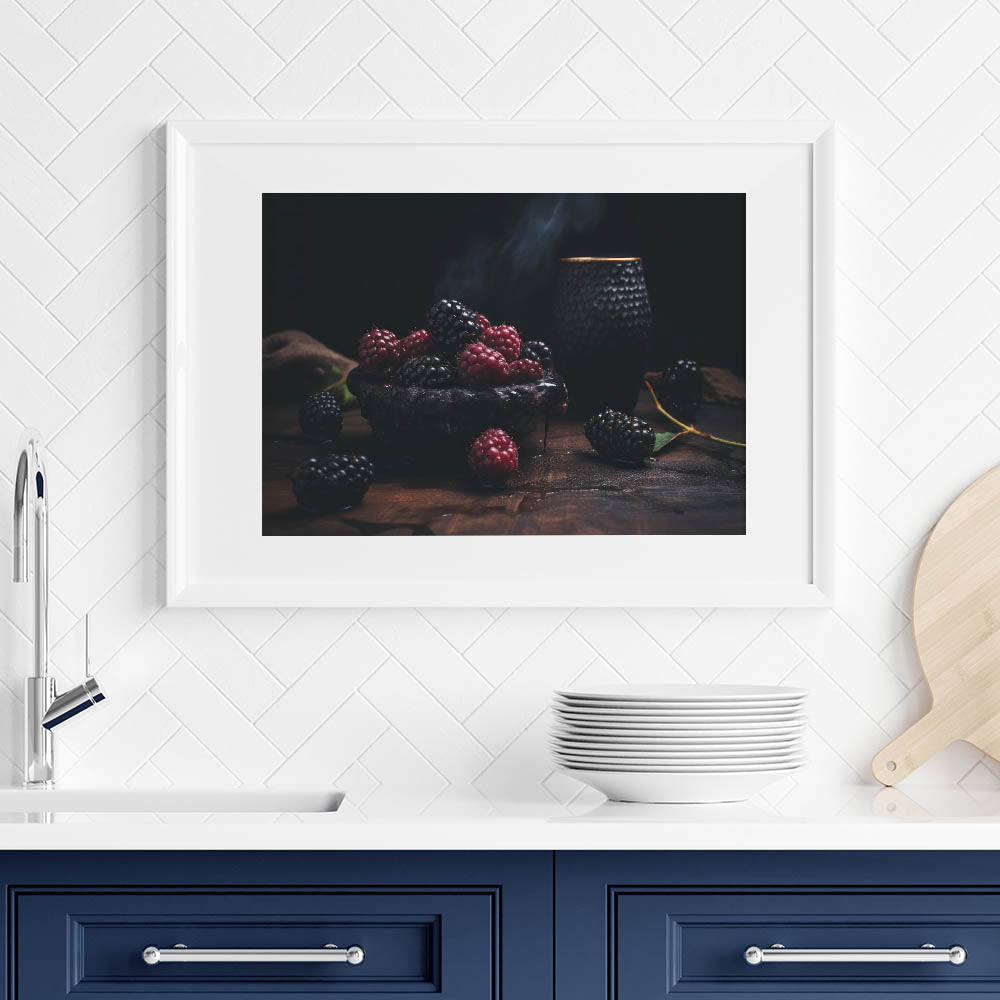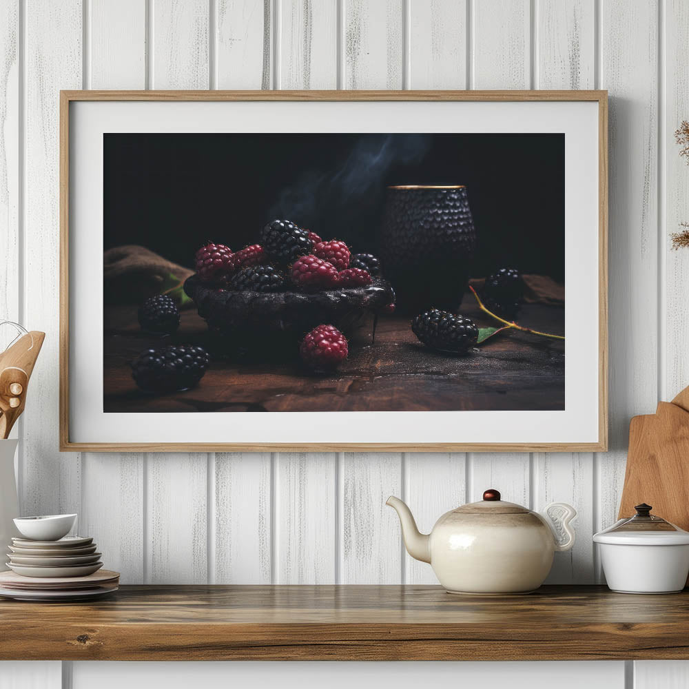 Transform your kitchen with this stunning fruit canvas art, featuring a dramatic still-life composition of blackberries and raspberries. The deep black and rich burgundy tones create a visually striking contrast, enhanced by moody lighting and rustic textures. The glossy, fresh berries against the dark wooden backdrop make this fruit photography art a perfect choice for kitchen fruit decor, adding elegance and a gourmet touch to your space.