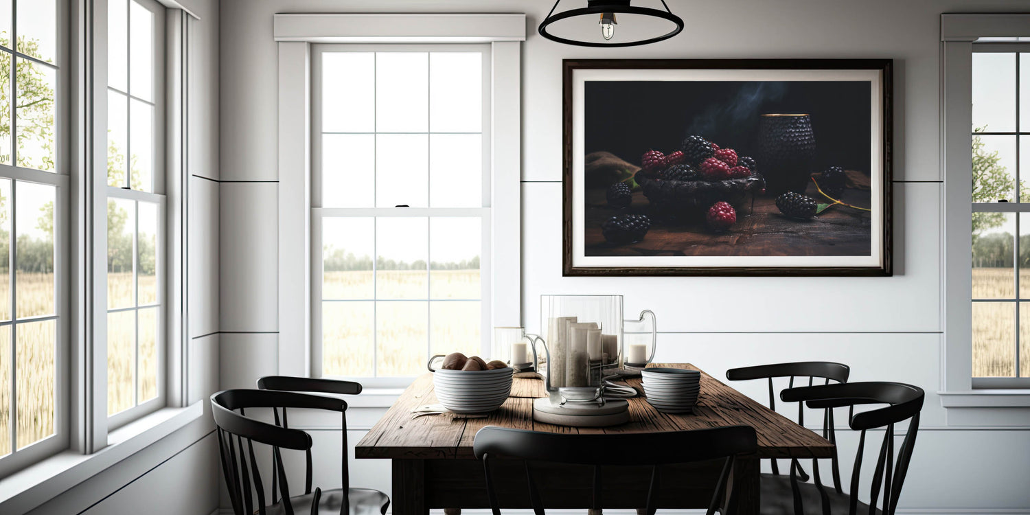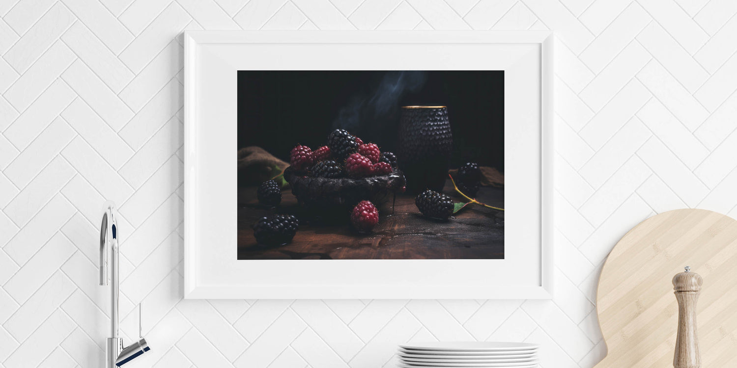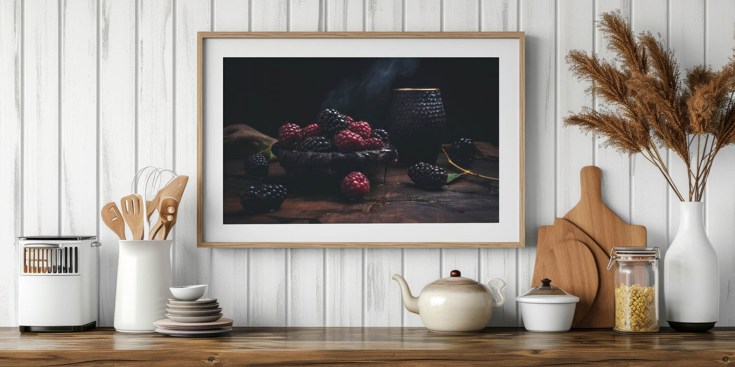 Transform your kitchen with this stunning fruit canvas art, featuring a dramatic still-life composition of blackberries and raspberries. The deep black and rich burgundy tones create a visually striking contrast, enhanced by moody lighting and rustic textures. The glossy, fresh berries against the dark wooden backdrop make this fruit photography art a perfect choice for kitchen fruit decor, adding elegance and a gourmet touch to your space.